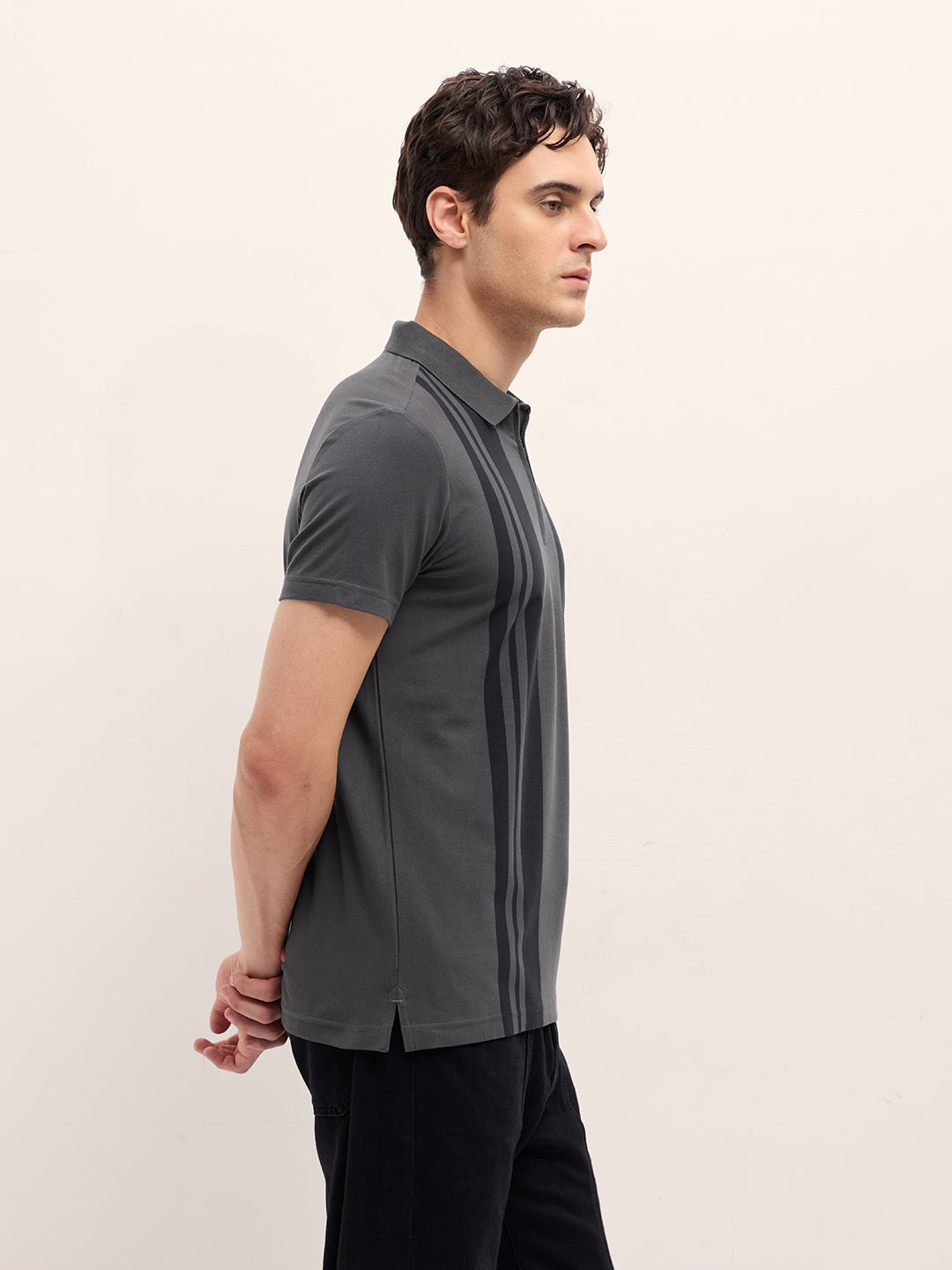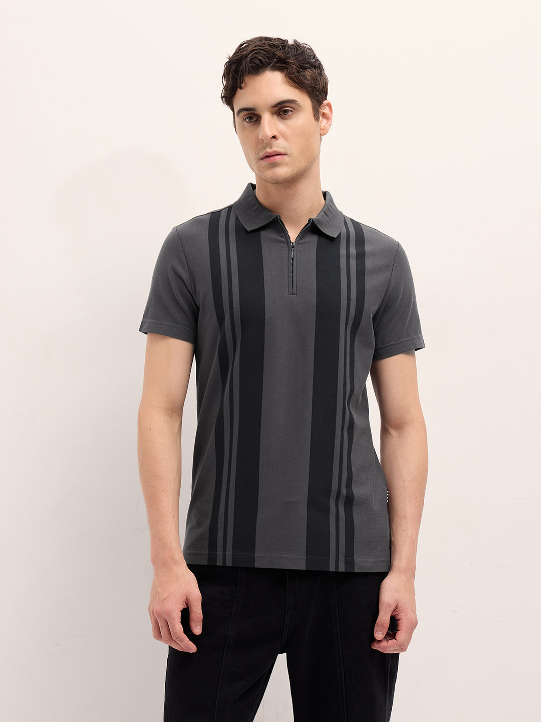 Grey Stripe Design Regular Fit Polo with Zipper Placket
