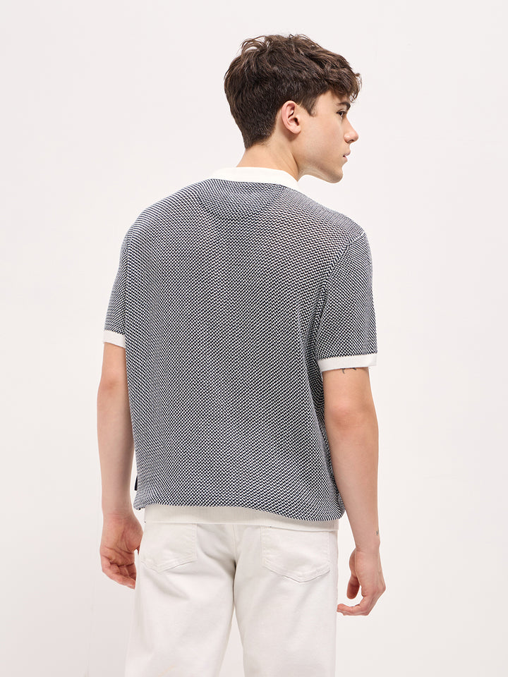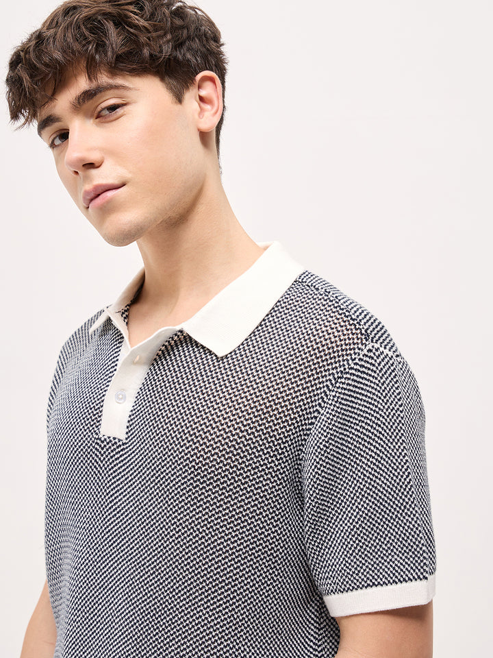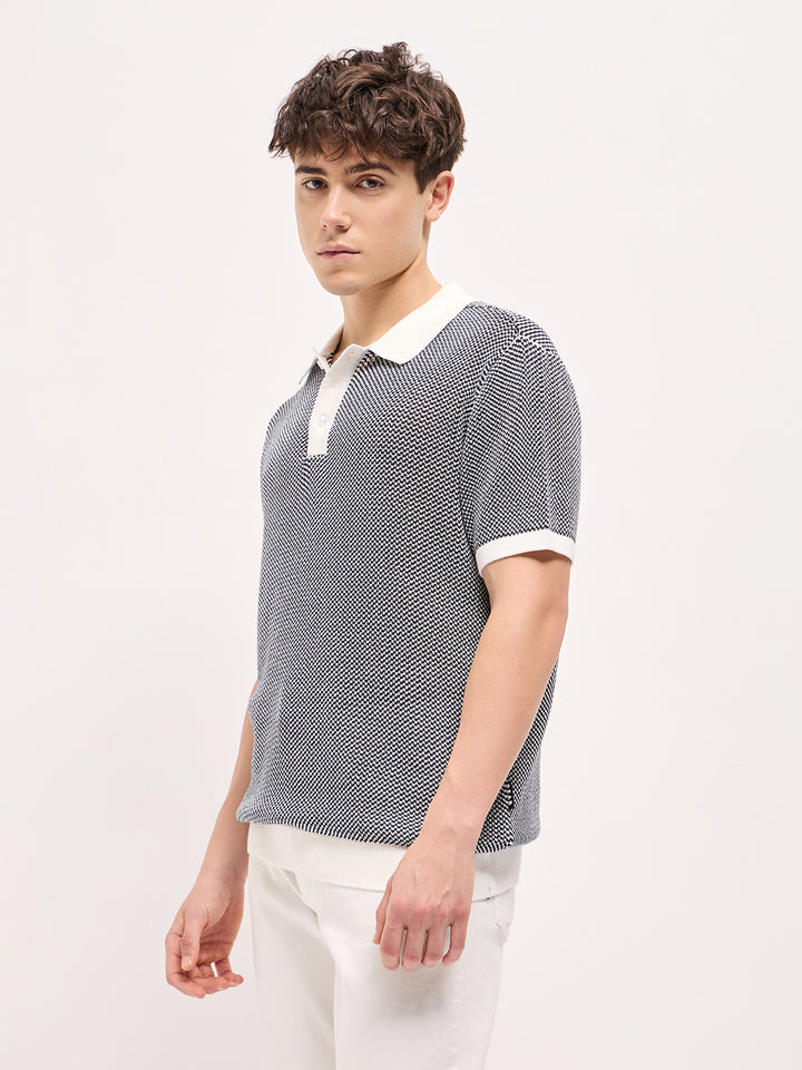 Shop Blue Textured Knit Regular Fit Polo T-shirt with Contrast Collar Online.