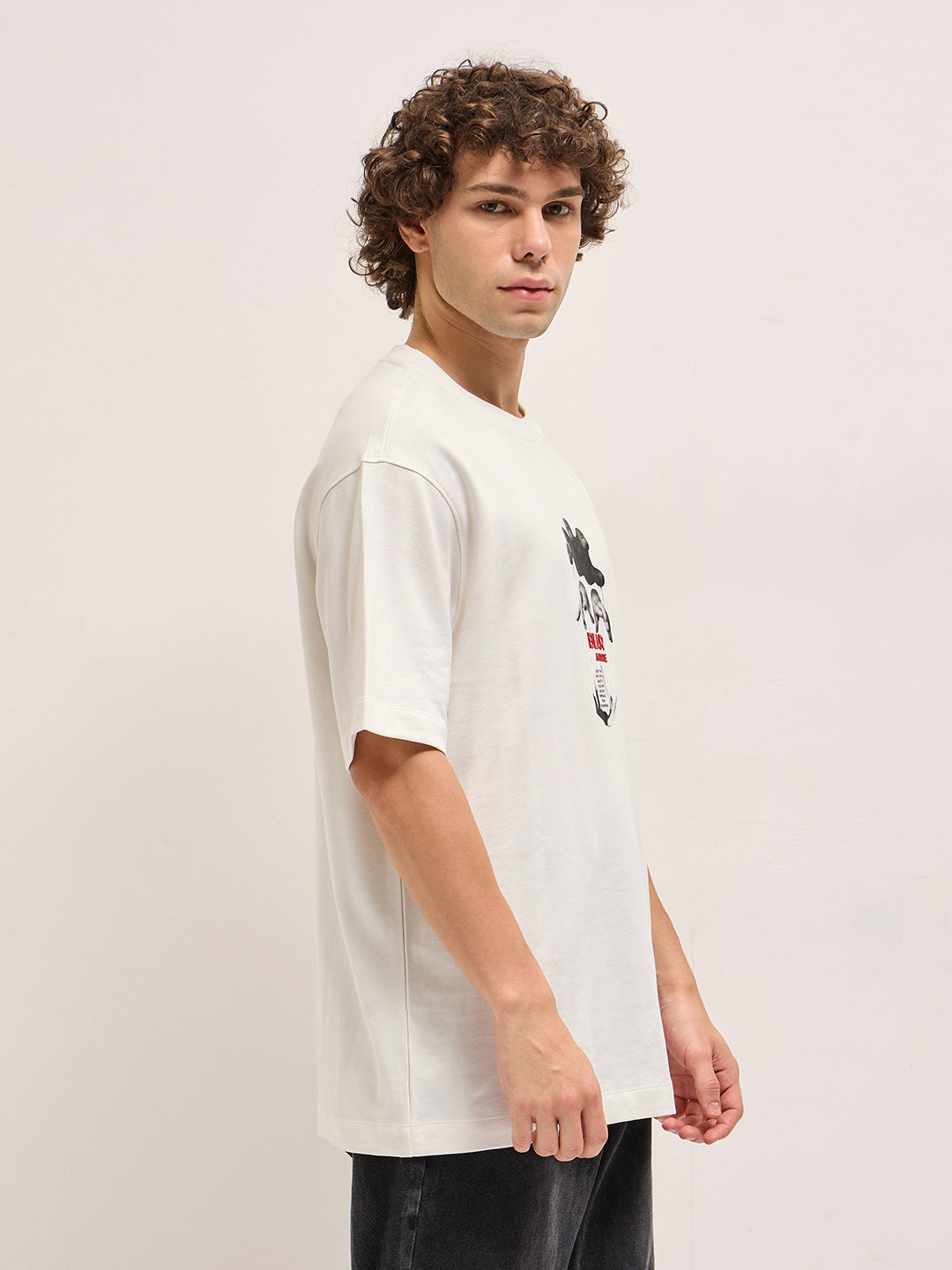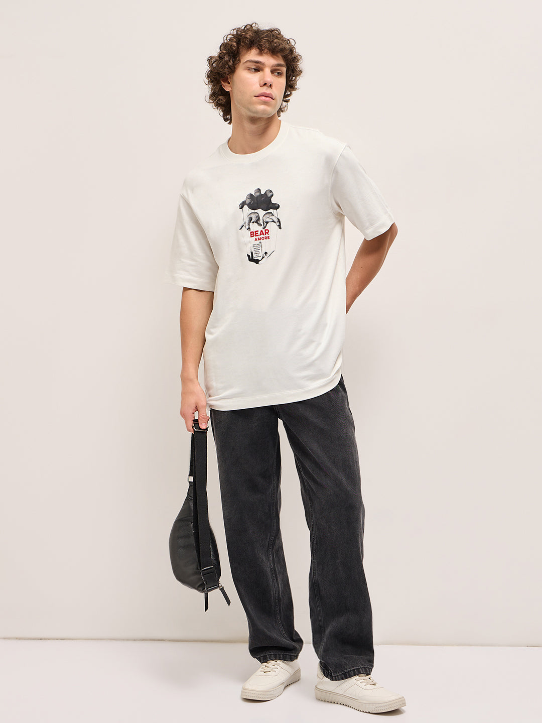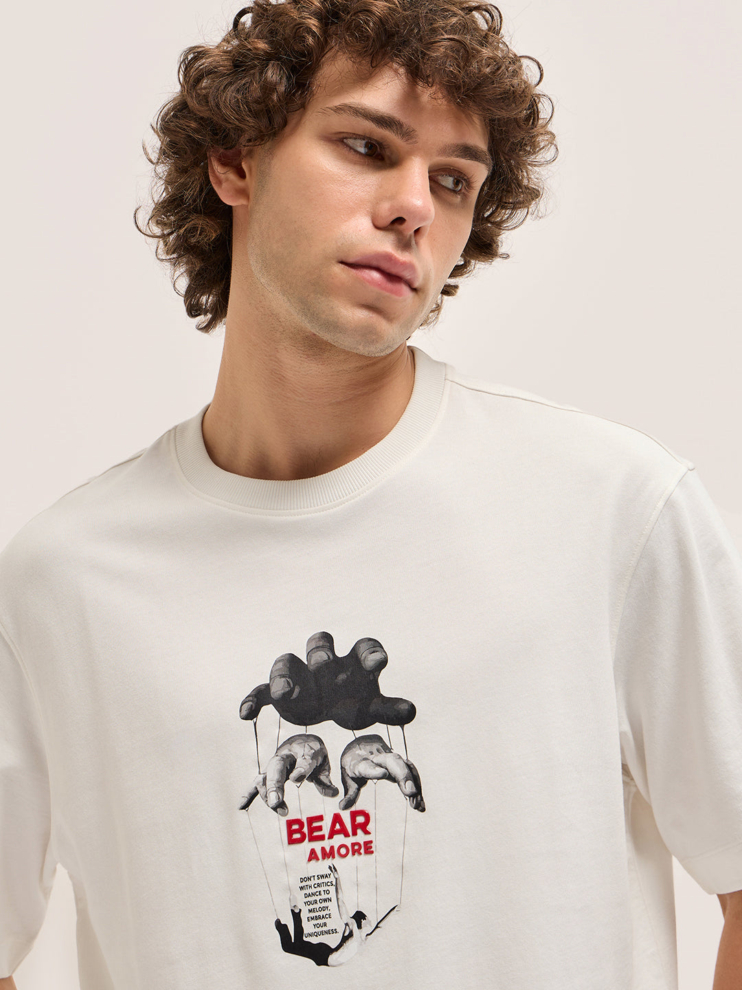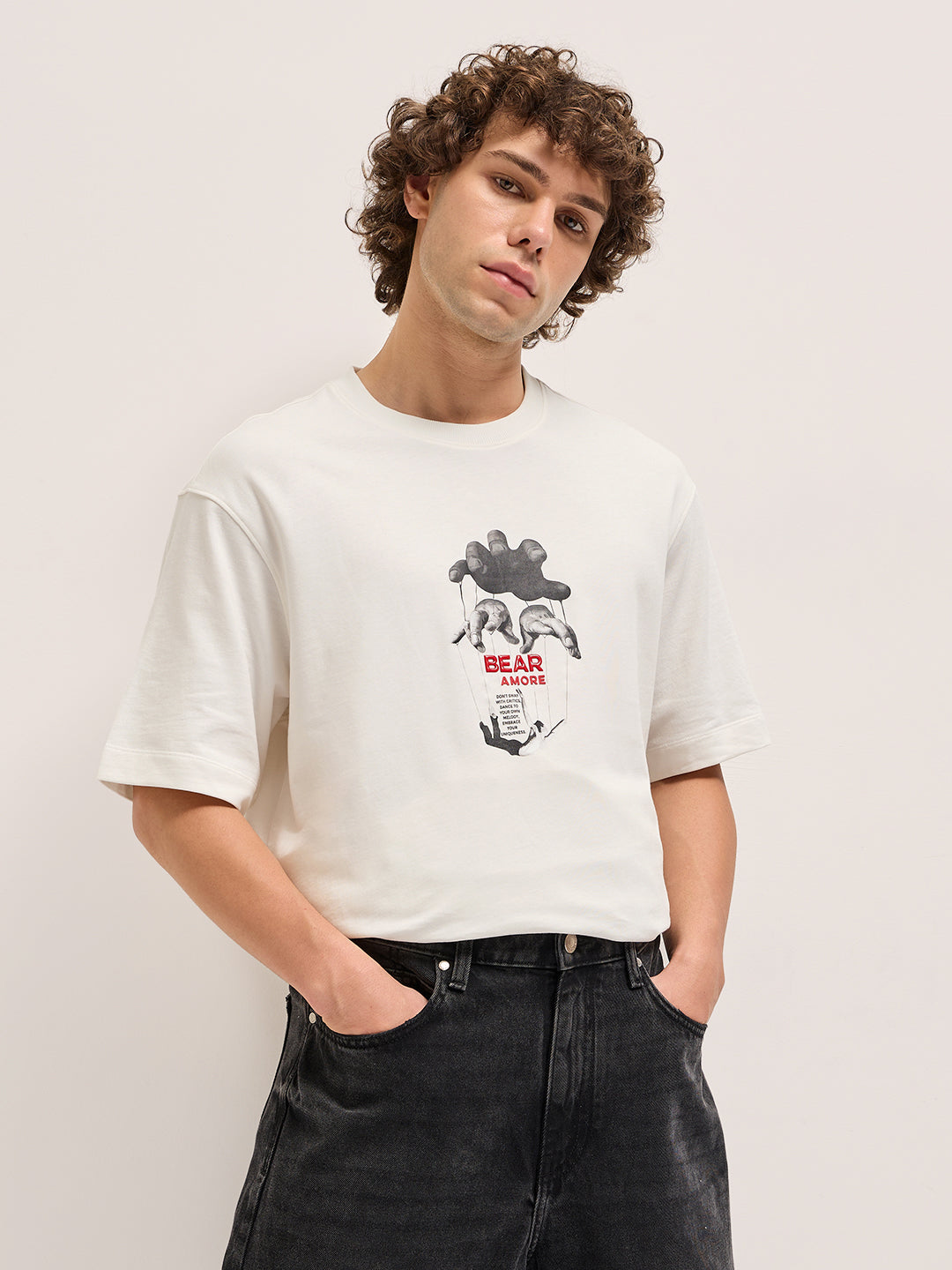 White Oversize Artistic "BEAR AMORE" Graphic Print Crew Neck T-shirt