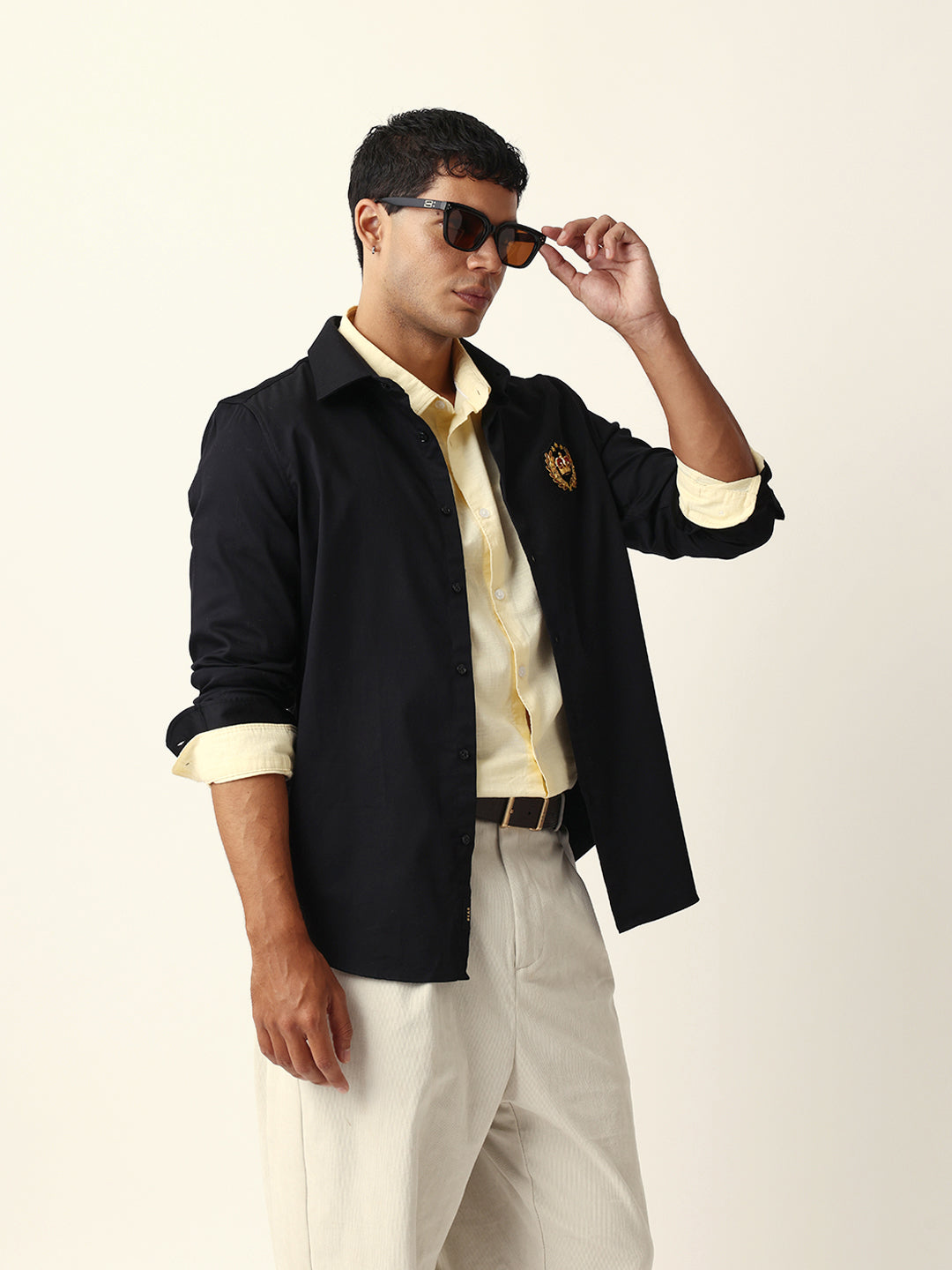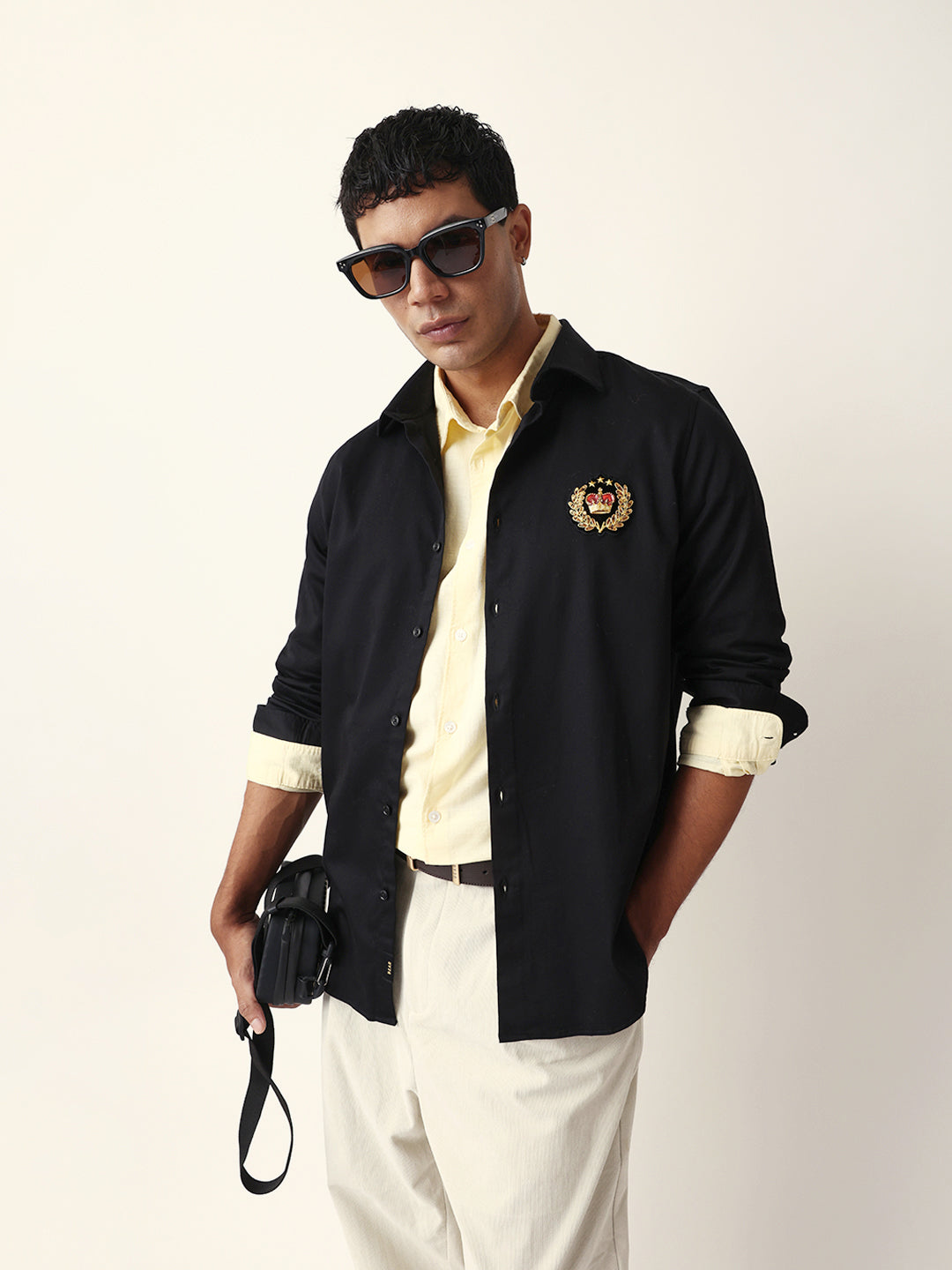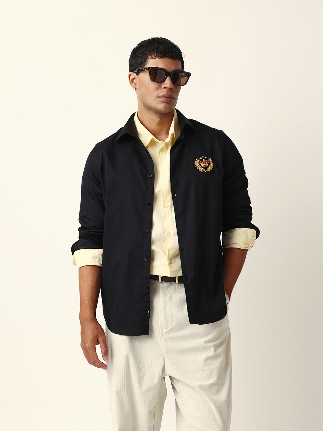 Style Note: This navy shirt with a striking wolf motif embroidery brings a touch of bold sophistication — pair it with tailored trousers or jeans for a confident, modern look.