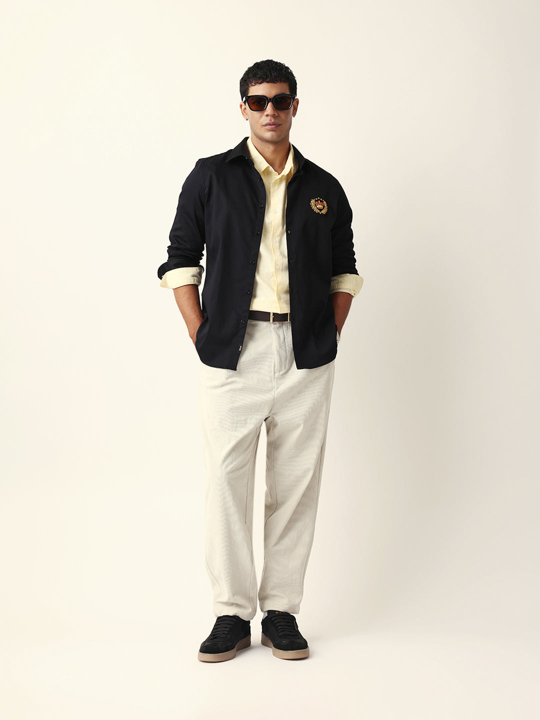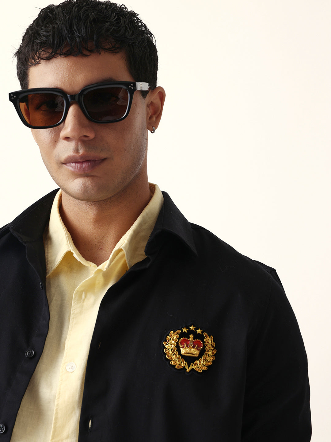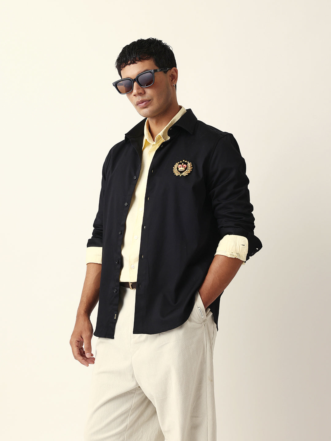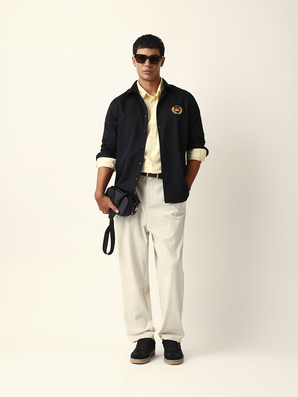 Style Note: This navy shirt with a striking wolf motif embroidery brings a touch of bold sophistication — pair it with tailored trousers or jeans for a confident, modern look.