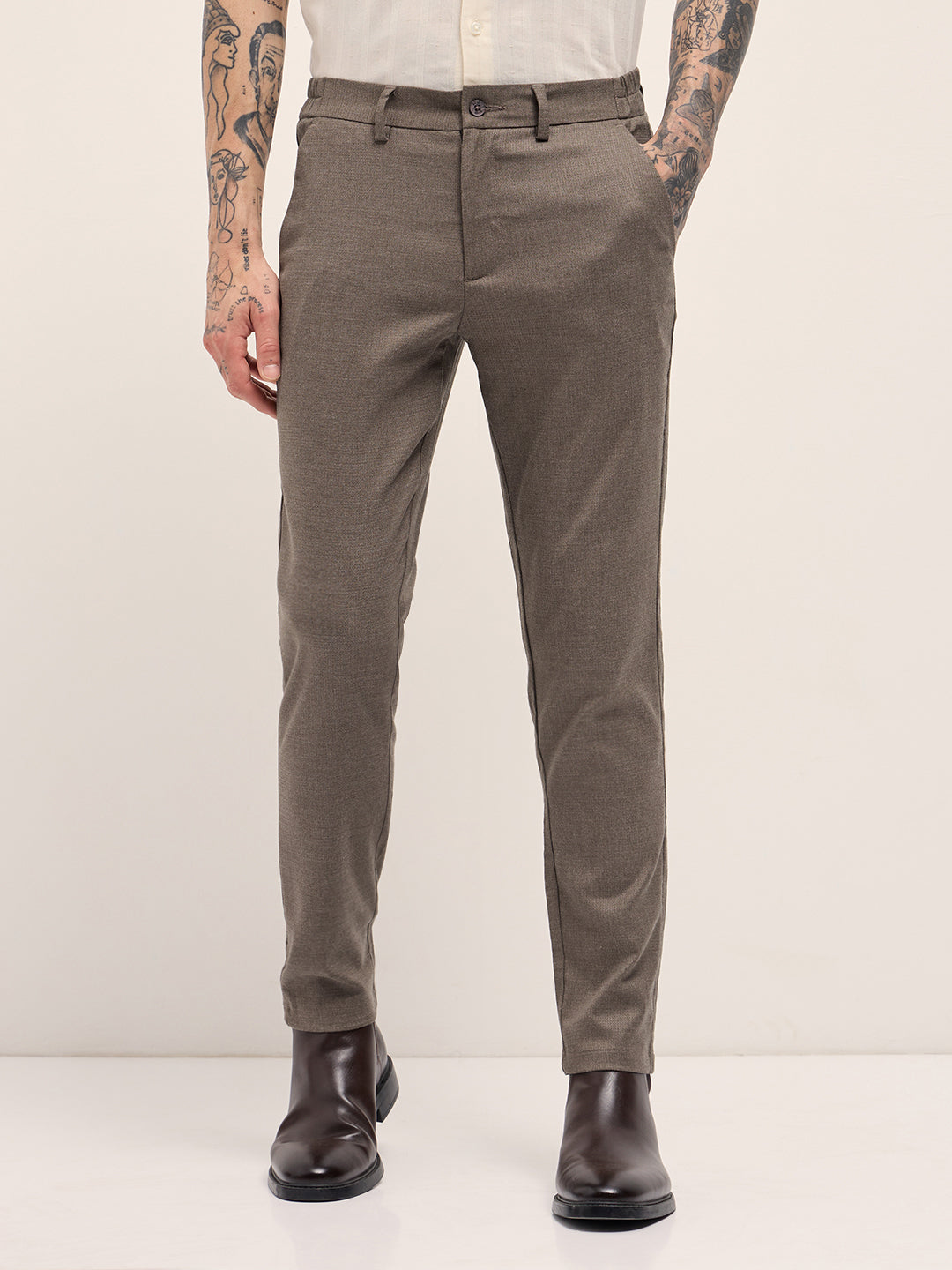 Shop Brown Slim Fit Formal Trousers with Side-Elasticated Waistband Online