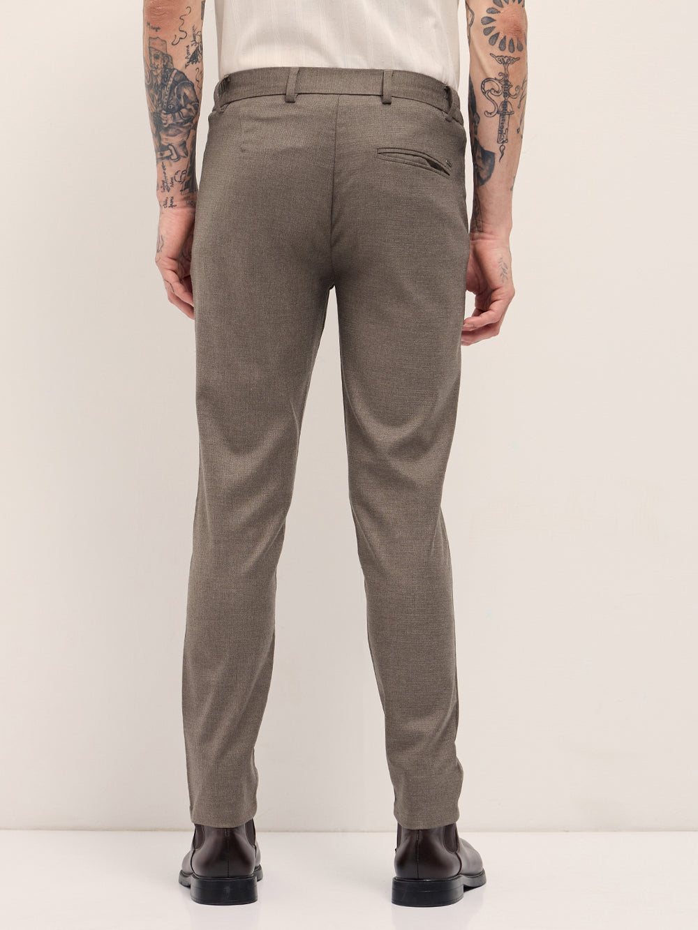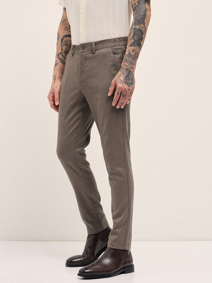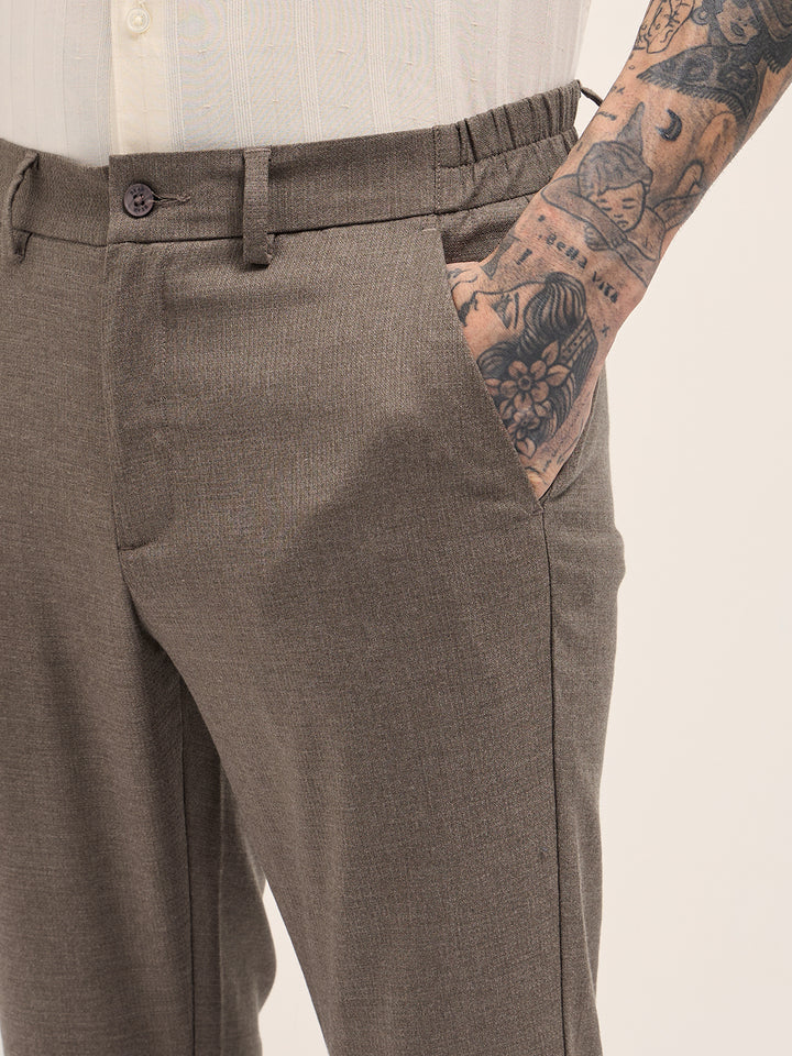 Brown Slim Fit Formal Trousers with Side-Elasticated Waistband