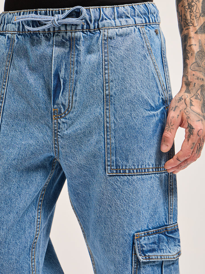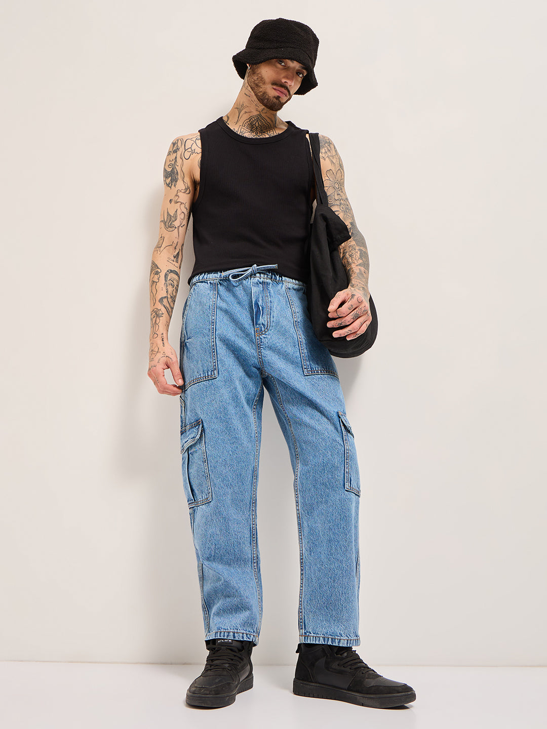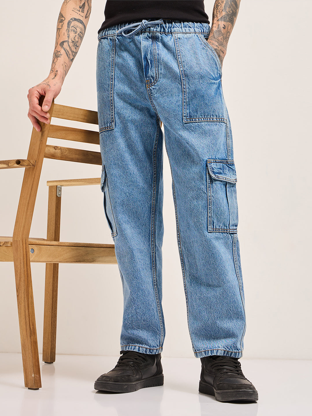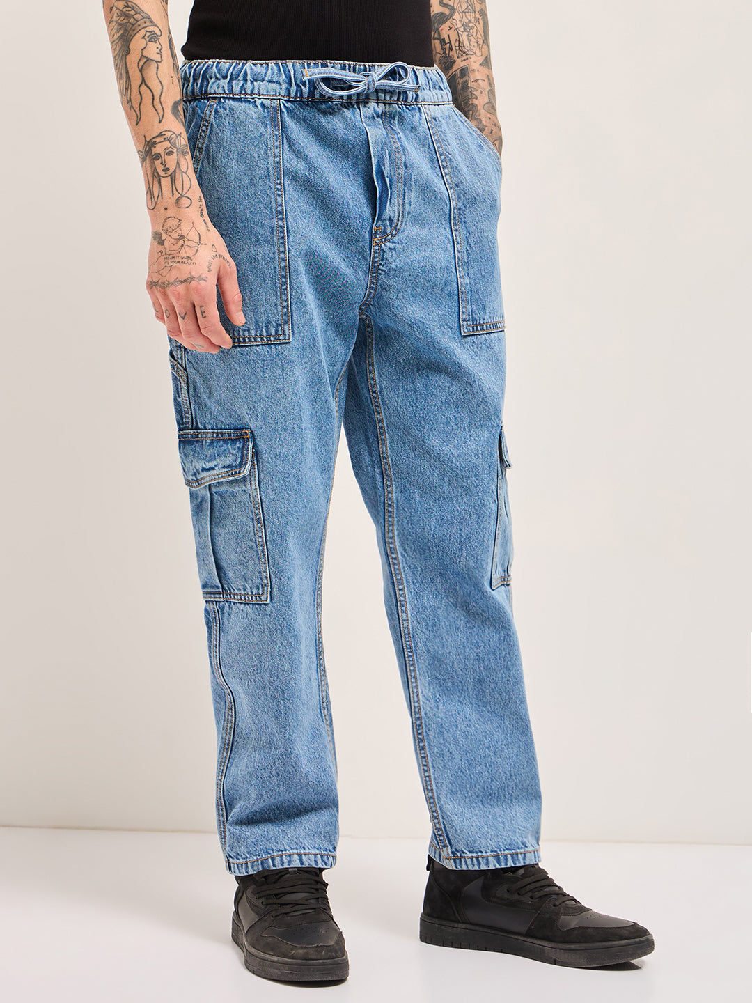 Blue with Mid Fade Mid-Rise Elasticated Waist Baggy Fit Cargo Jeans