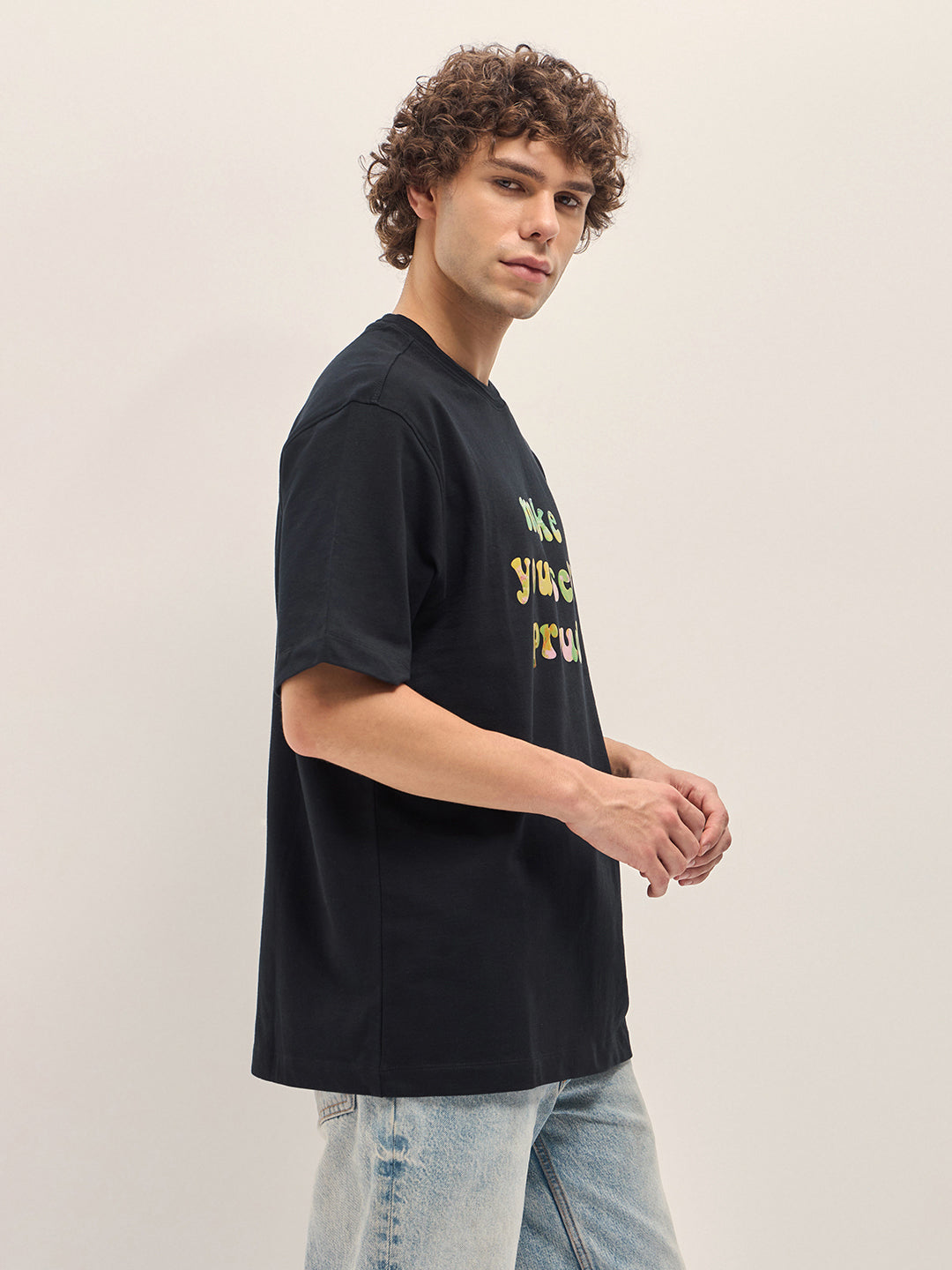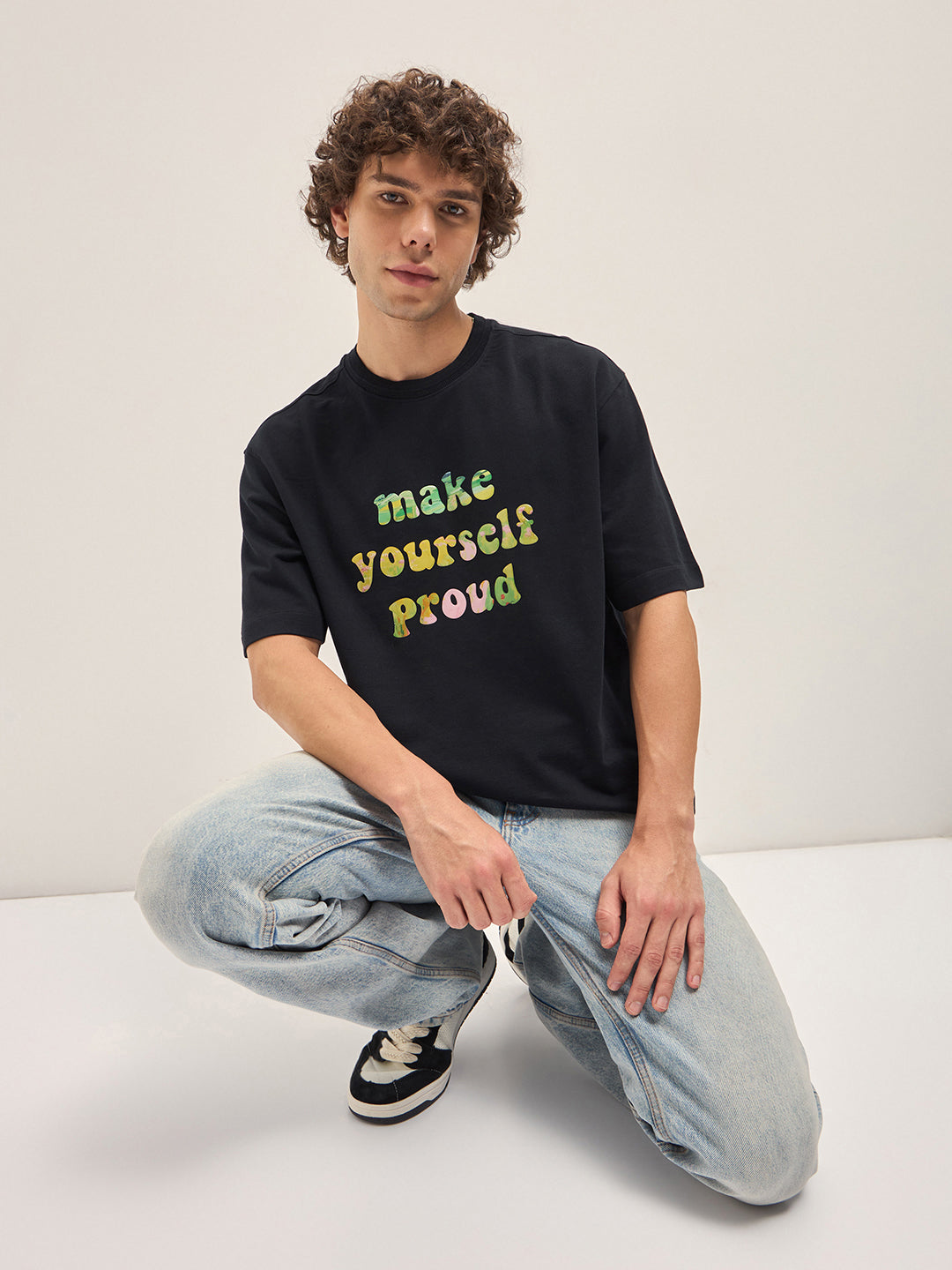 - Design: Vibrant "Make Yourself Proud" graphic on the chest, featuring a playful mix of colors and floral patterns.