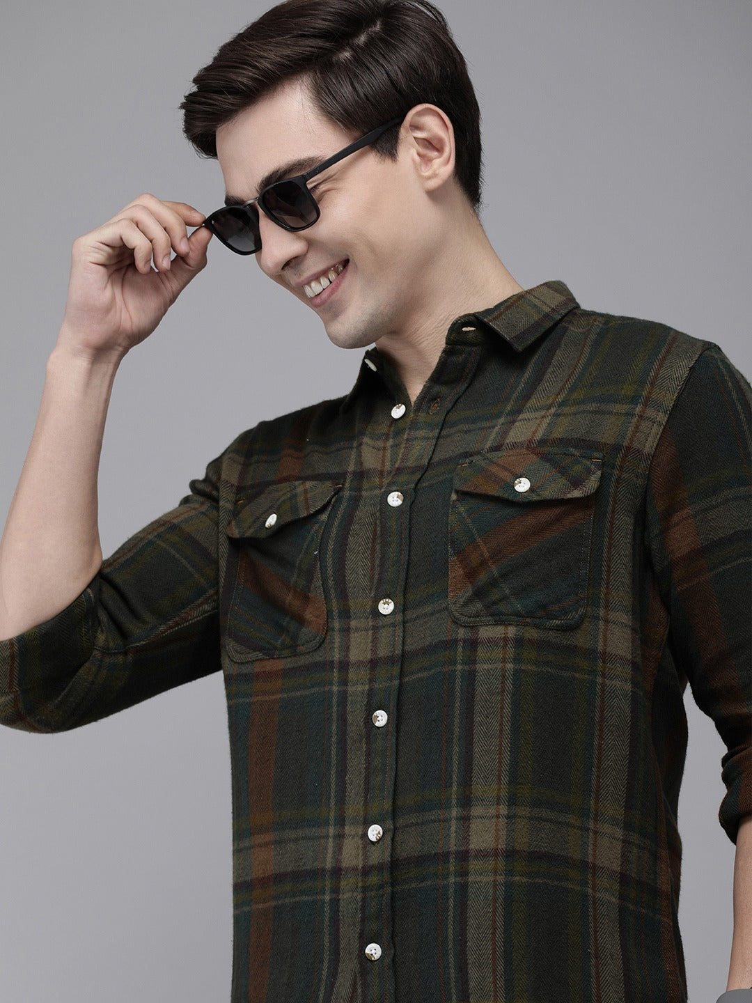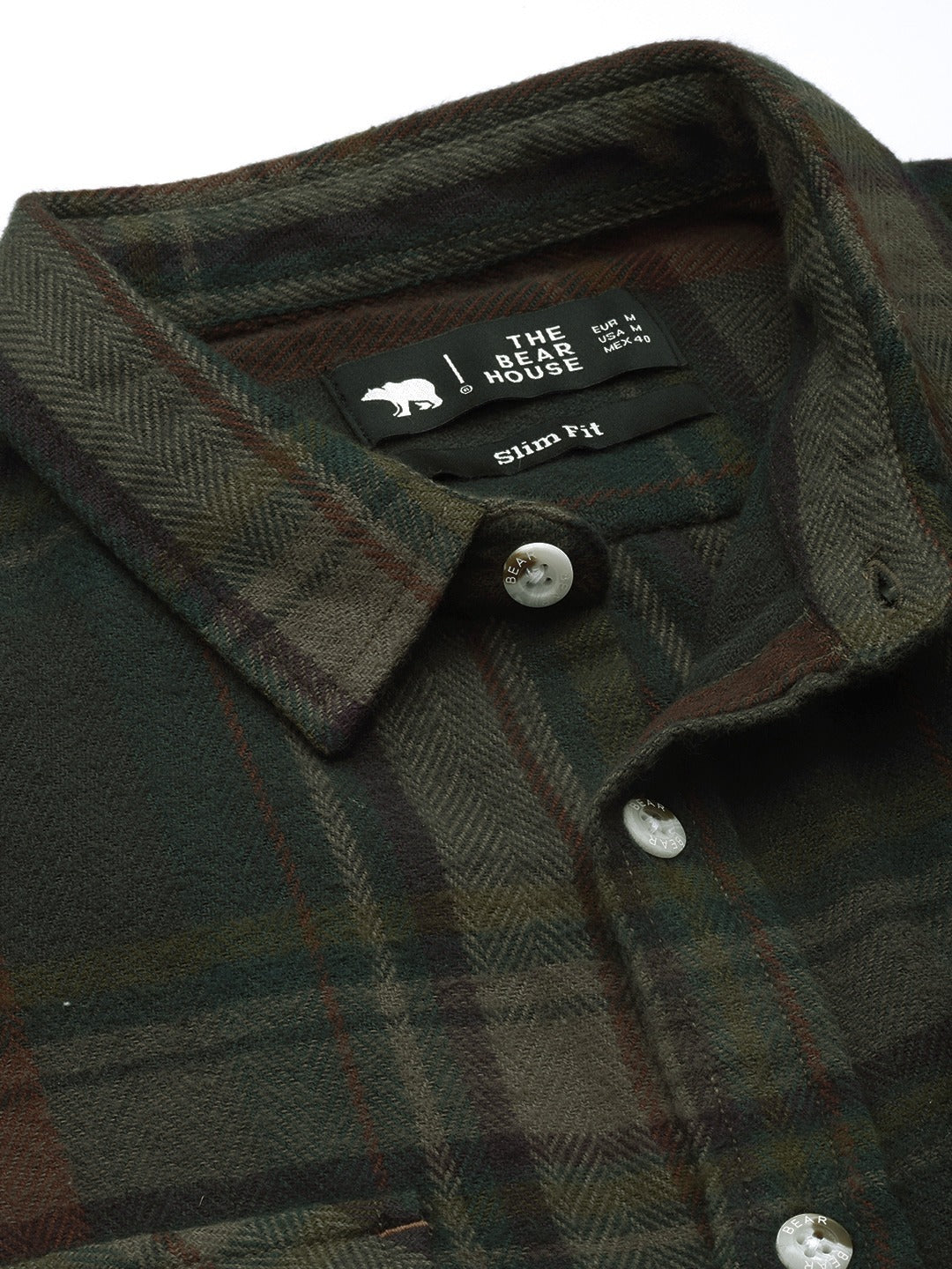 Men Olive Green Checked Slim Fit Flannel Cotton Casual Shirt