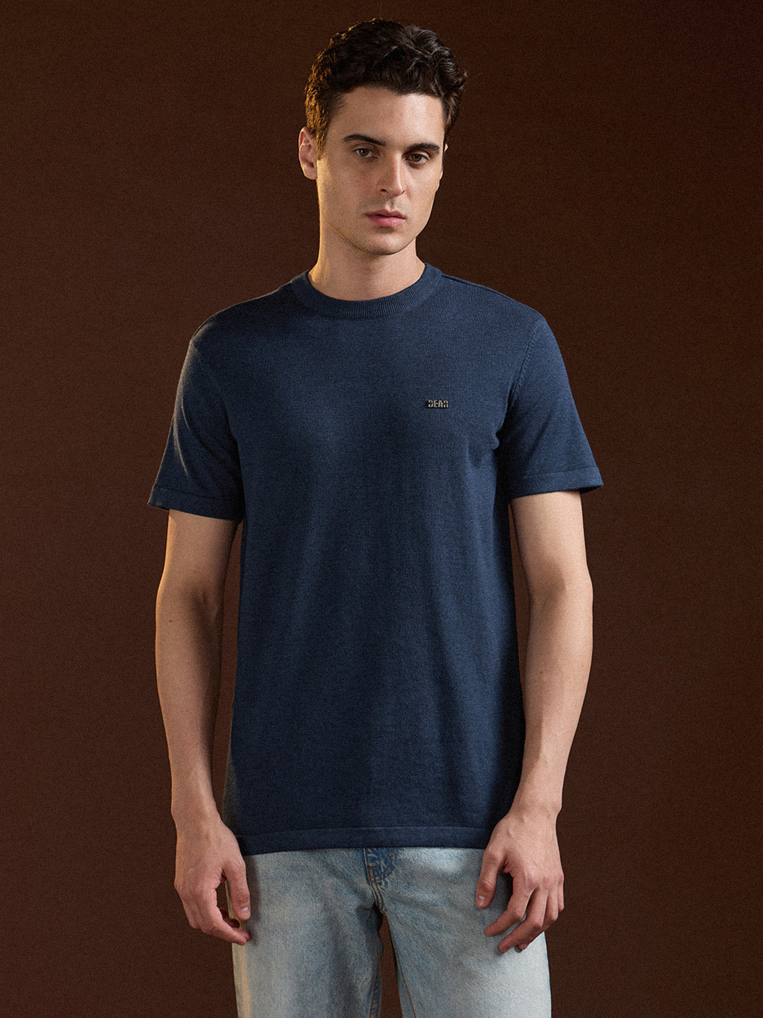 Blue Solid Regular Fit Ribbed Crew Neck T-shirt