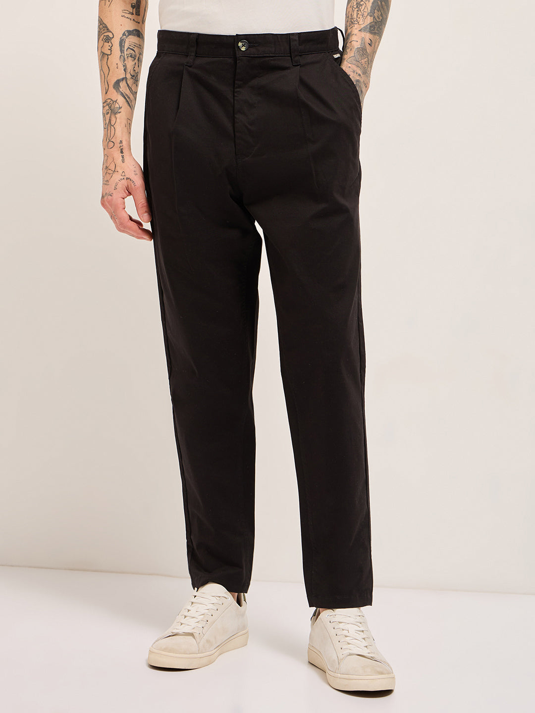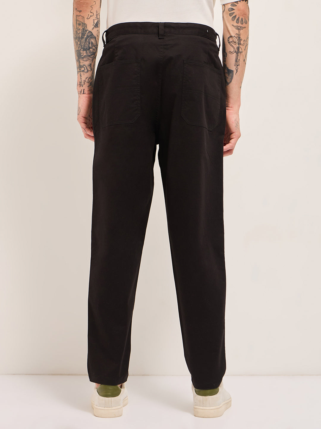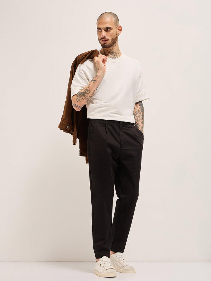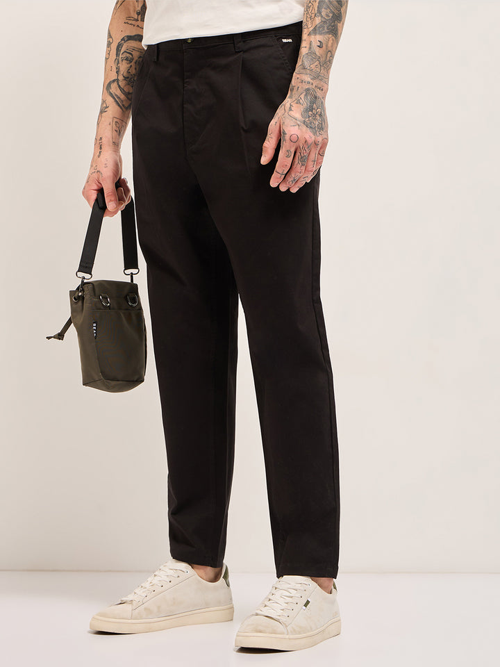 Black Solid Cropped Carrot Fit Casual Chino Trouser