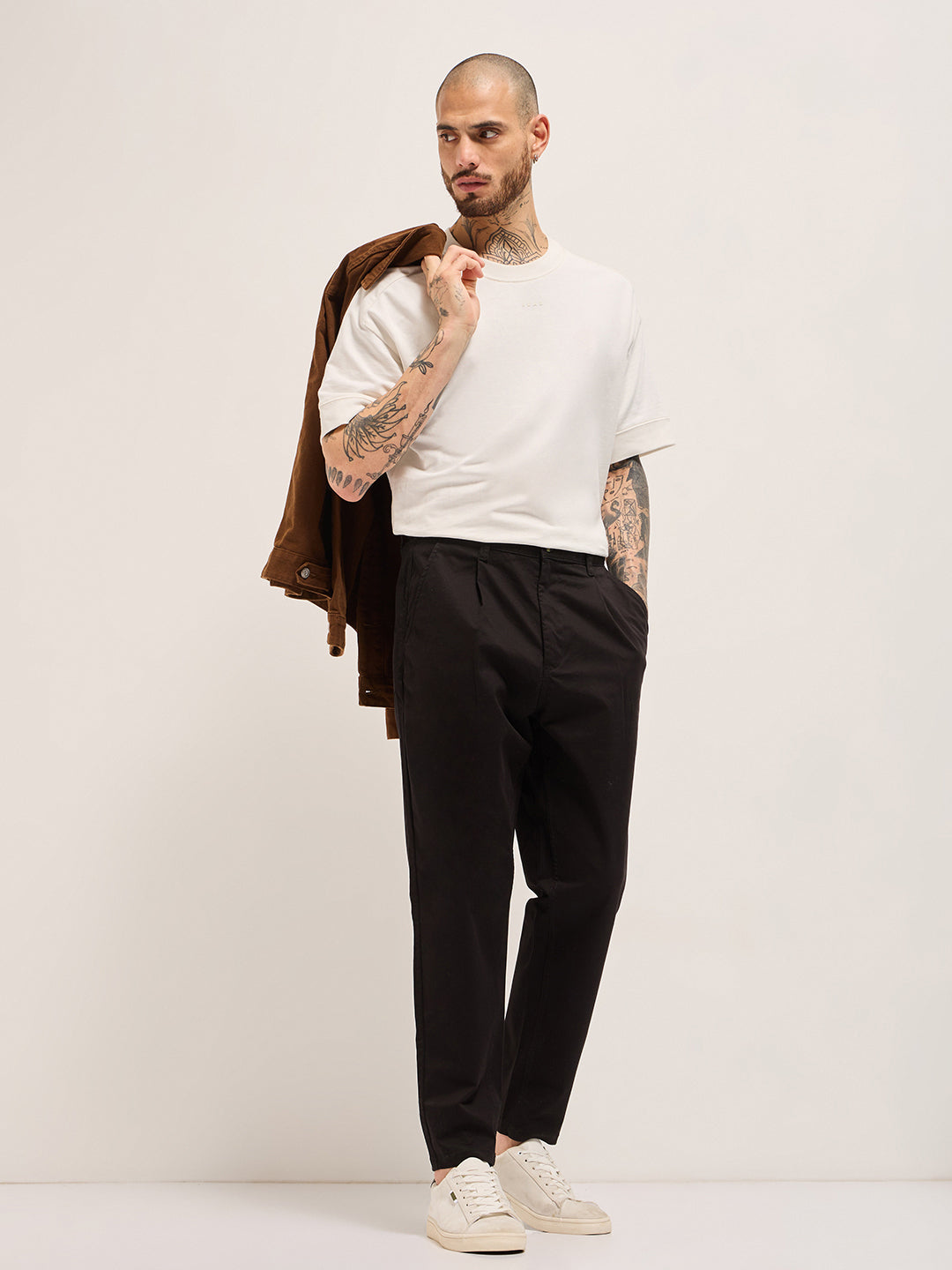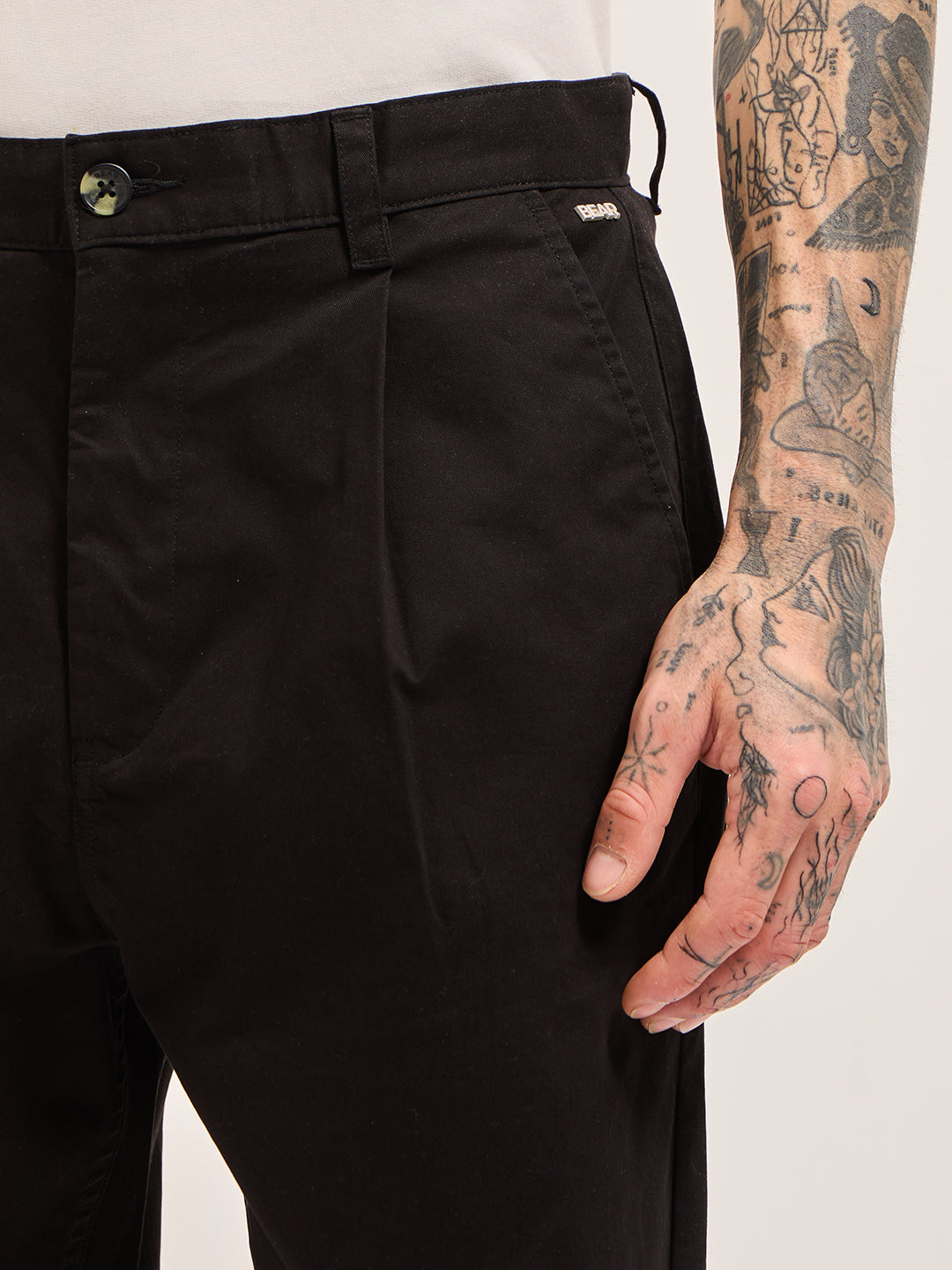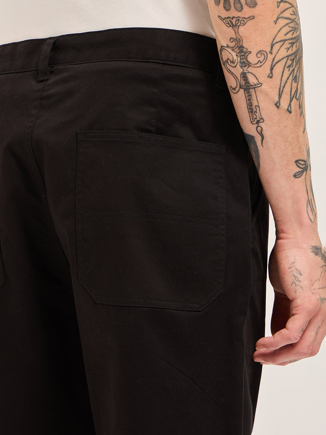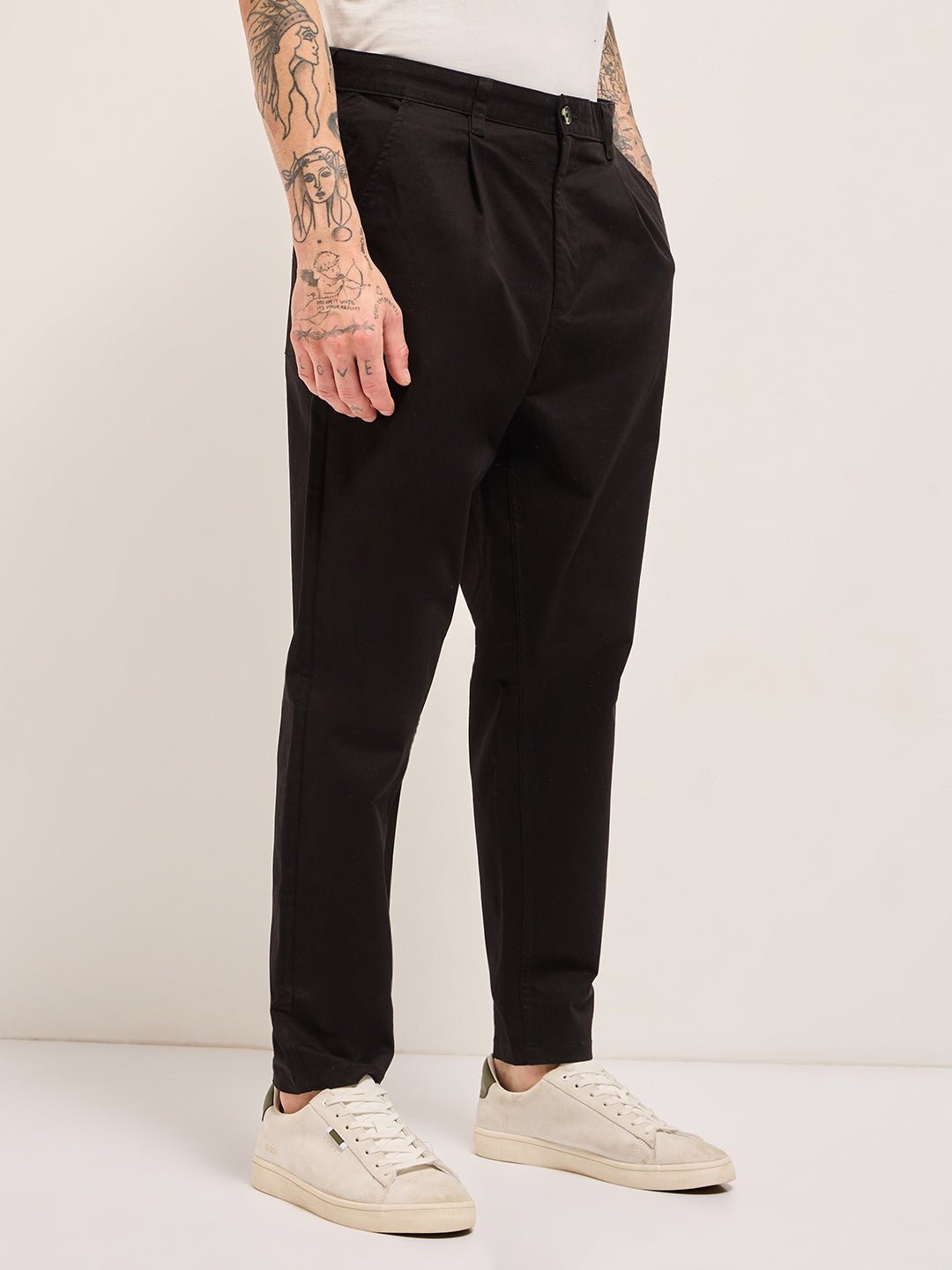 Black Solid Cropped Carrot Fit Casual Chino Trouser
