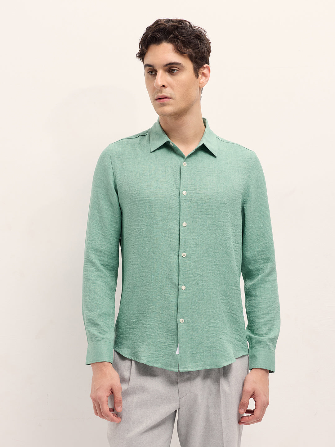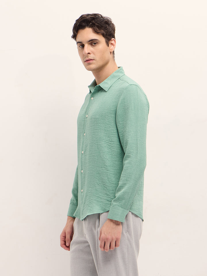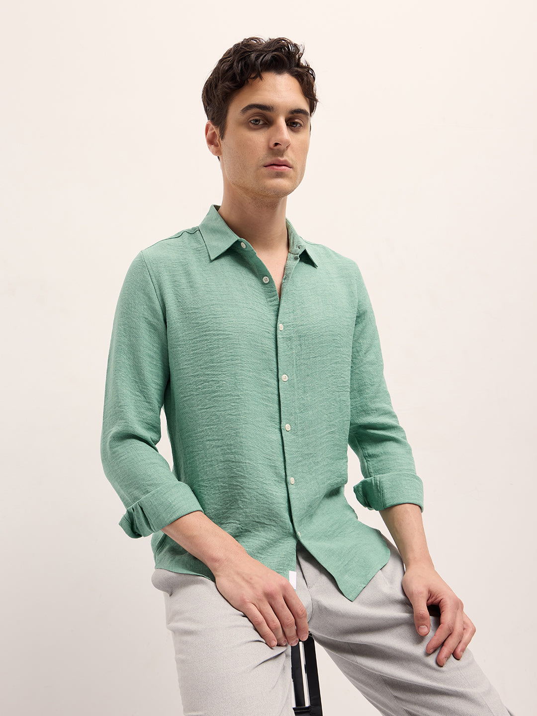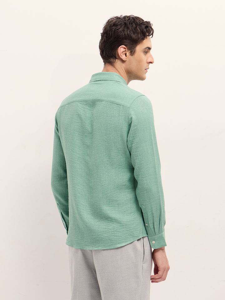 Green Solid Seersucker Effect Slim Fit Casual Shirt