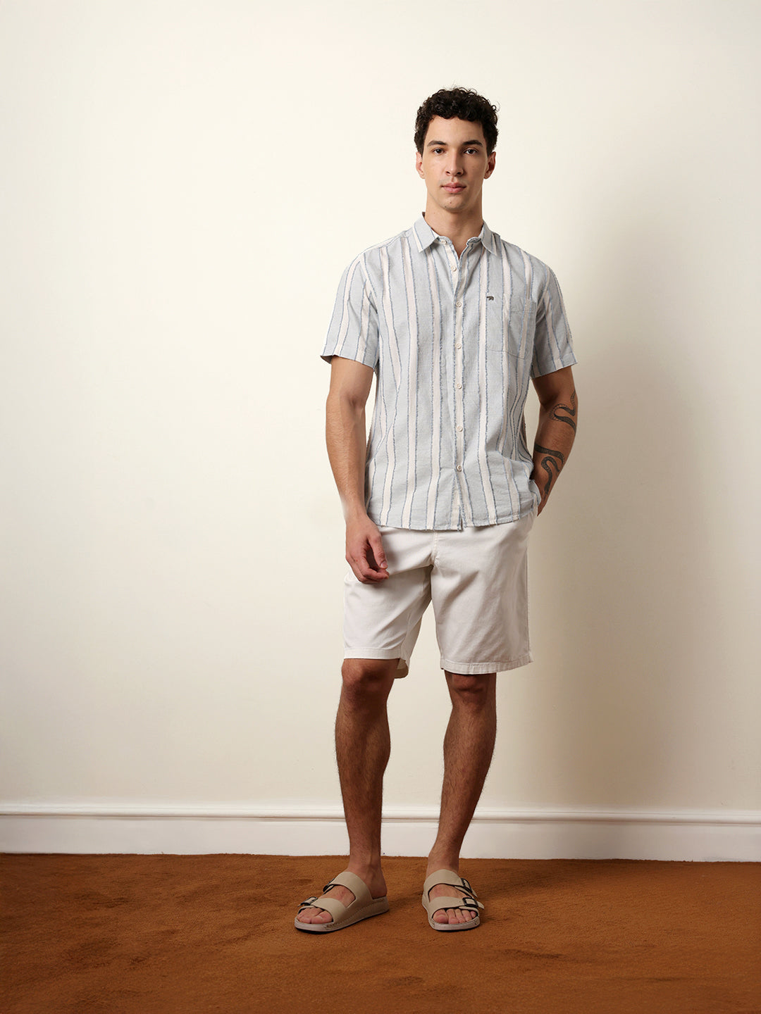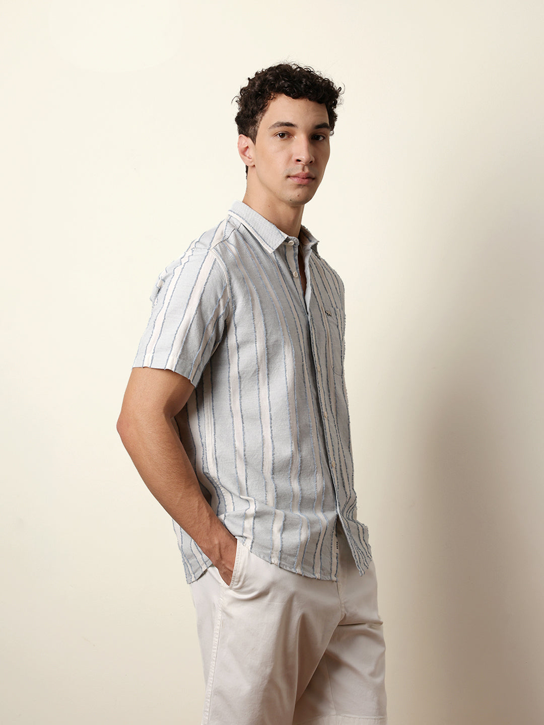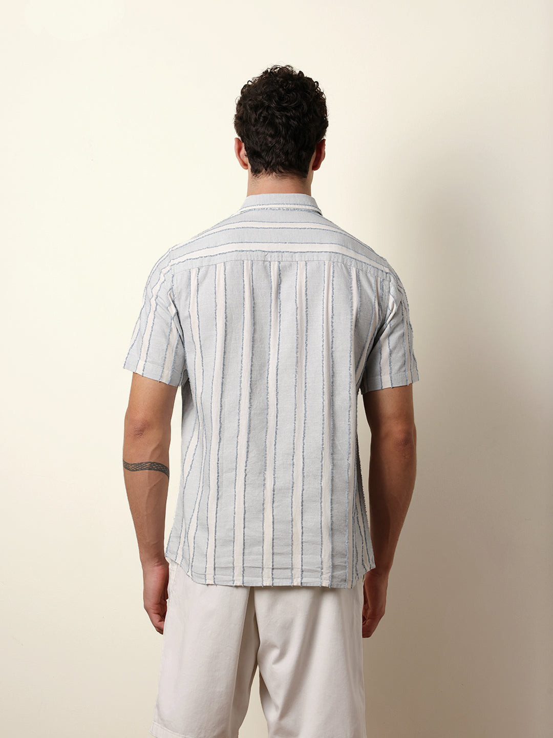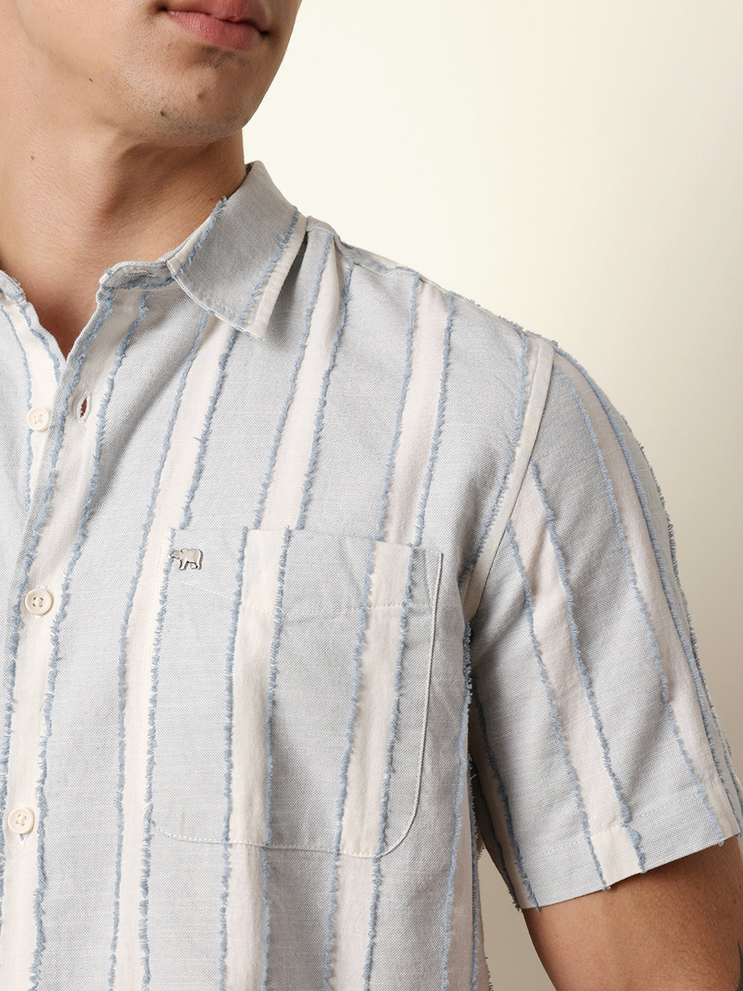 Blue & White Vertical Chenille Stripe Regular Fit Casual Shirt