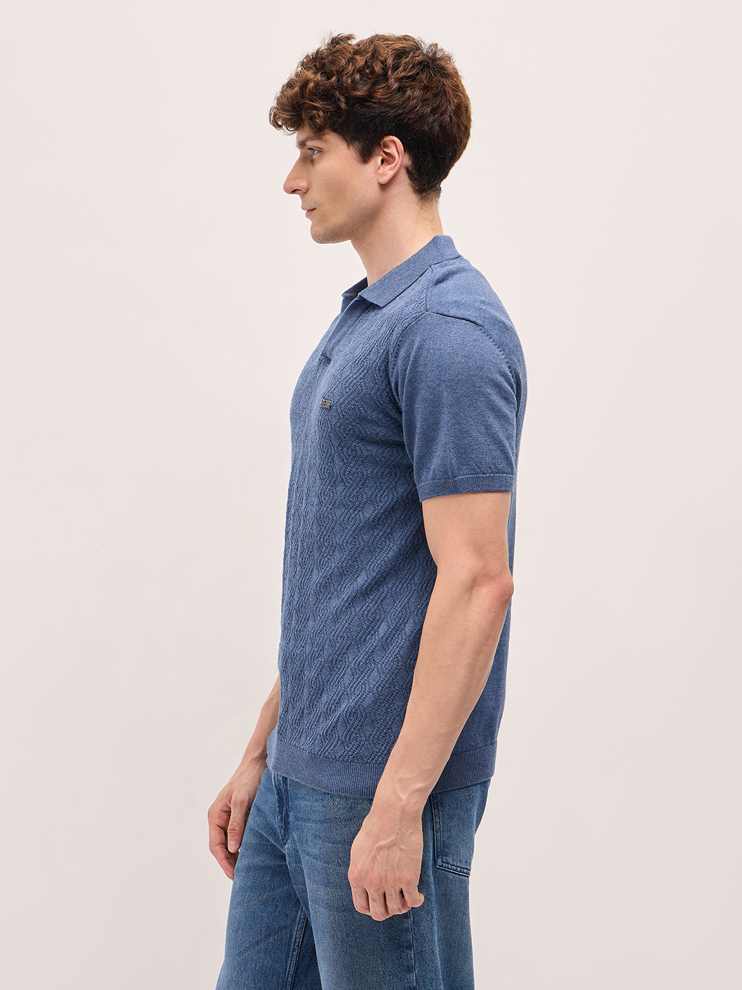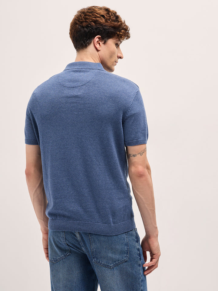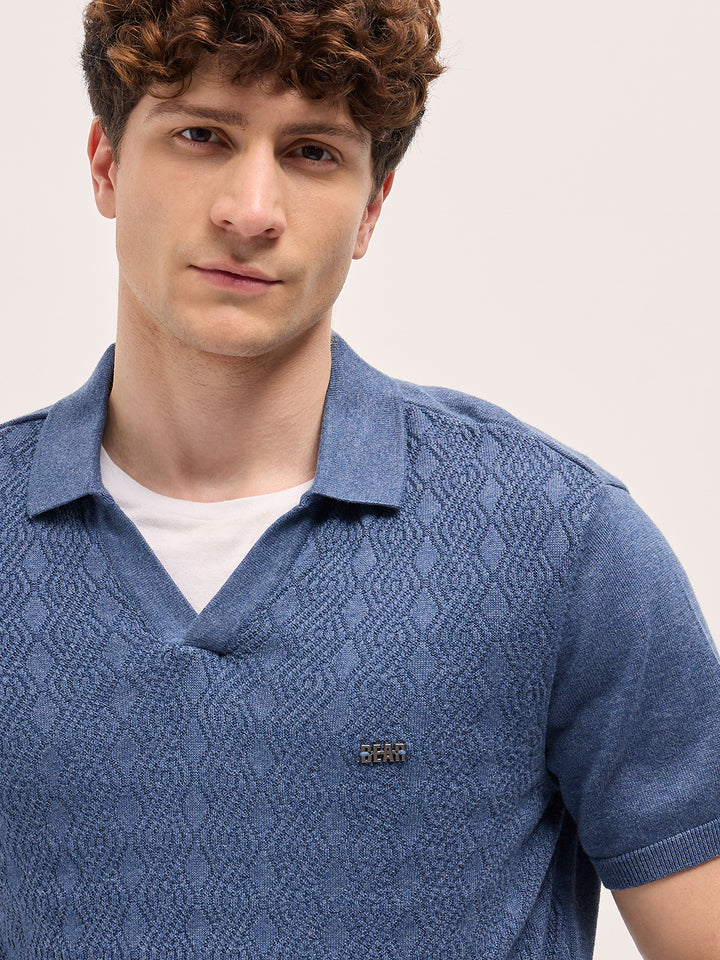 Blue Geometric textured Knit Slim Fit Polo