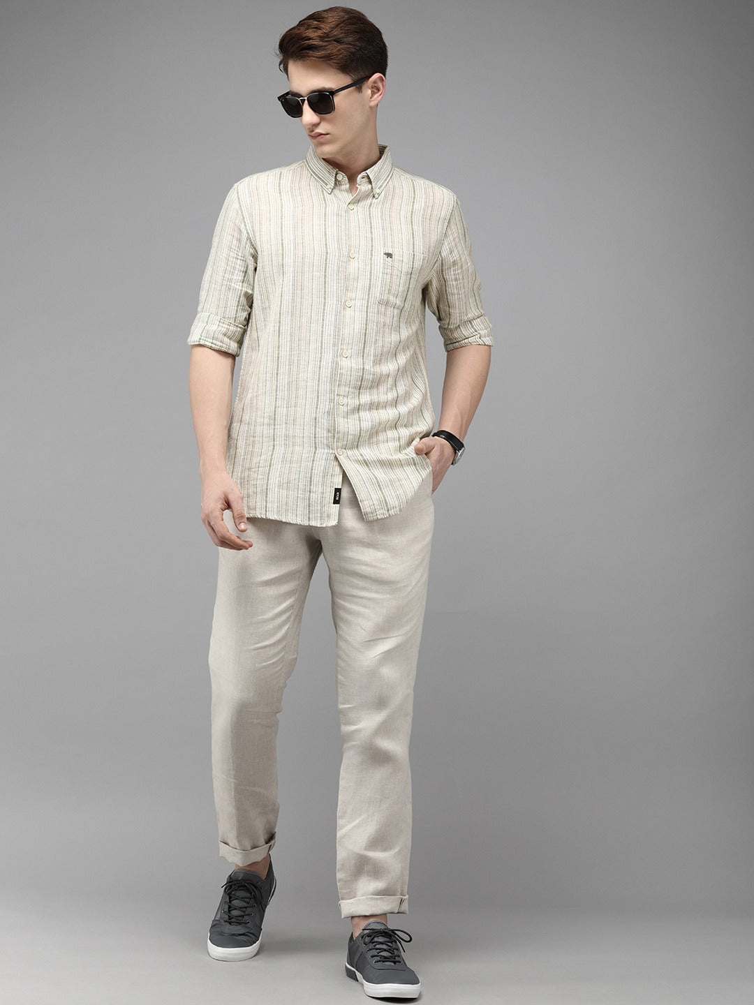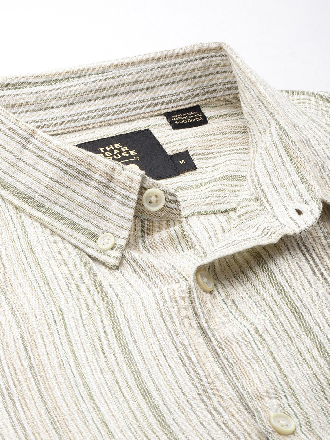 Men Cream Striped Slim Fit Cotton Linen Casual Shirt