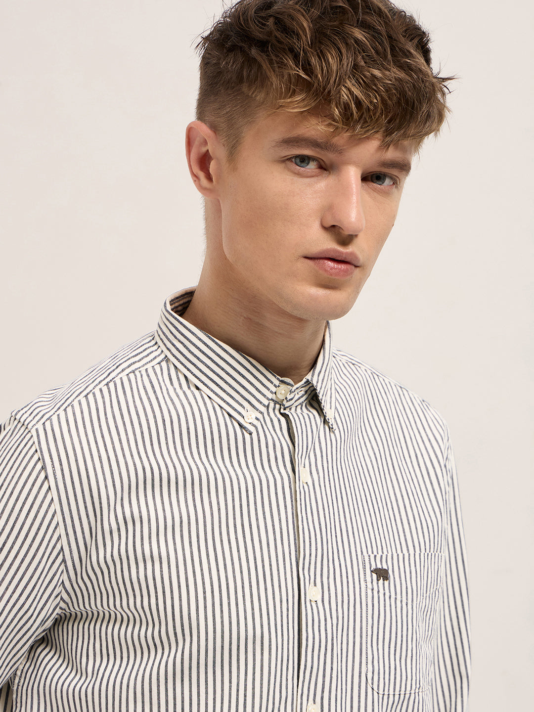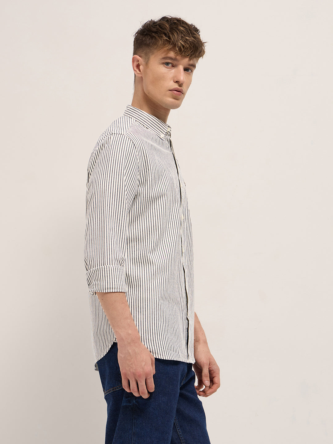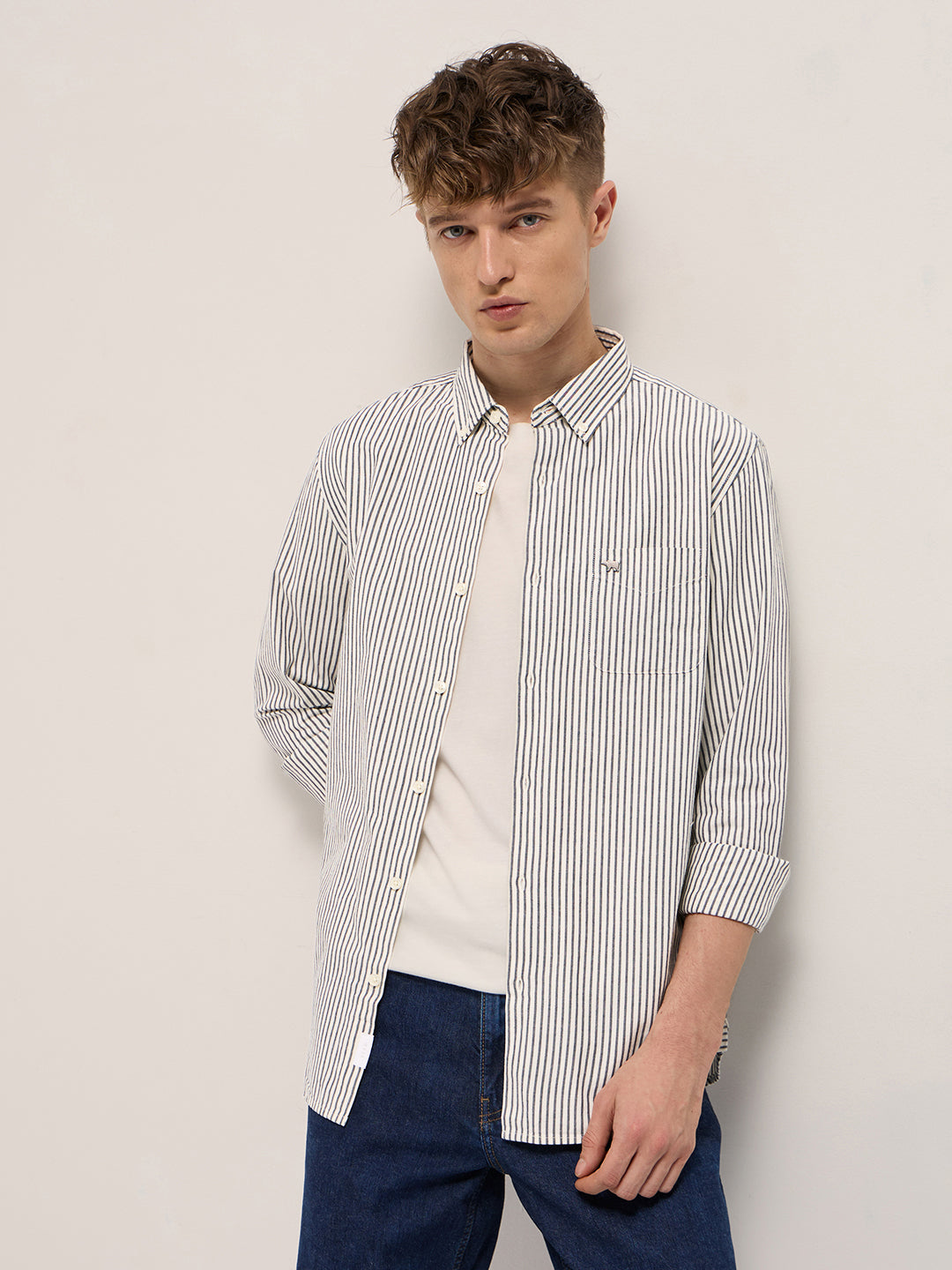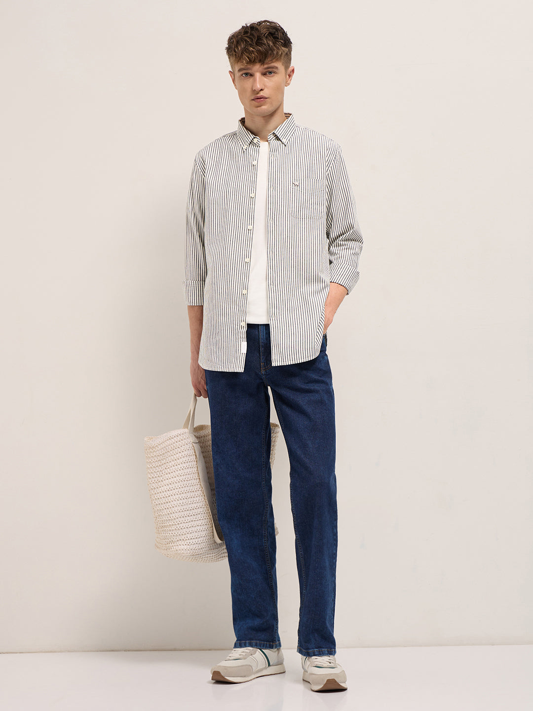 Cream with Black Vertical Pin Stripes Slim Fit Casual Shirt