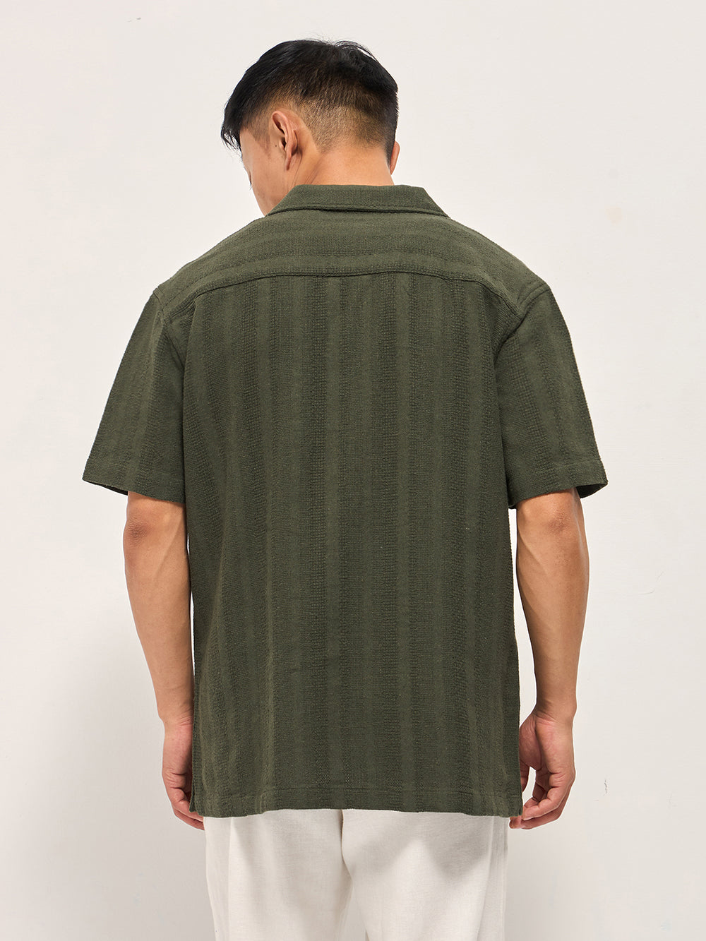 Shop Green Textured Striped Regular Fit Casual Shirt with a Cuban Collar Online.