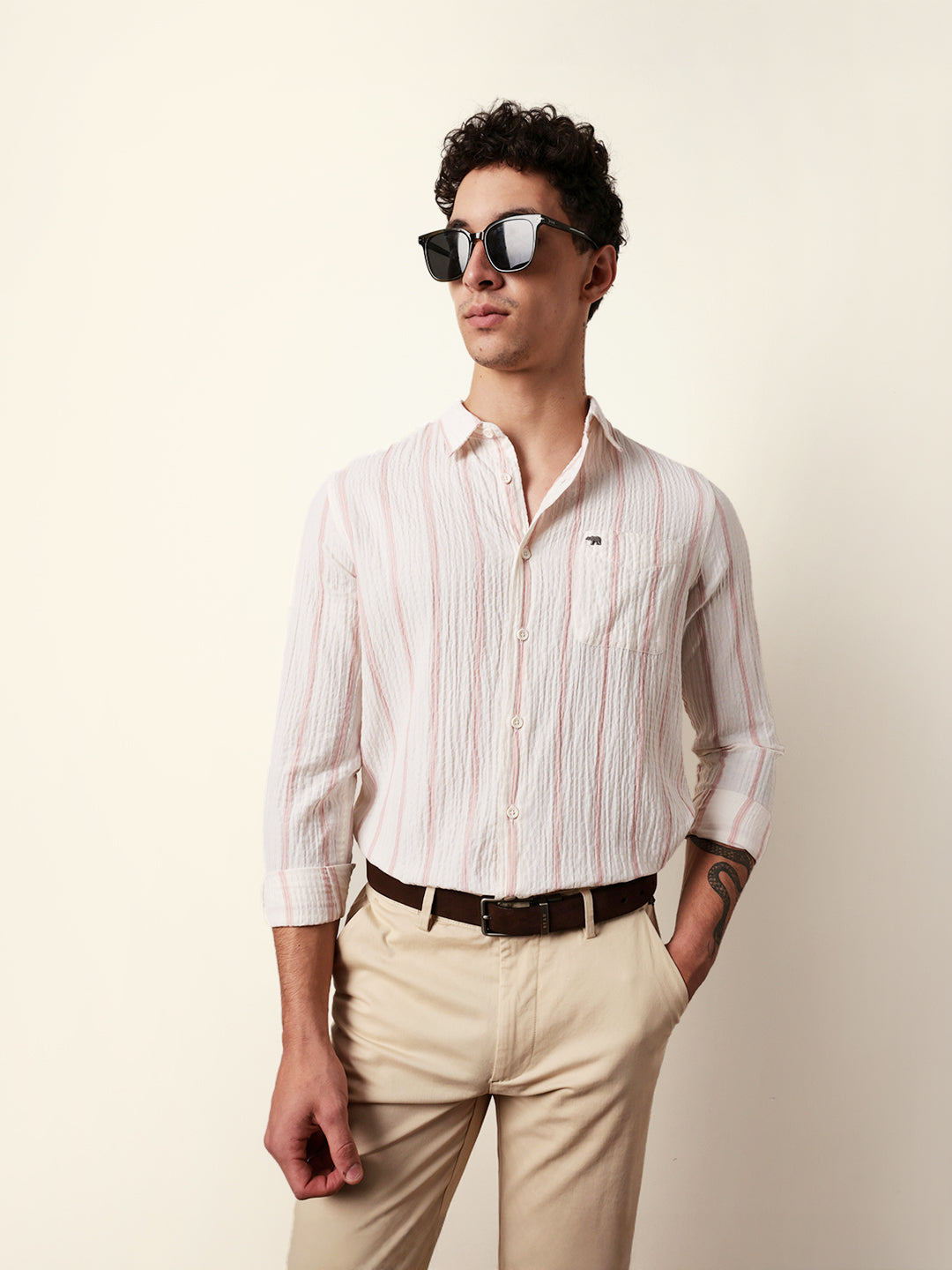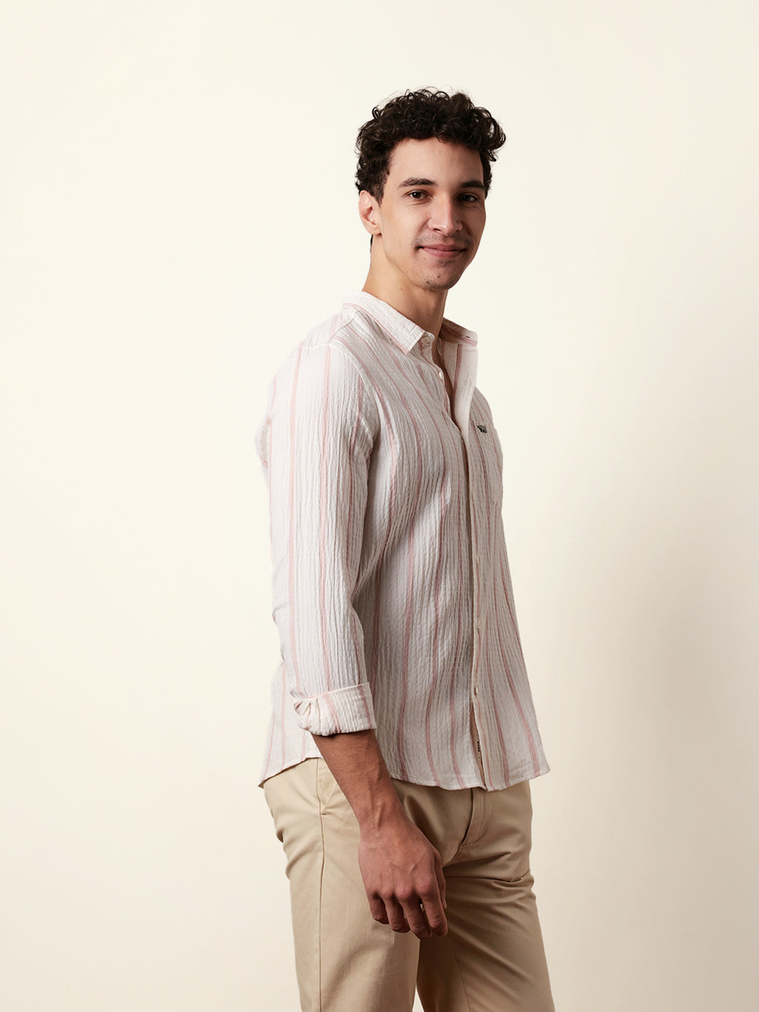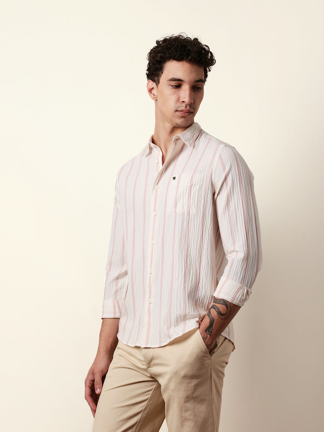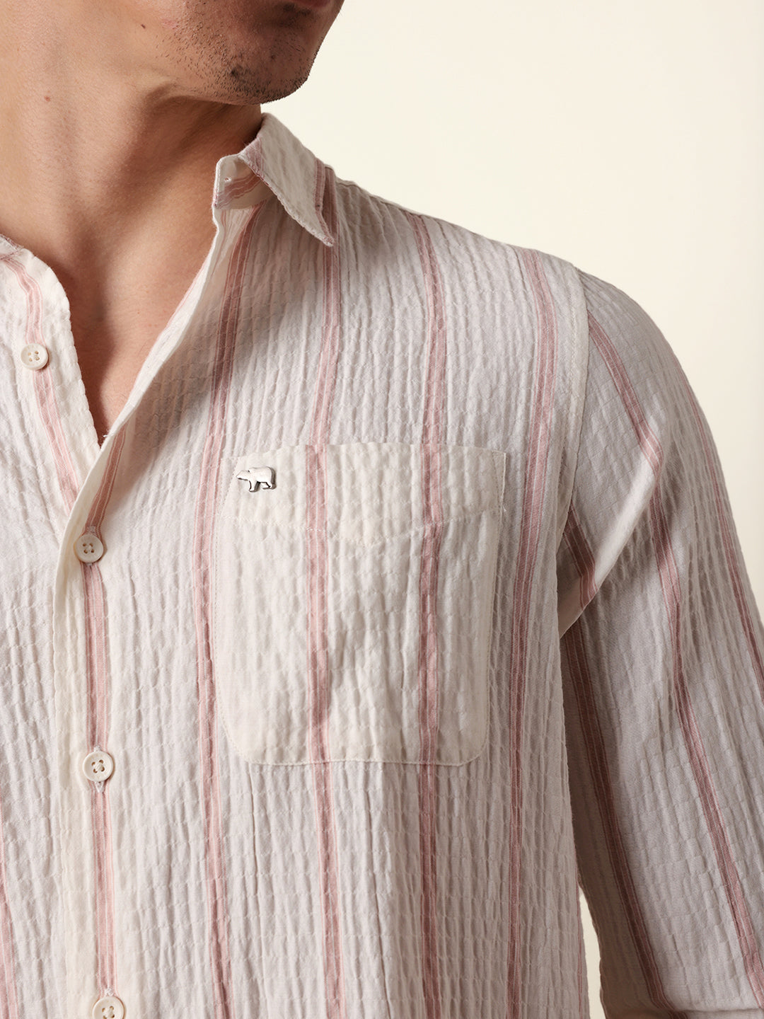 Off white with Pink Vertical Textured Stripe Regular Fit Casual Shirt