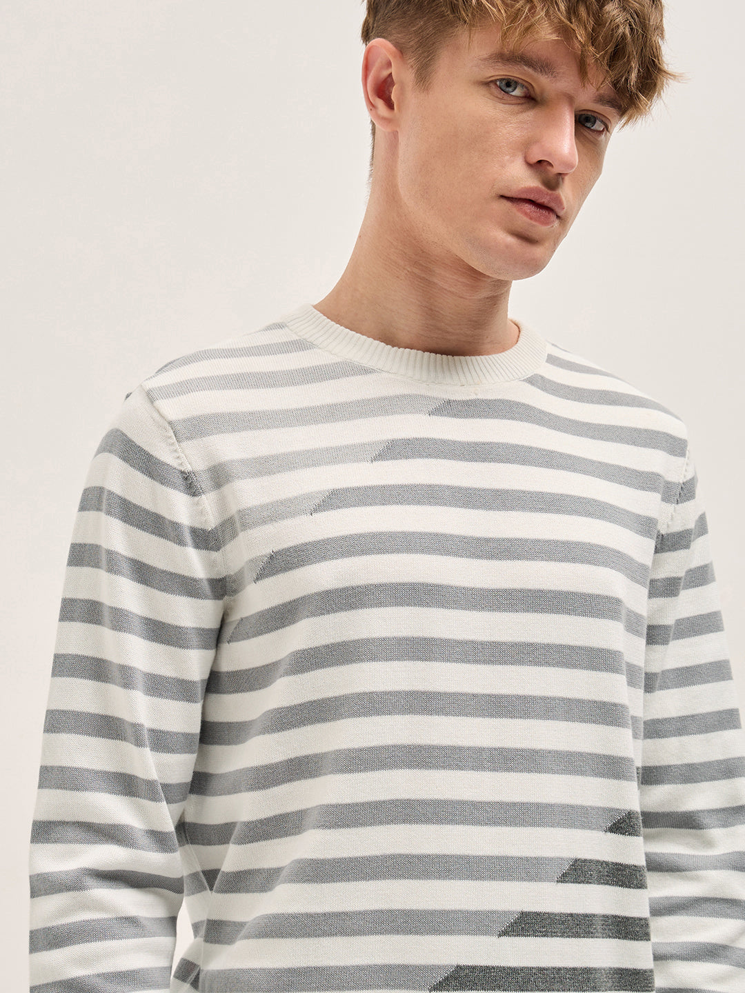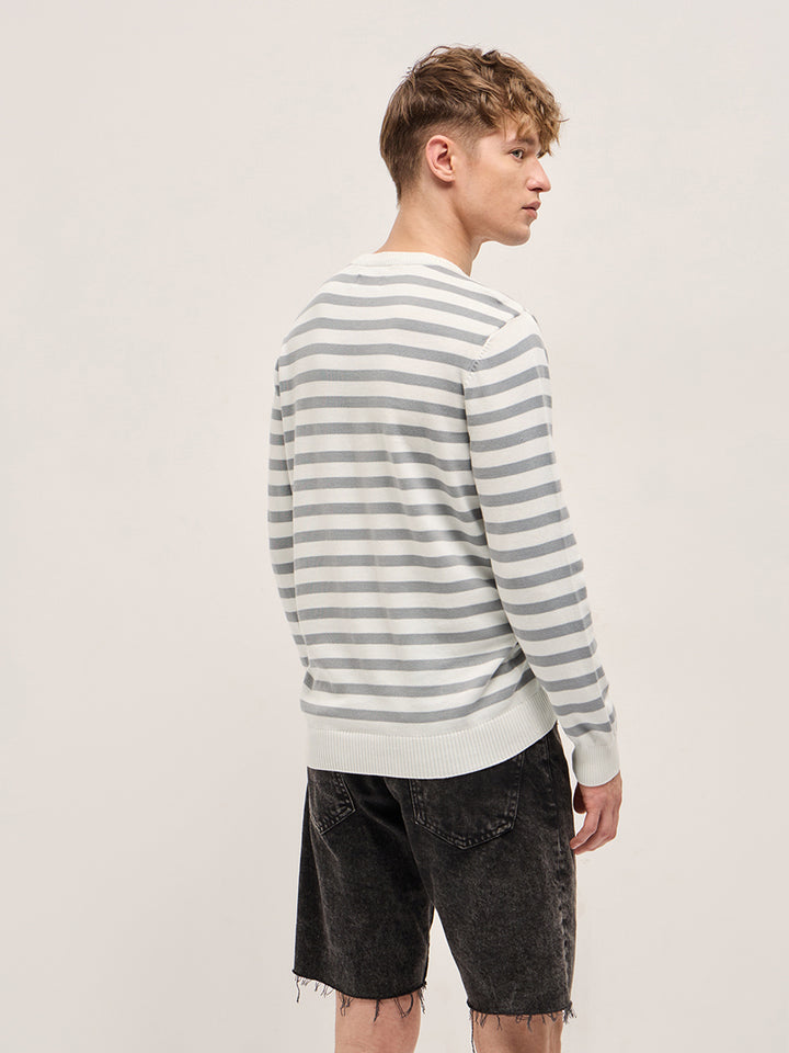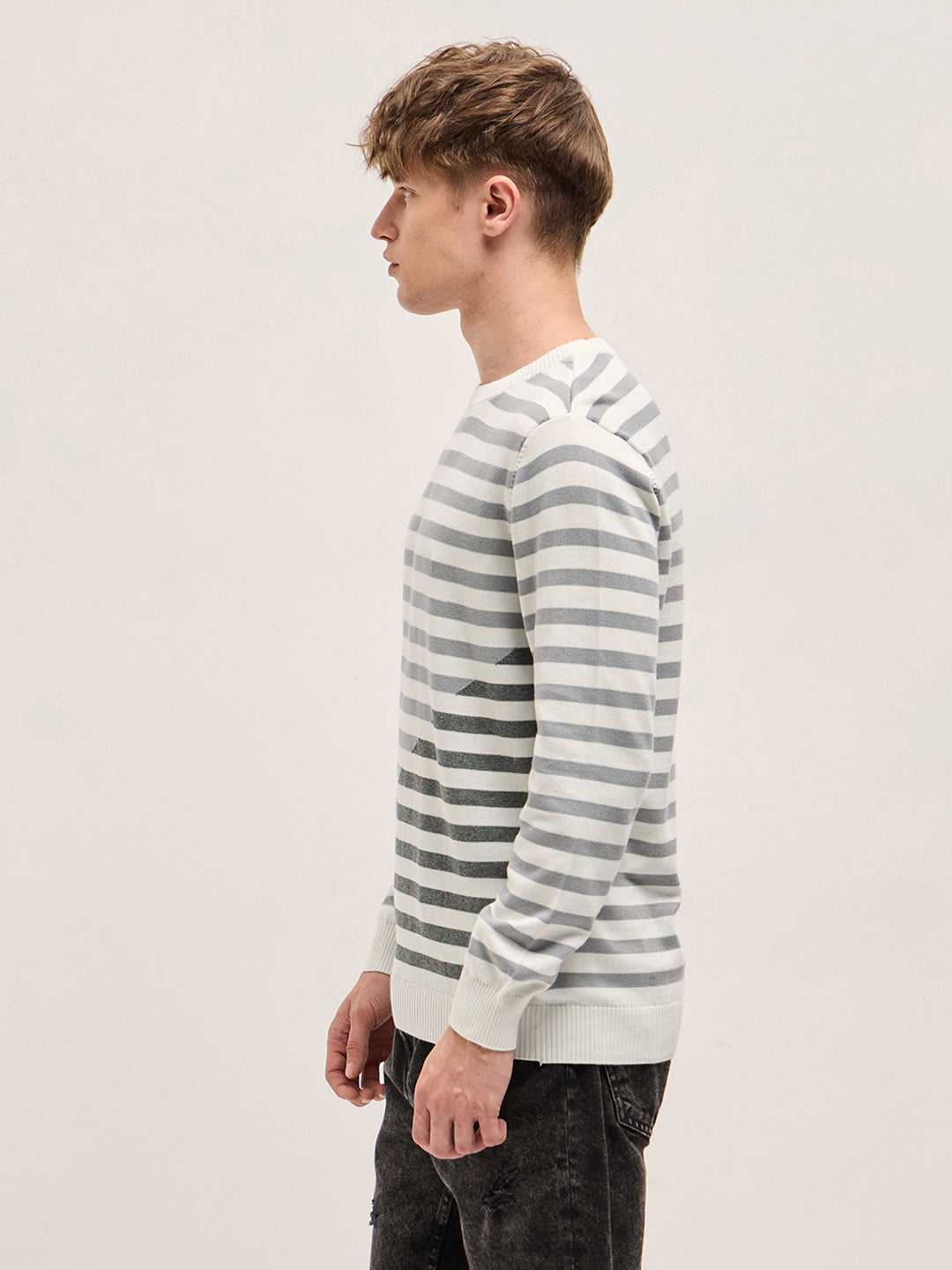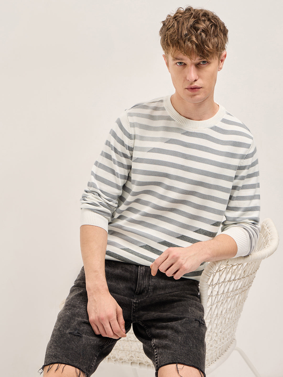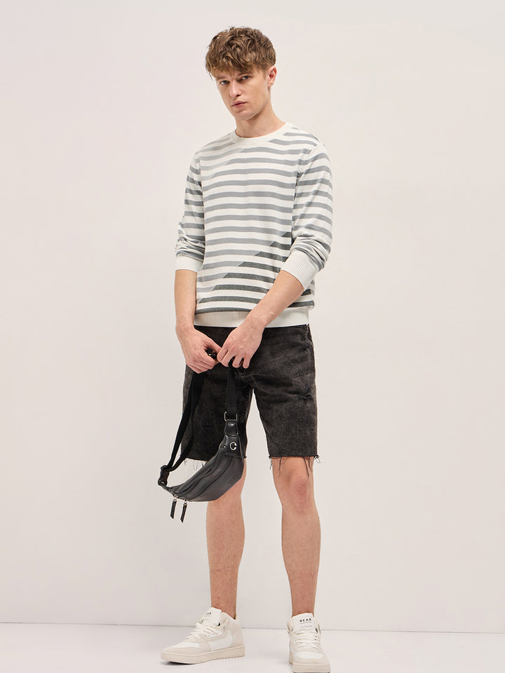 Grey Horizontal Striped Slim Fit Ribbed Crew Neck T-shirt