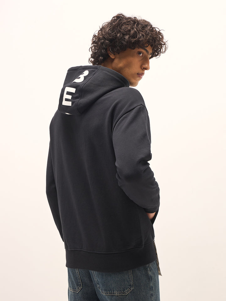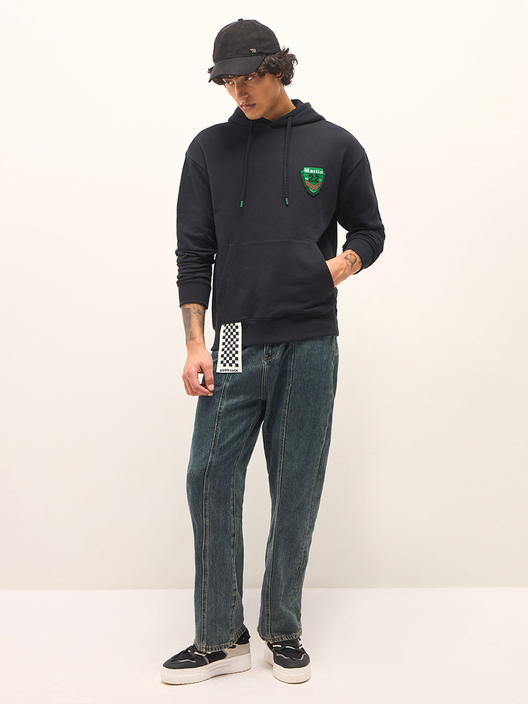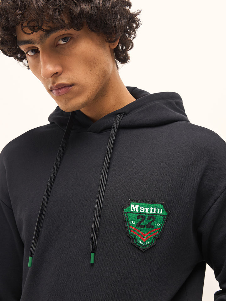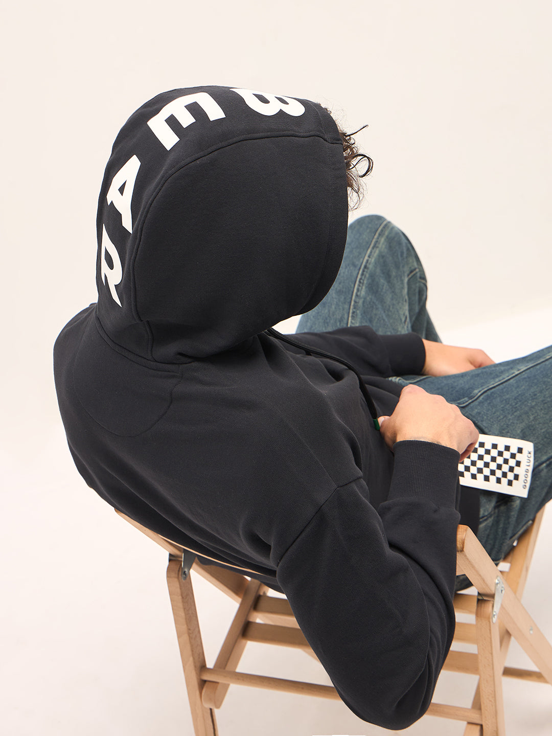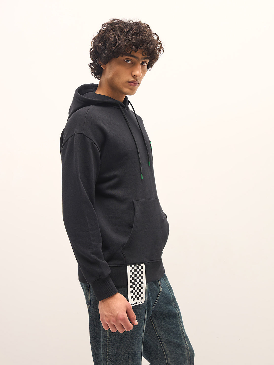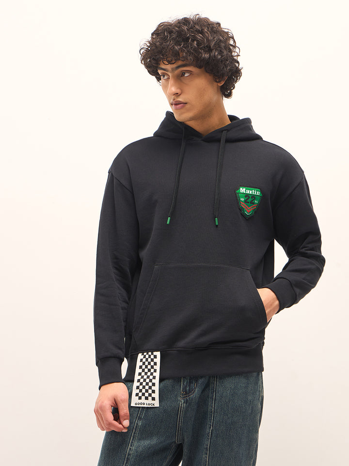 Black Relaxed Fit Hoodie with Embroidered Chest Patch and Bold Hood Typography