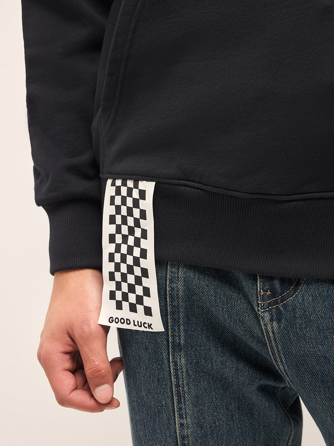 - Design: Embroidered chest patch with "Martin 24/7" text, "GOOD LUCK" checkered woven label at the hem, and bold typography on the hood.