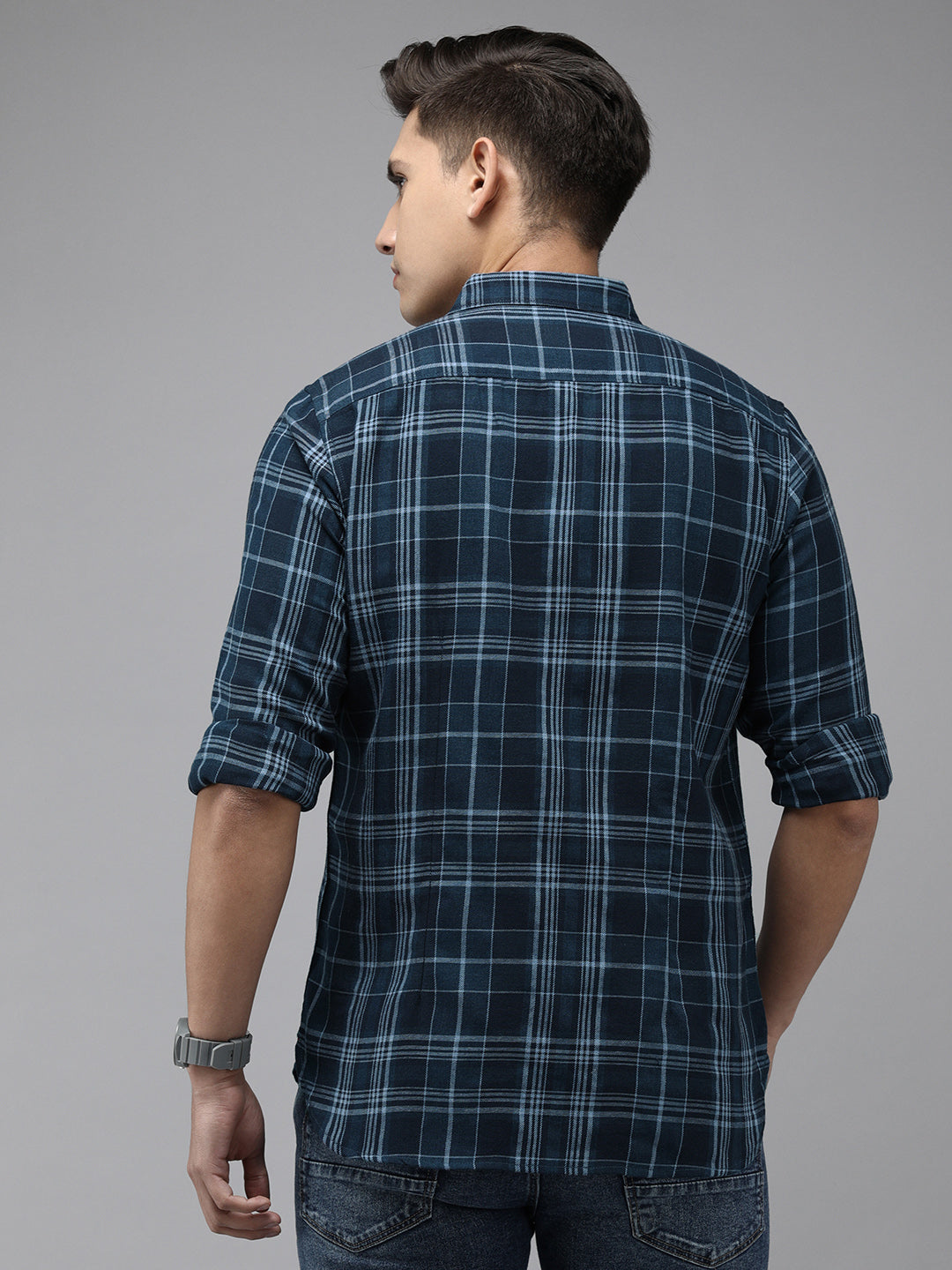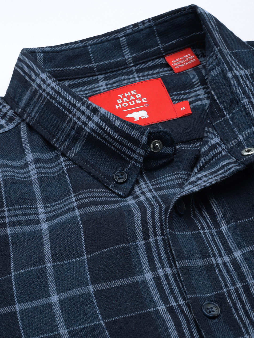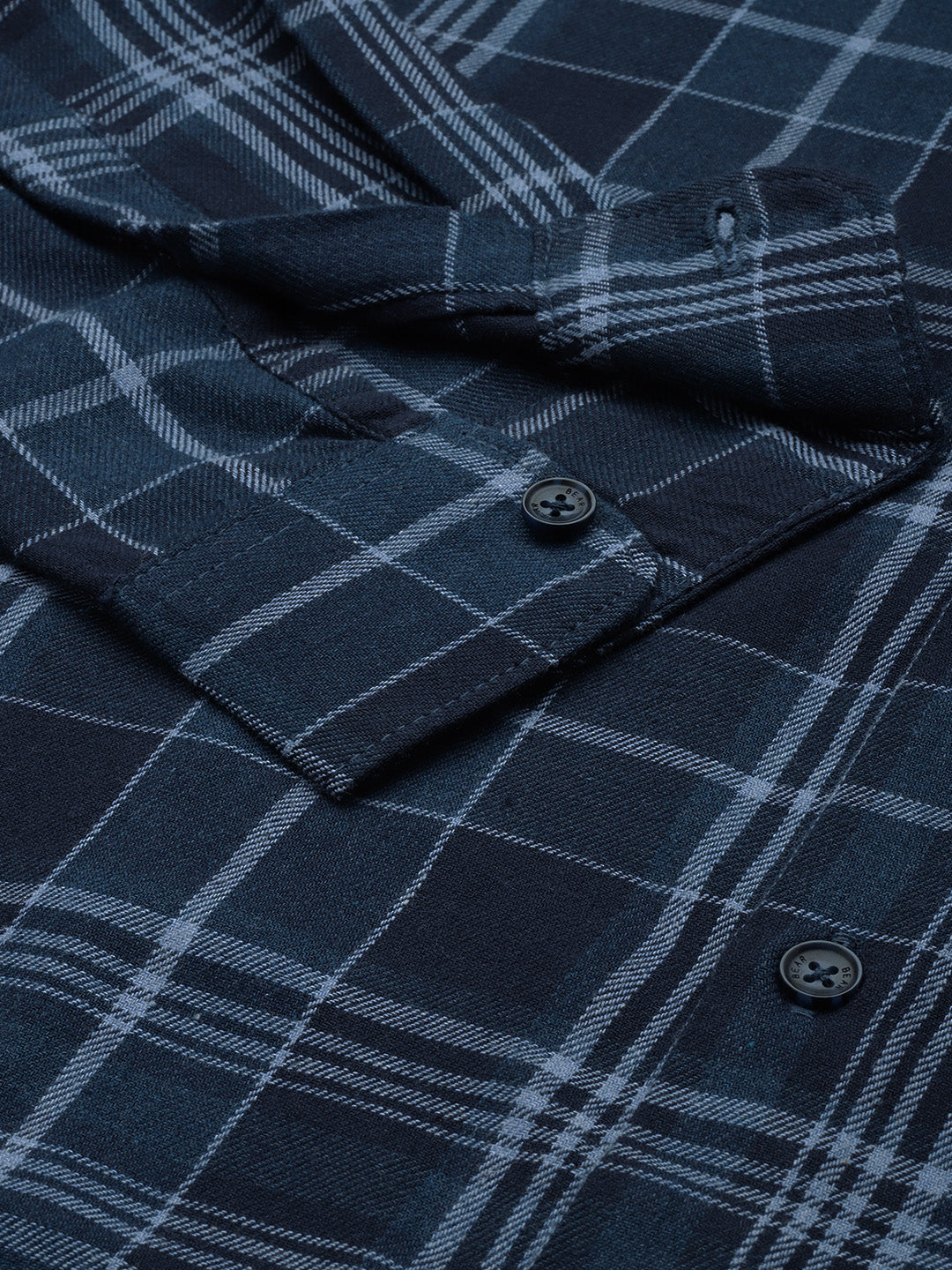 Men Navy Blue Tartan Checked Slim Fit Flannel Cotton Casual Shirt