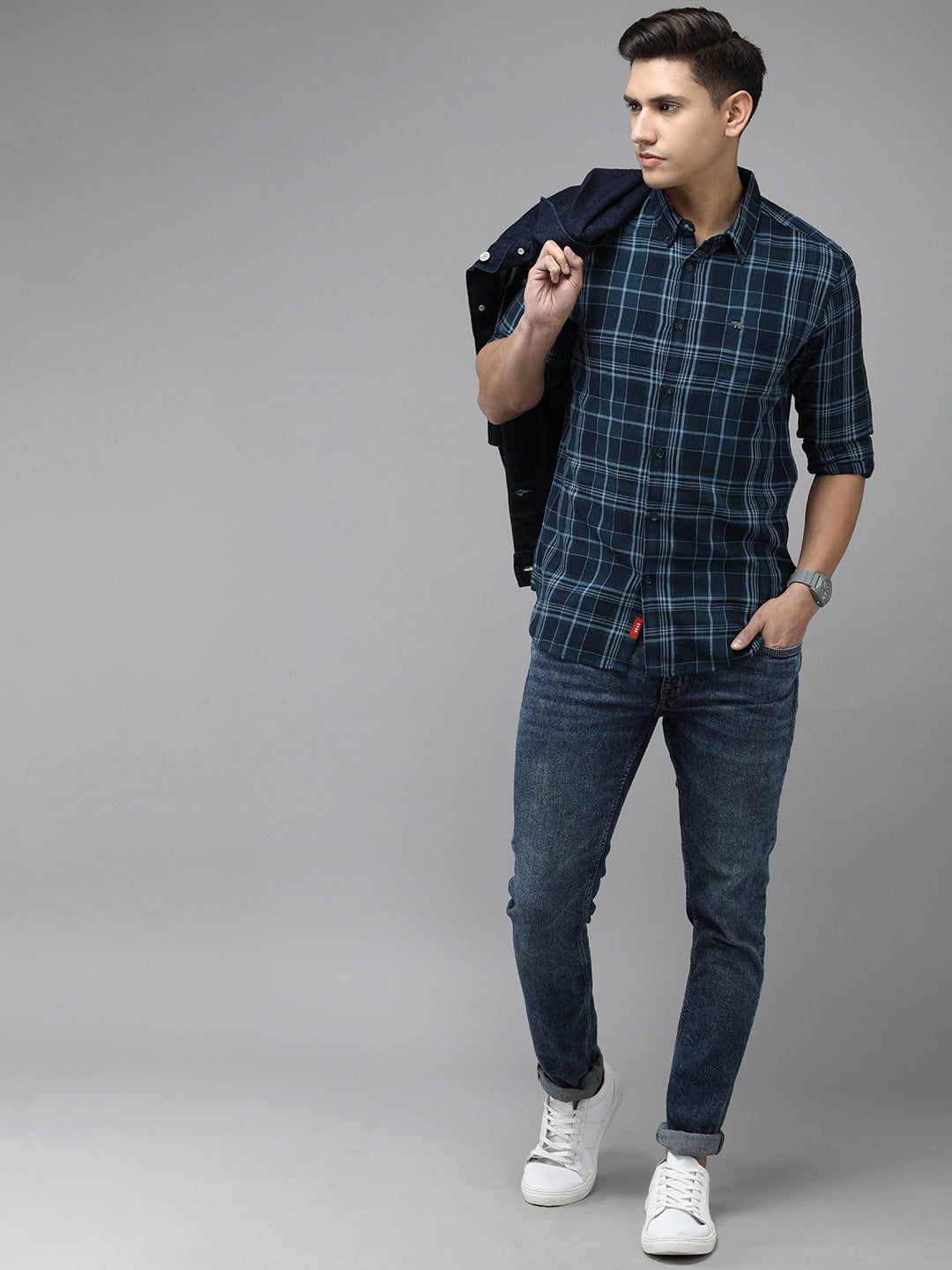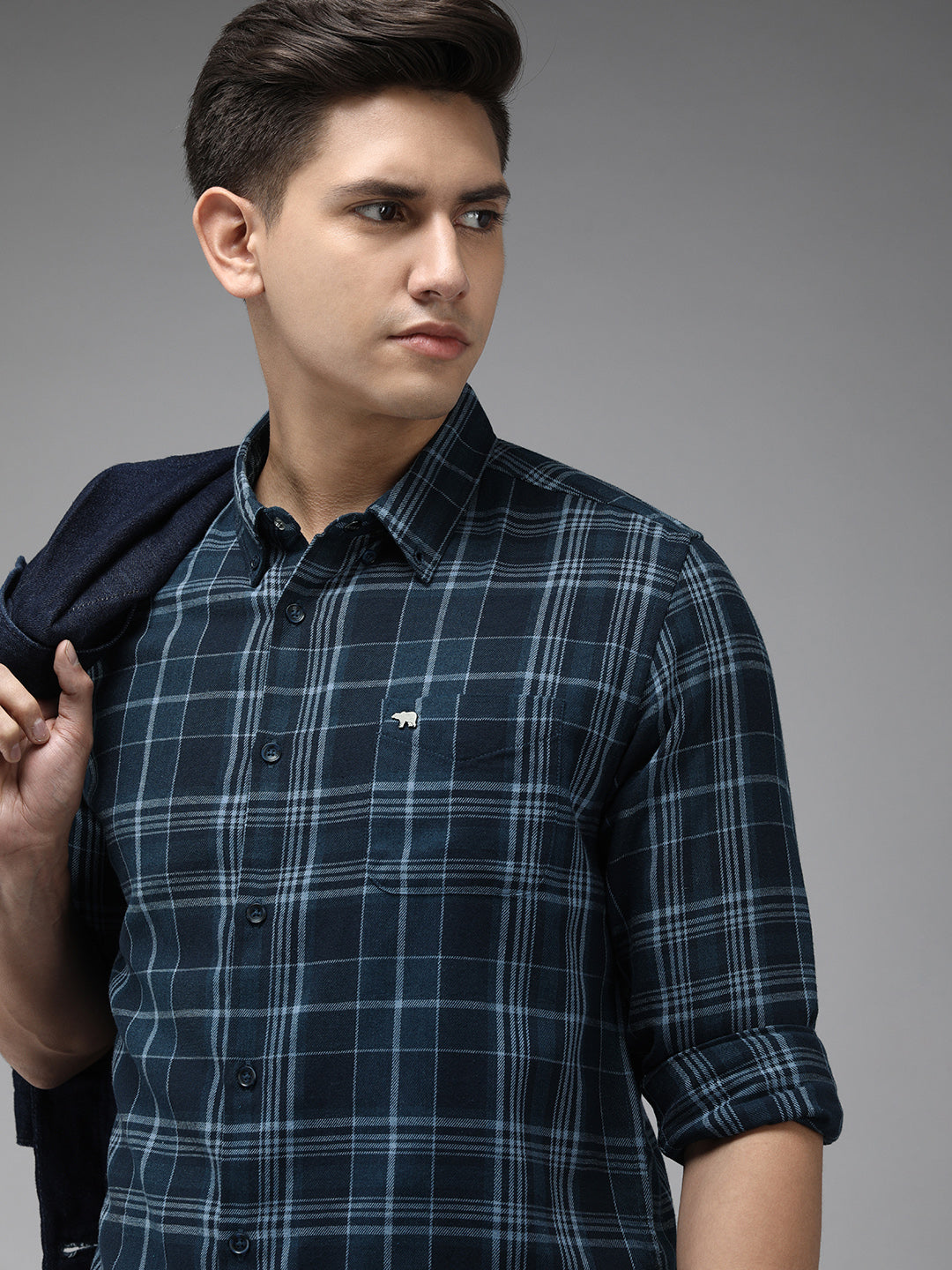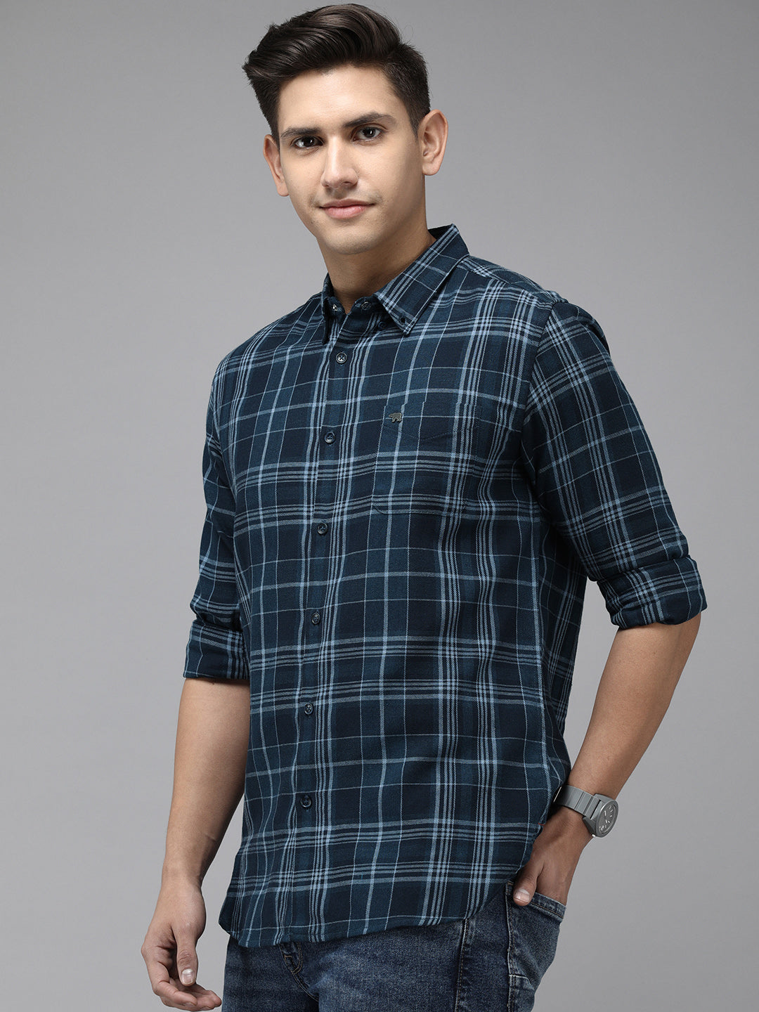 Men Navy Blue Tartan Checked Slim Fit Flannel Cotton Casual Shirt