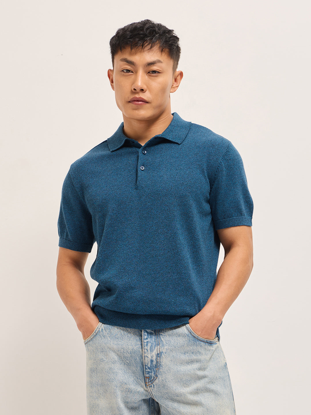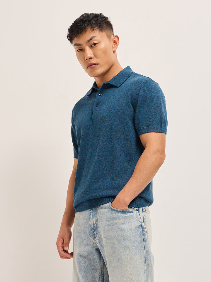 Teal Blue Textured Knit Solid Regular Fit Polo