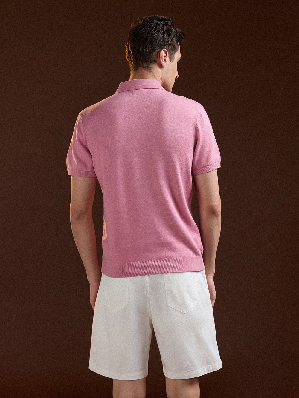 Pink Textured Knit Design Regular Fit Polo with Zipper Placket