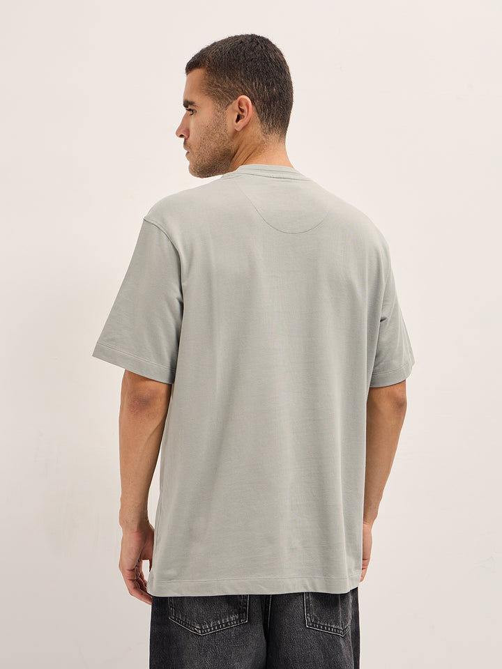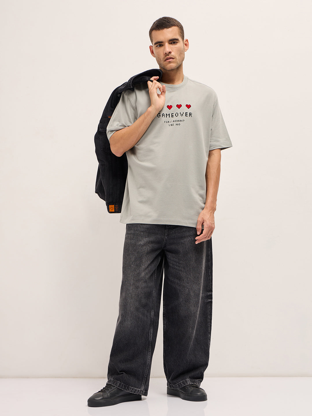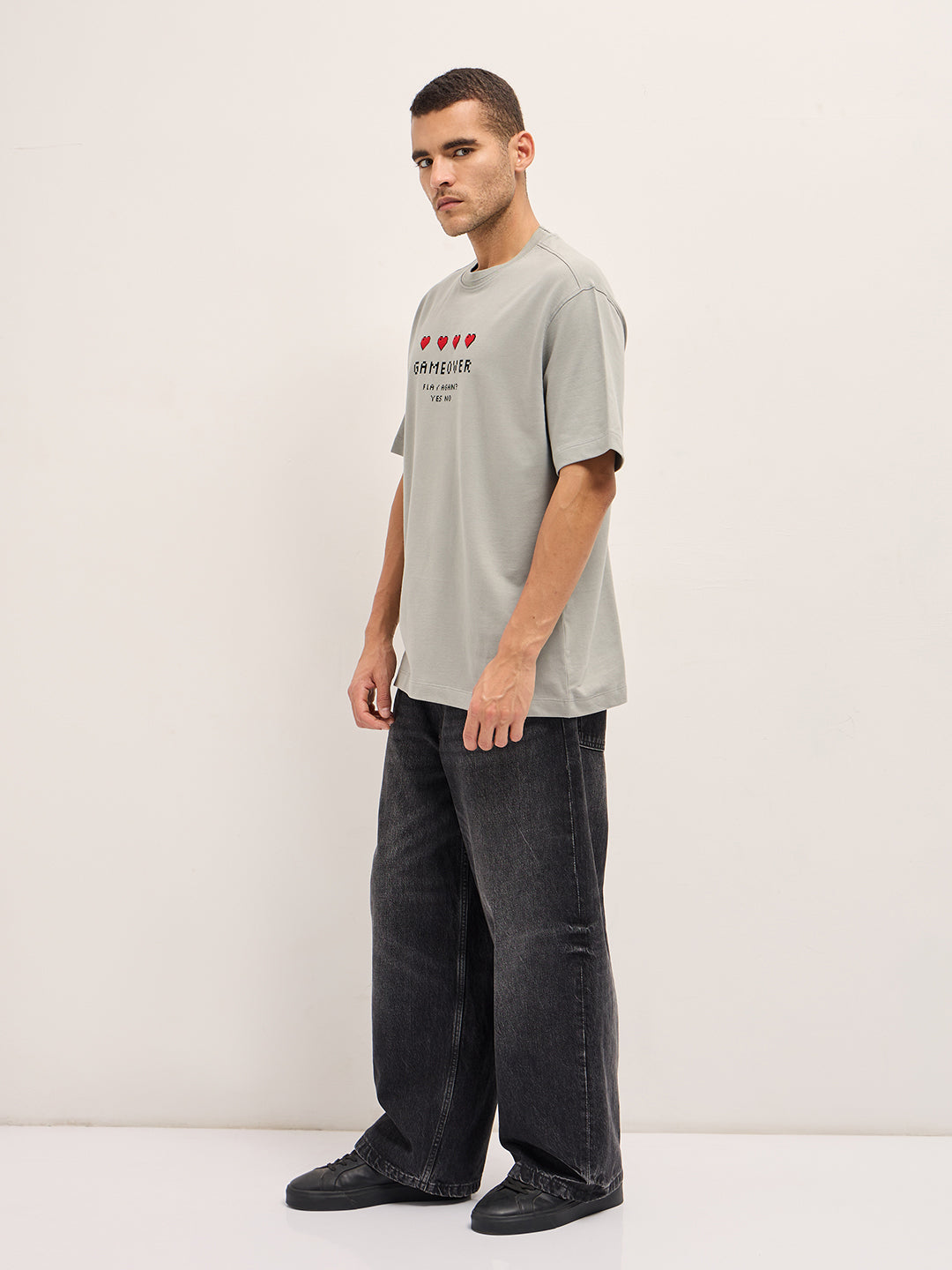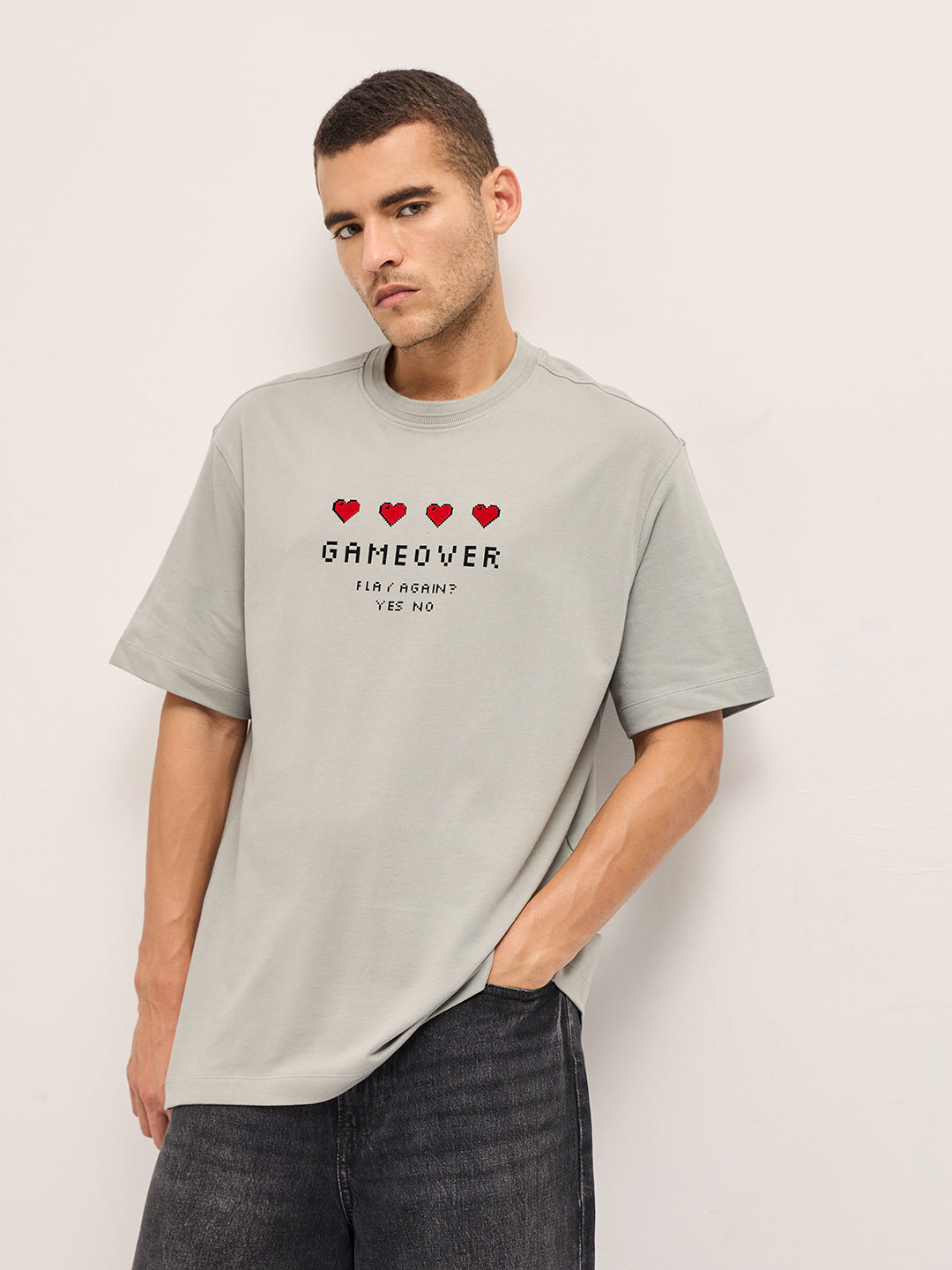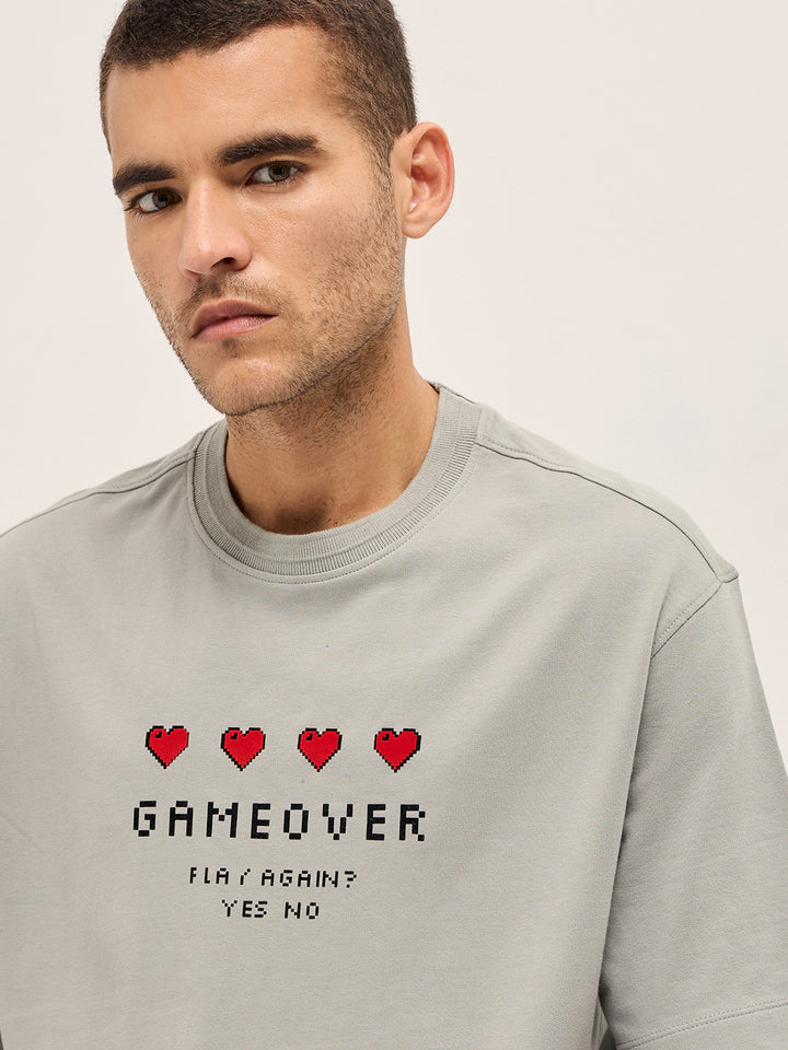 Grey Pixel Hearts with Graphic Printed Oversize Crew Neck T-shirt