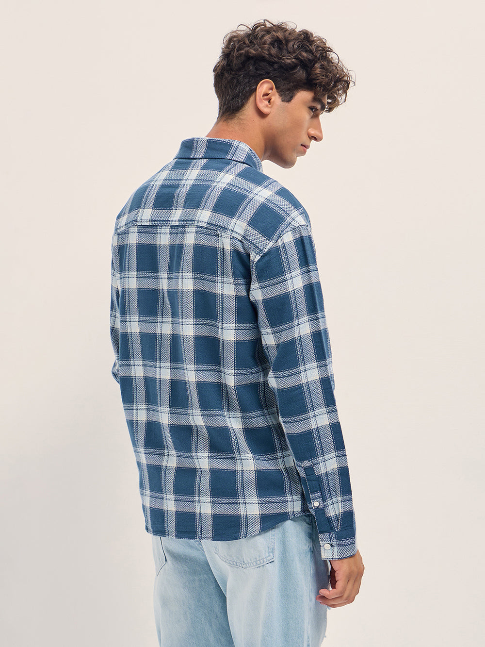Blue and White Waffle Checked Textured Relaxed Fit Casual Shirt