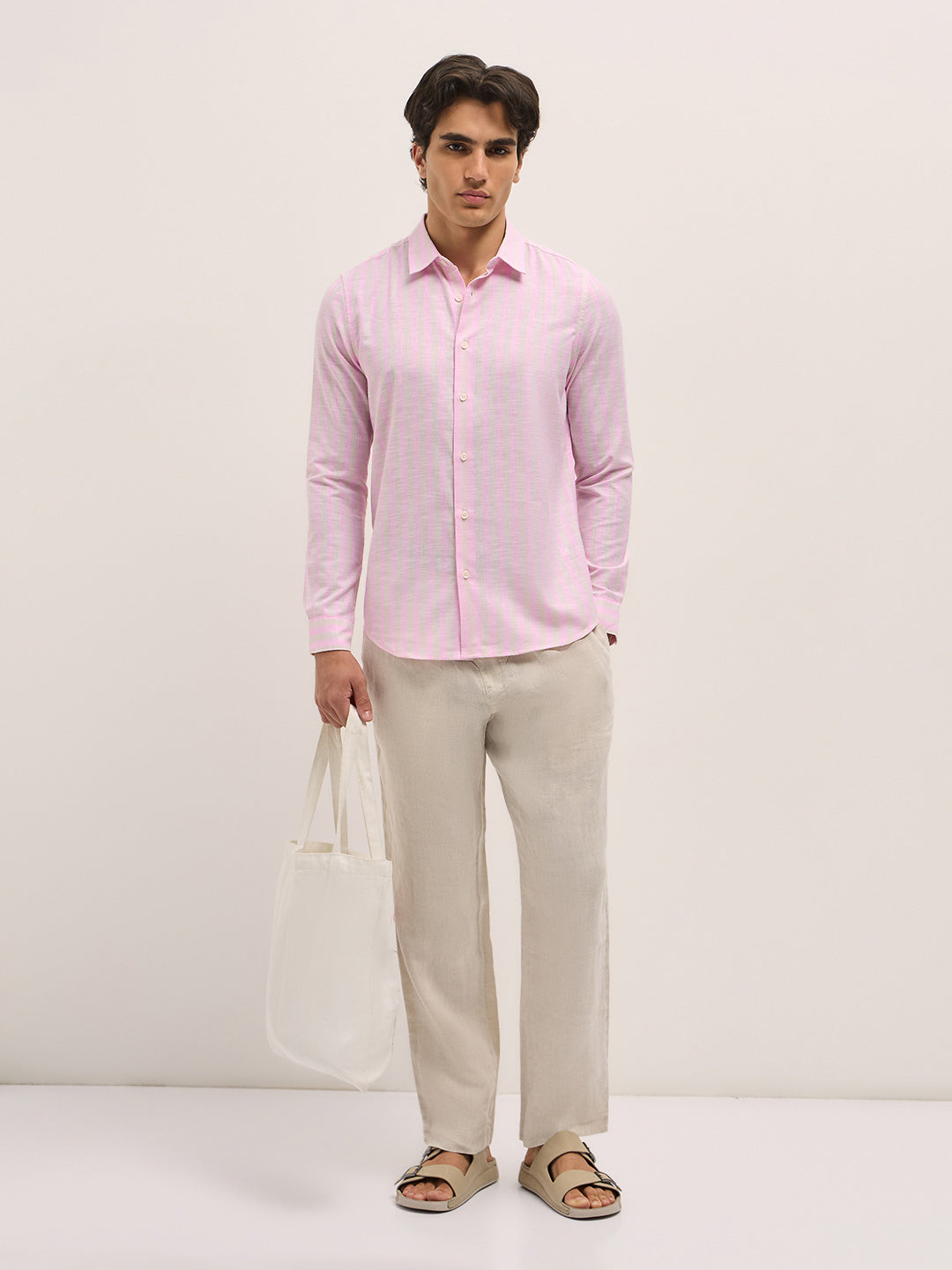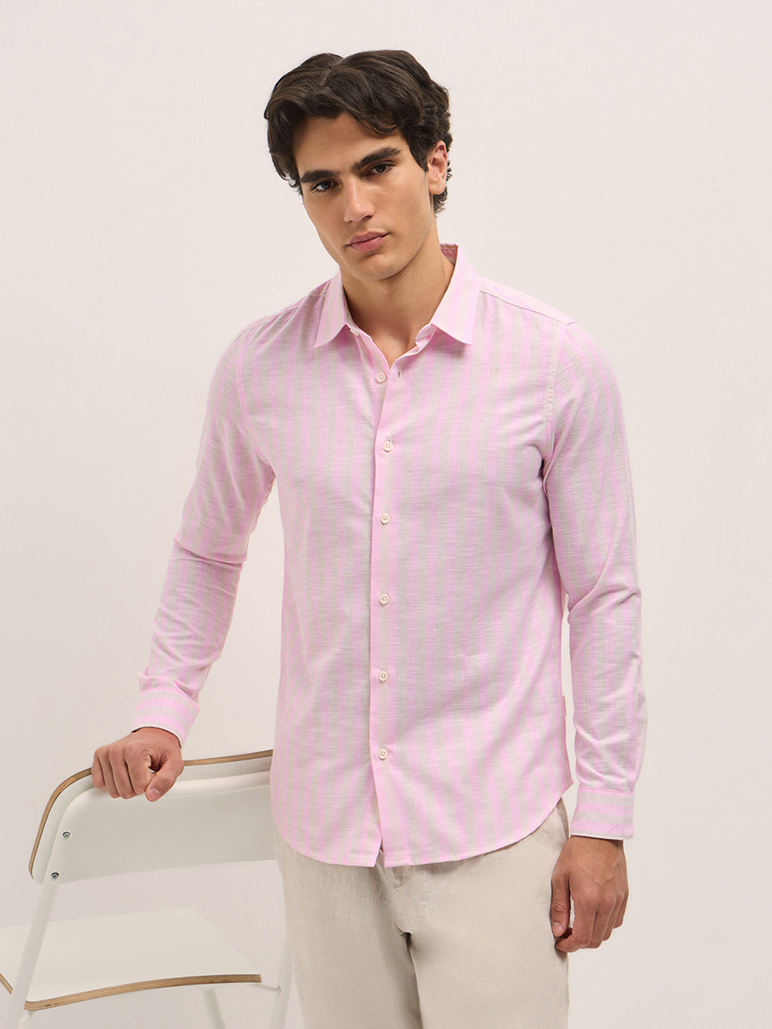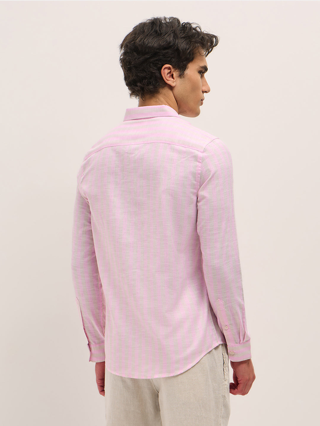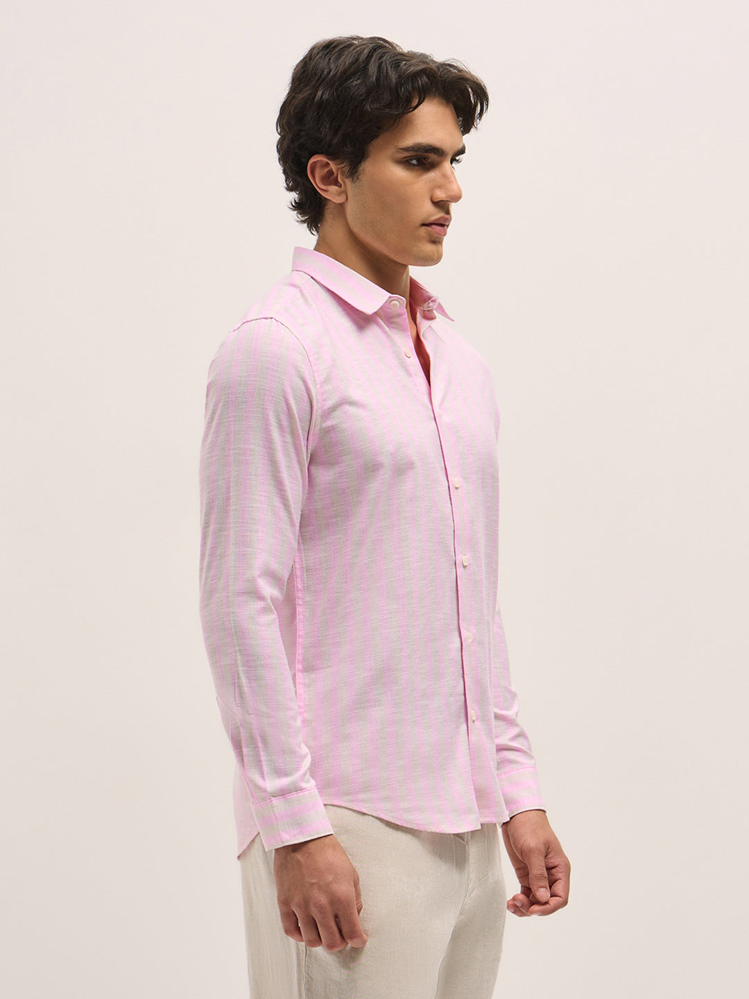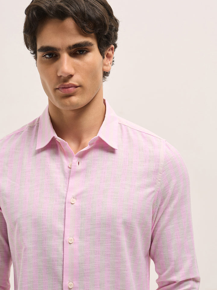 Pink with Beige Vertical Stripes Slim Fit Casual Shirt