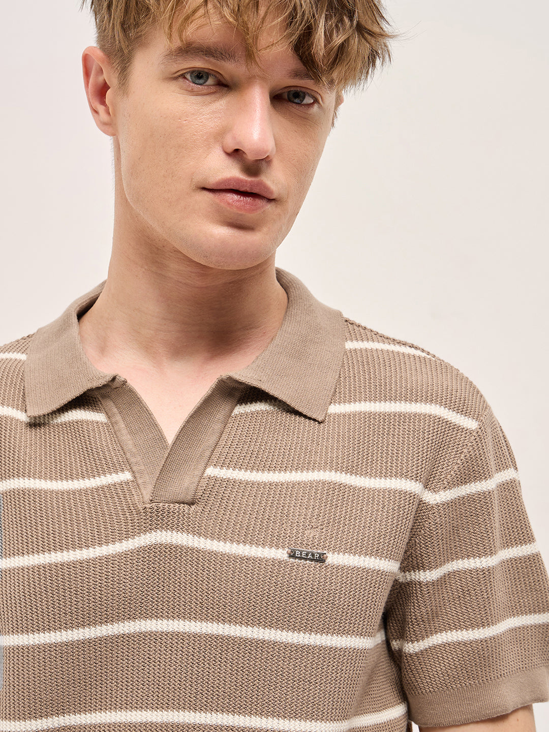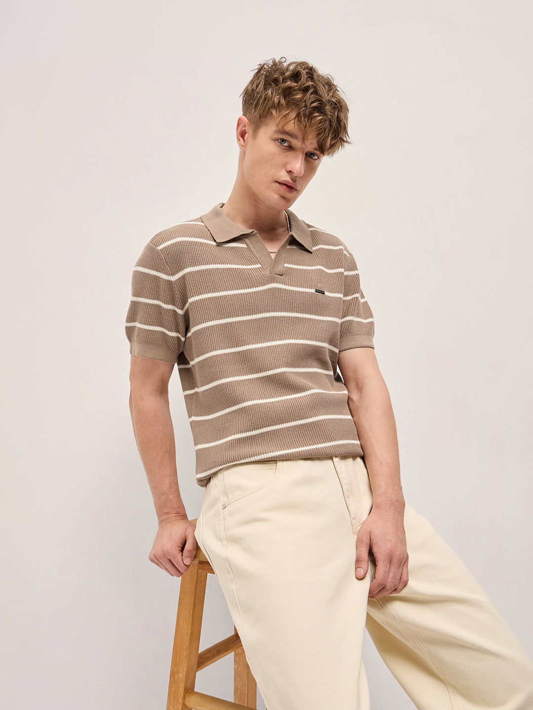 Brown Texture Horizontal Stripes Slim Fit Polo