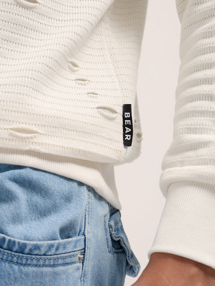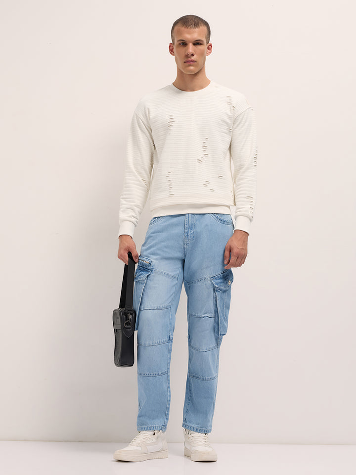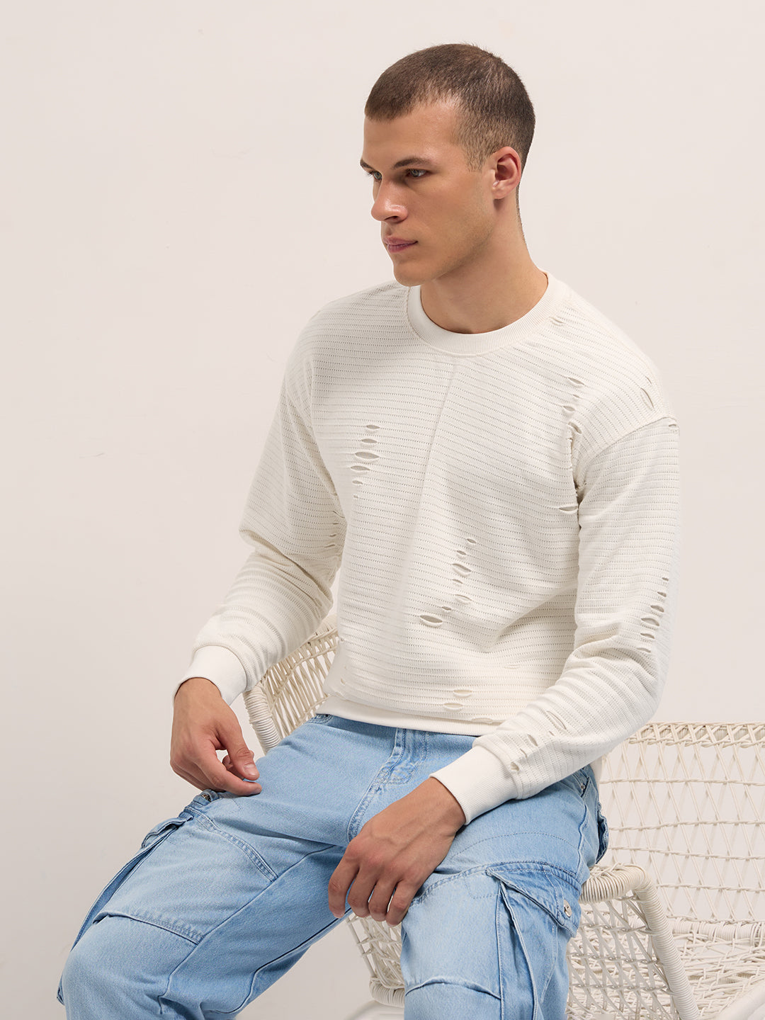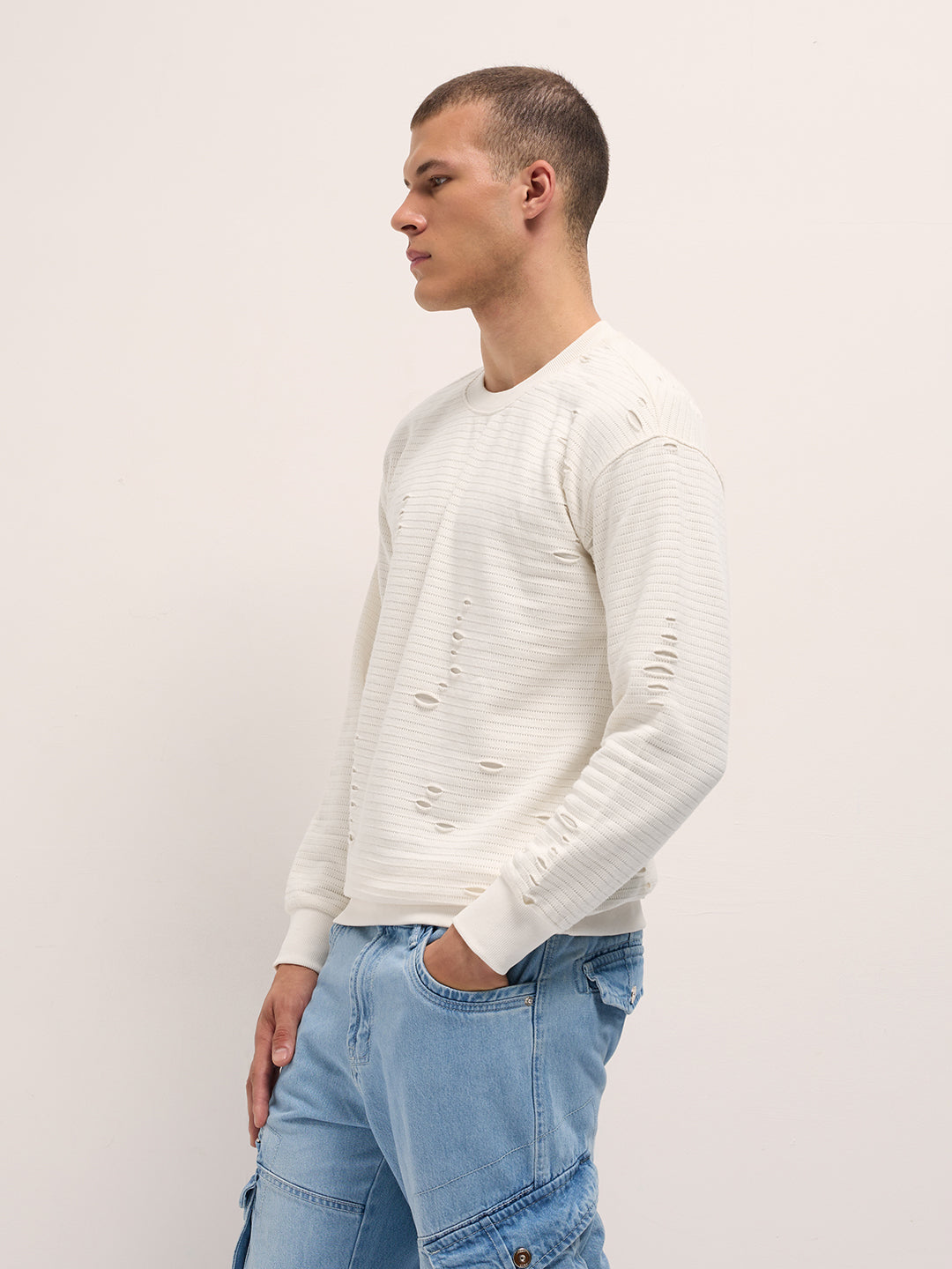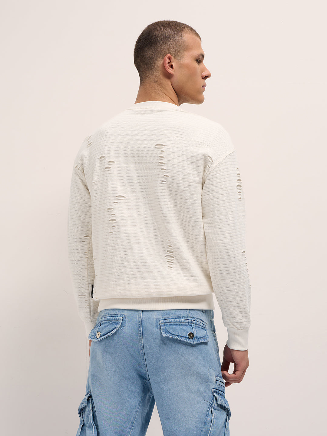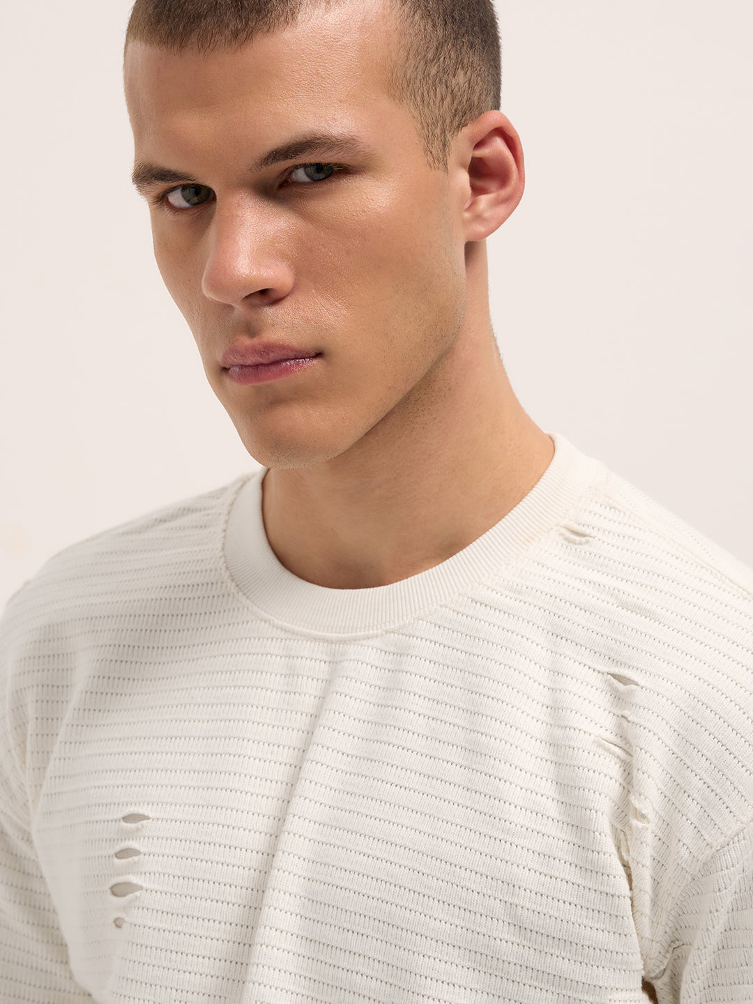 White Regular Fit Crew Neck T-Shirt with All-Over Distressed Detailing