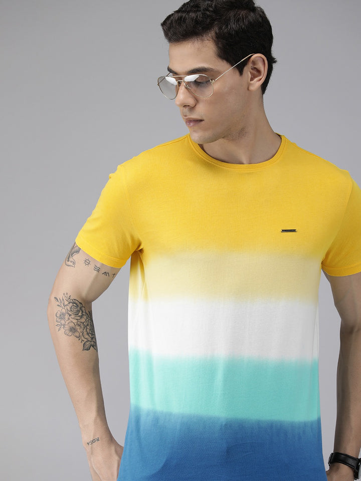 Men Yellow & Blue Pure Cotton Tie and Dye Printed Slim Fit T-shirt