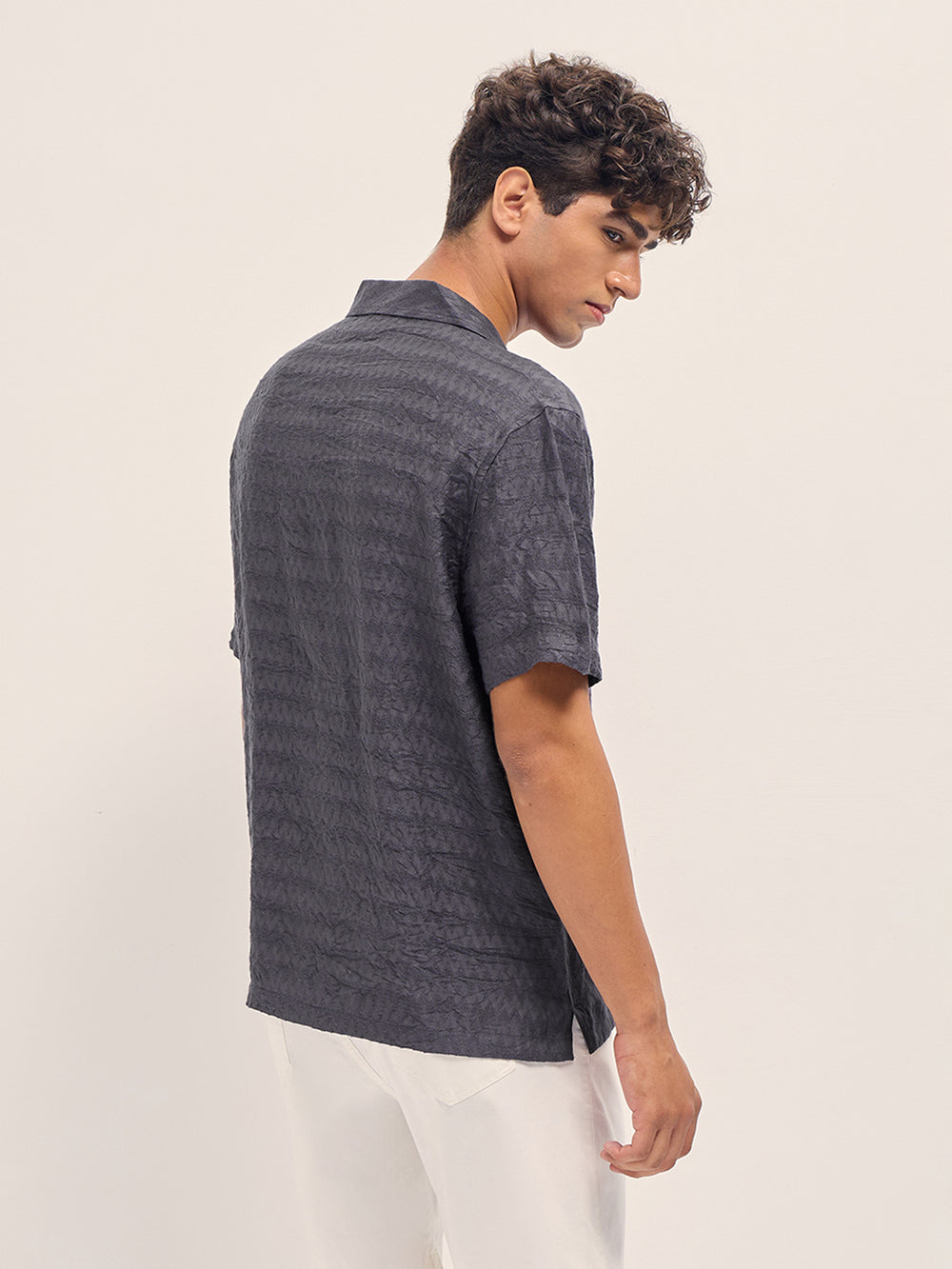 Grey Zigzag Textured Weave Relaxed Fit Half Sleeve Casual Shirt