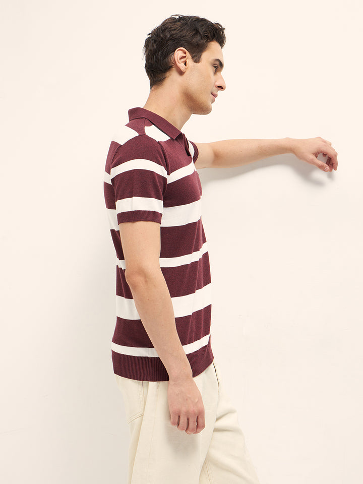 Maroon and White Horizontal Stripes Slim Fit Polo