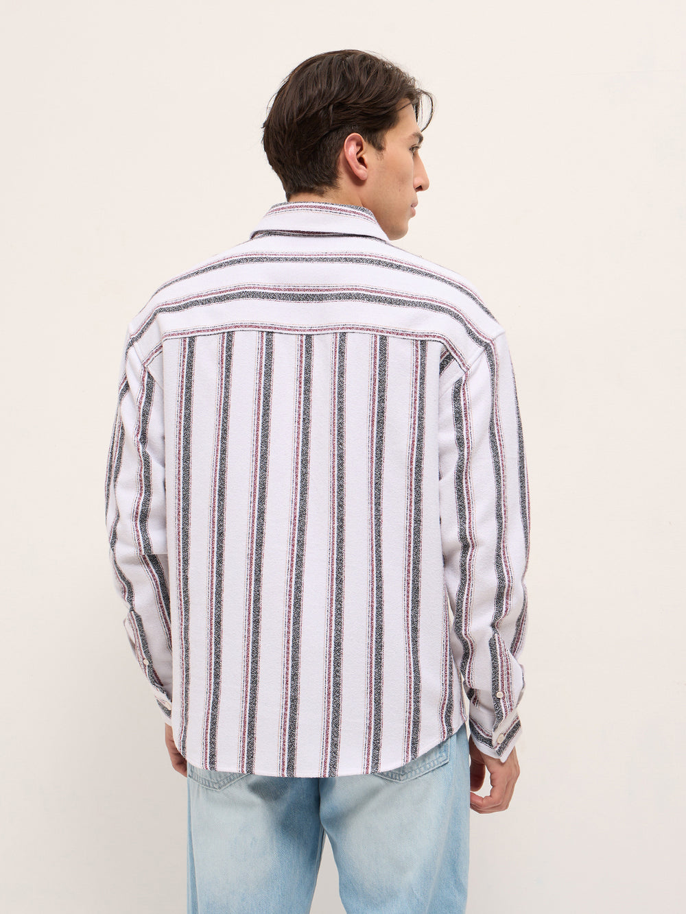 White Woven Vertical Stripe Design Relax Fit Overshirt