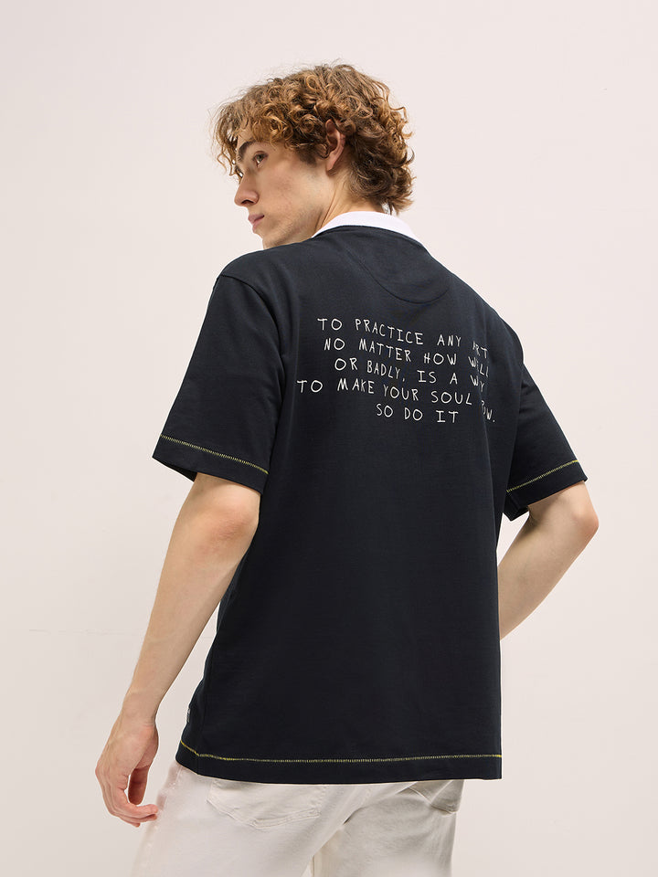 - Design: Features a bold "ARTIST" patch on the chest and an inspiring handwritten quote on the back: "TO PRACTICE ANY ART... IS A WAY TO MAKE YOUR SOUL GROW." It has a dark base, contrasting sleeve stitching, and a minimalist design.