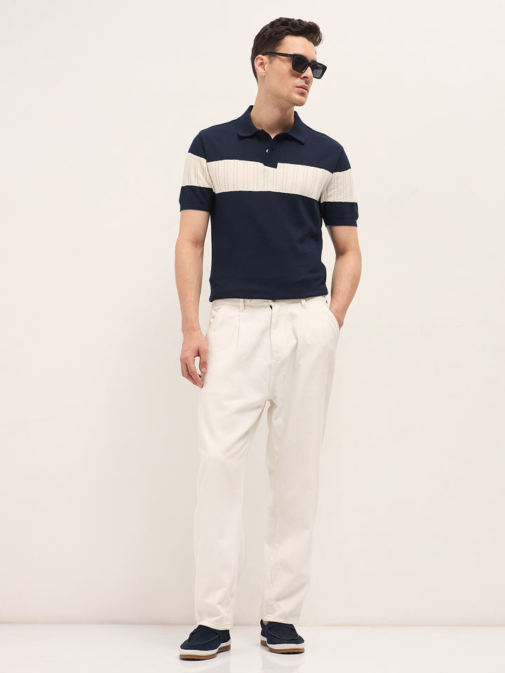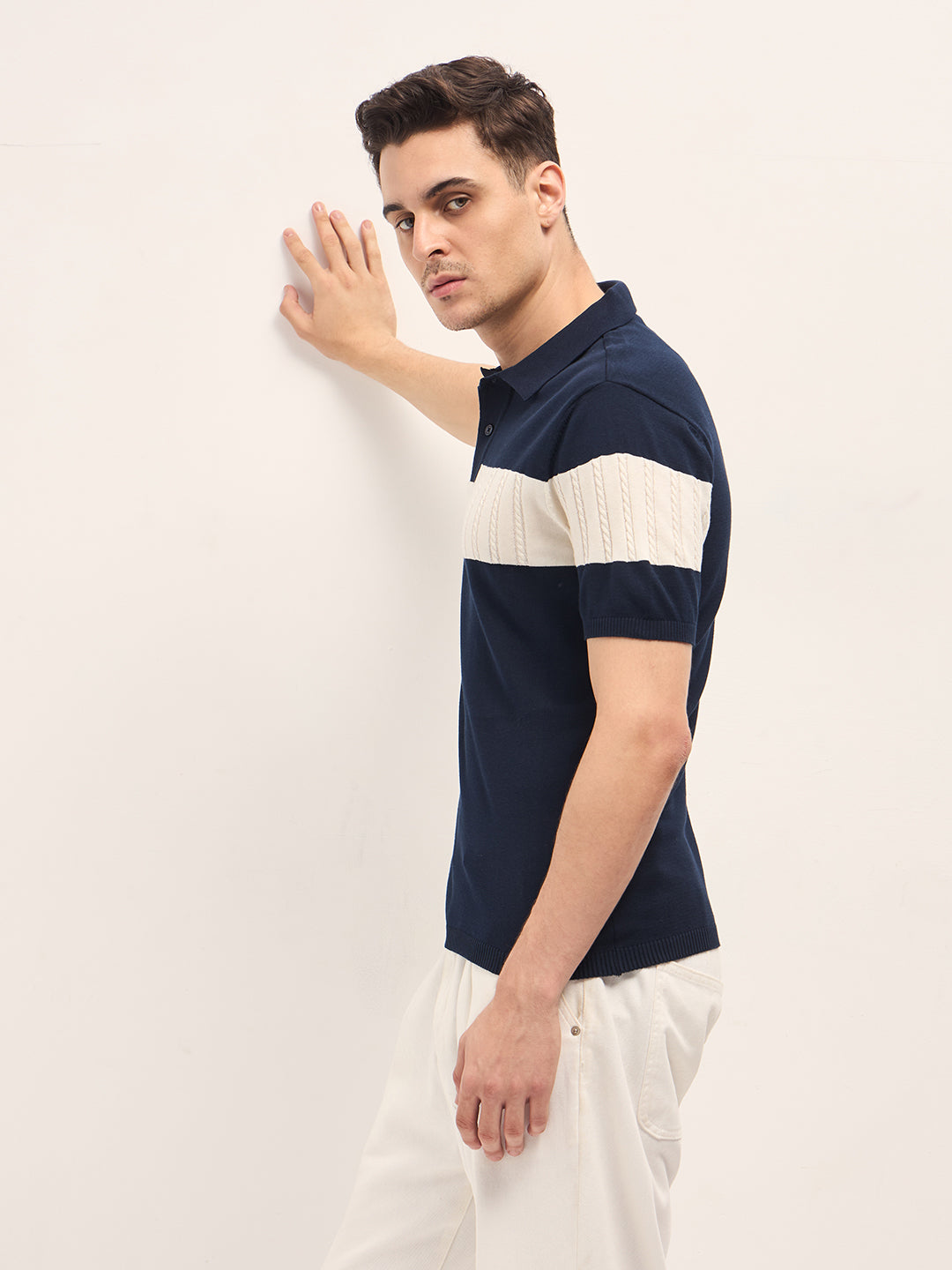 Blue Cable-Knit Textured Stripe Slim Fit Polo