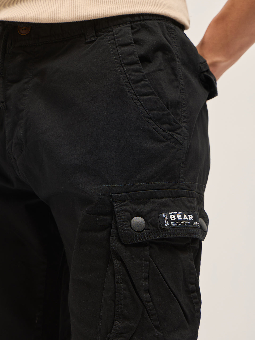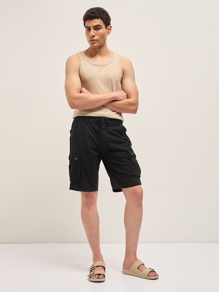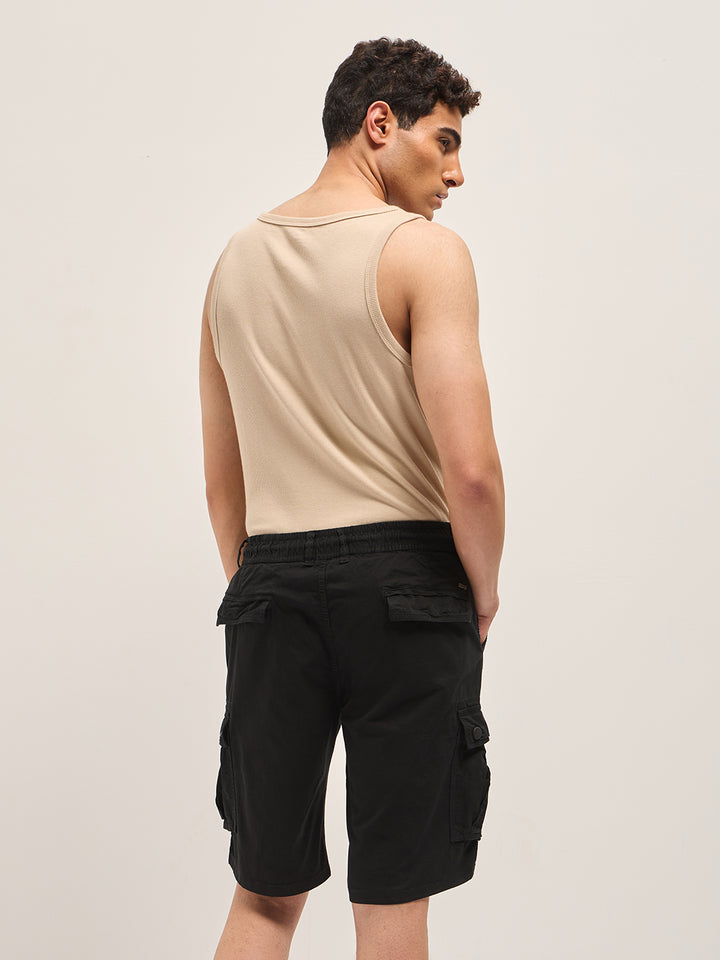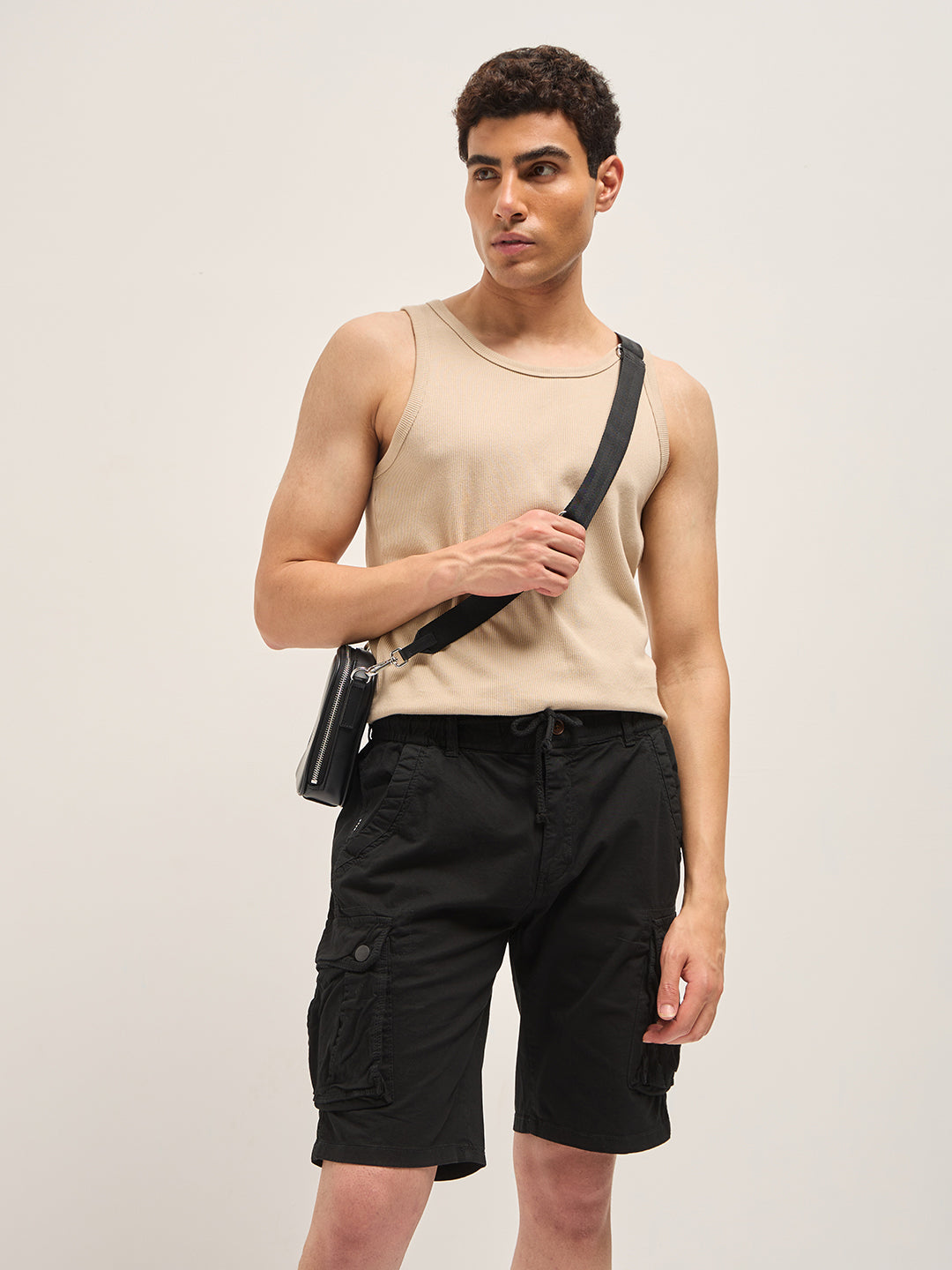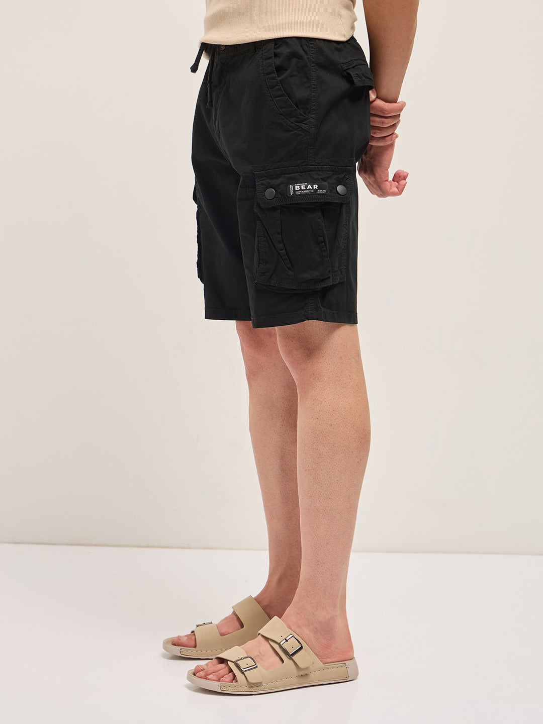 Black Solid Cotton Cargo Shorts with Multiple Utility Pockets