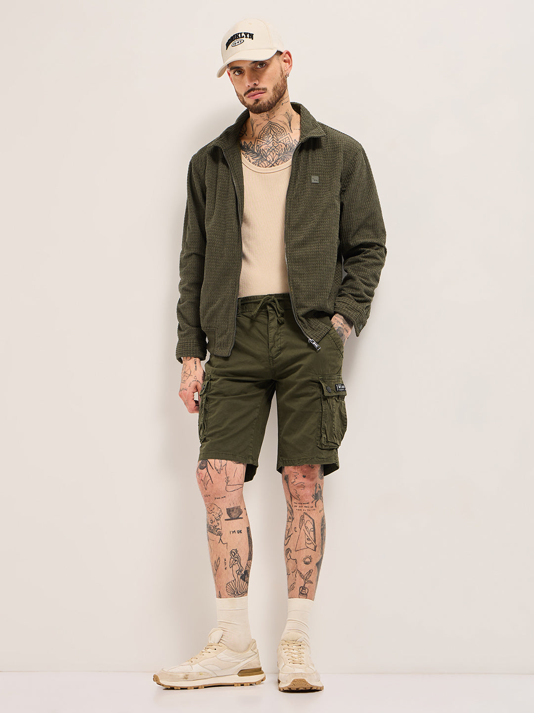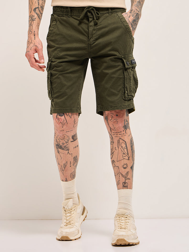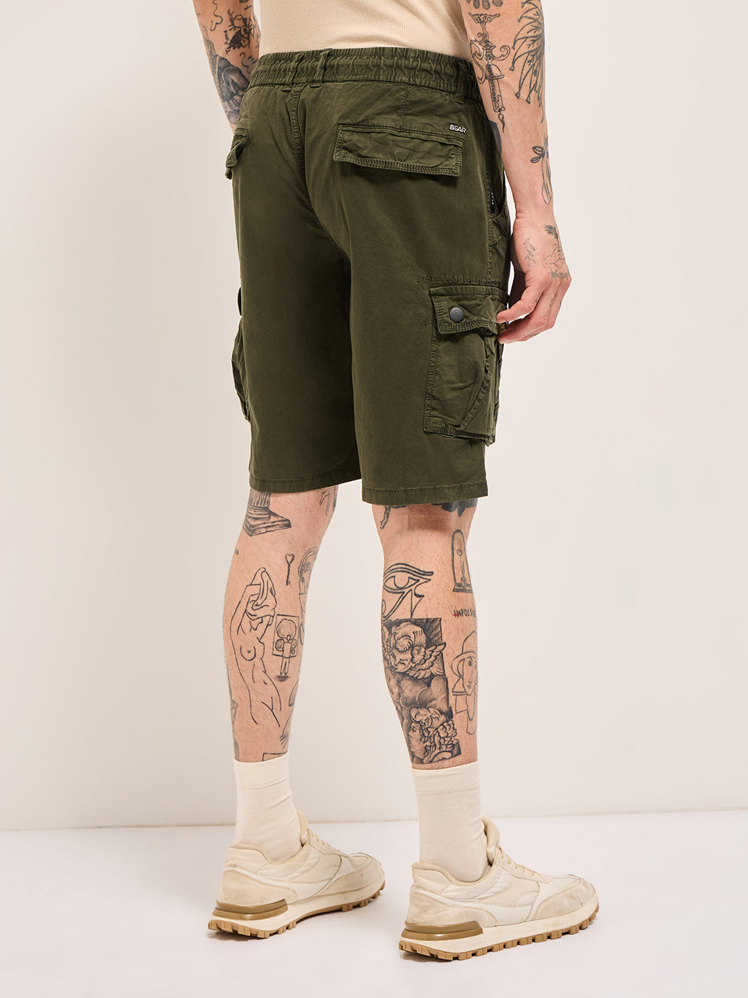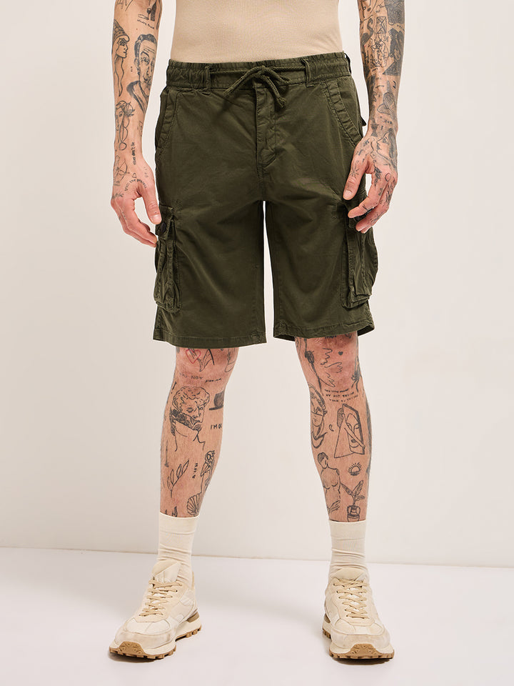 Olive Solid Cotton Cargo Shorts with Multiple Utility Pockets