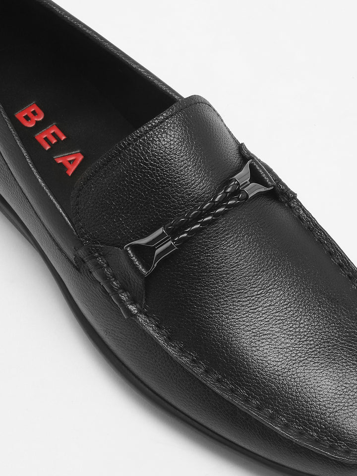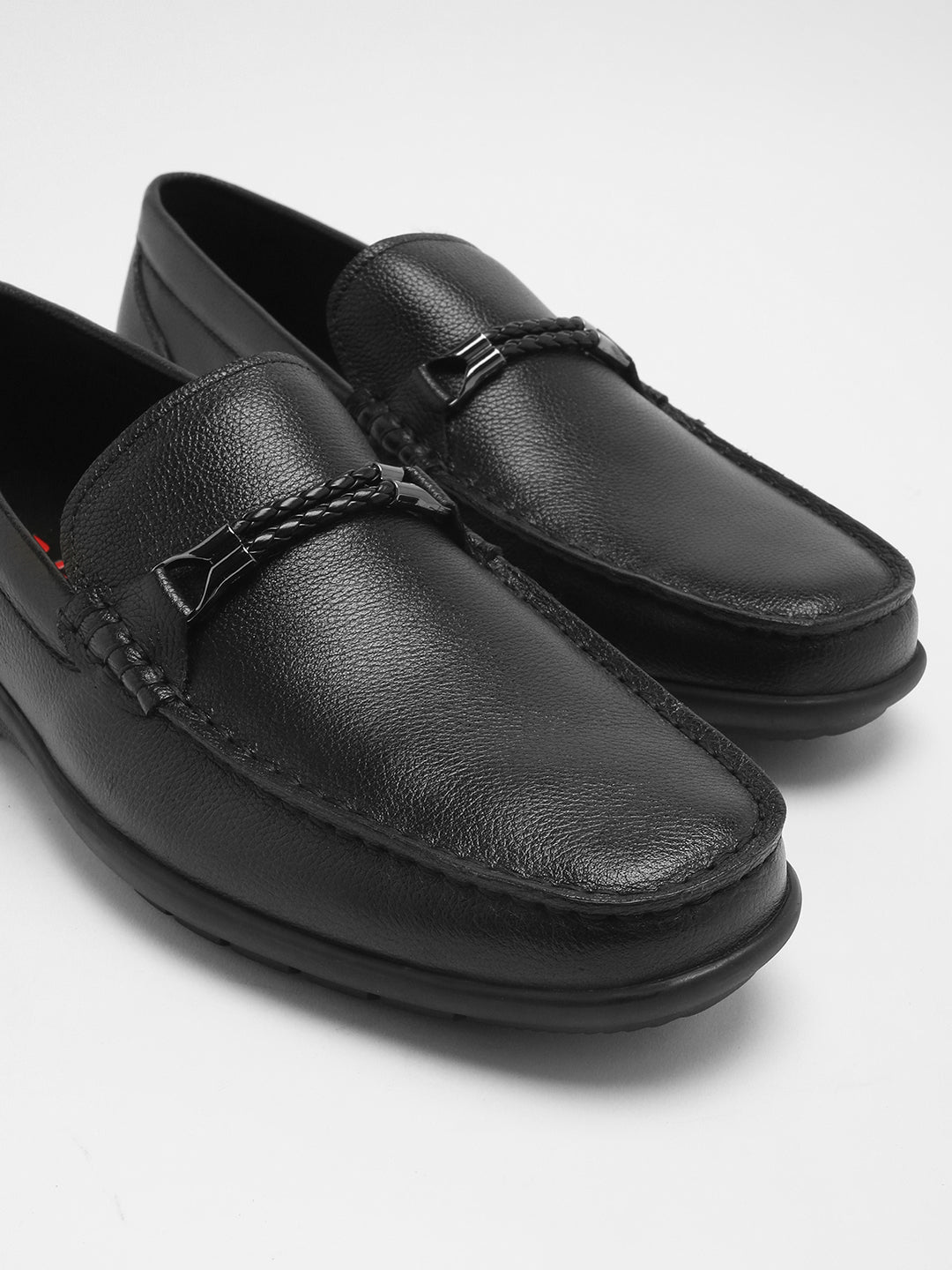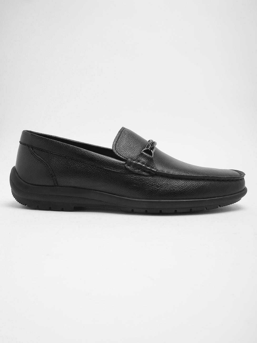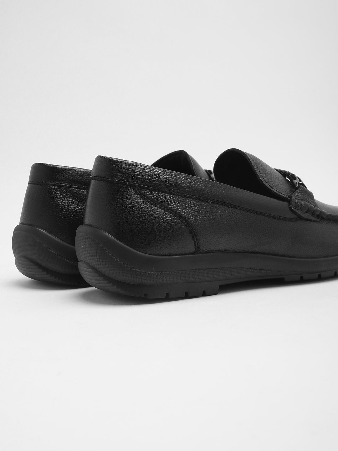 If you're someone who loves sophistication and elegance, then this loafers may be just the thing you need! Despite its simple style, this black textured leather loafer featuring black metal horse-bit detail is a classy item, perfect for dressing up an outfit.