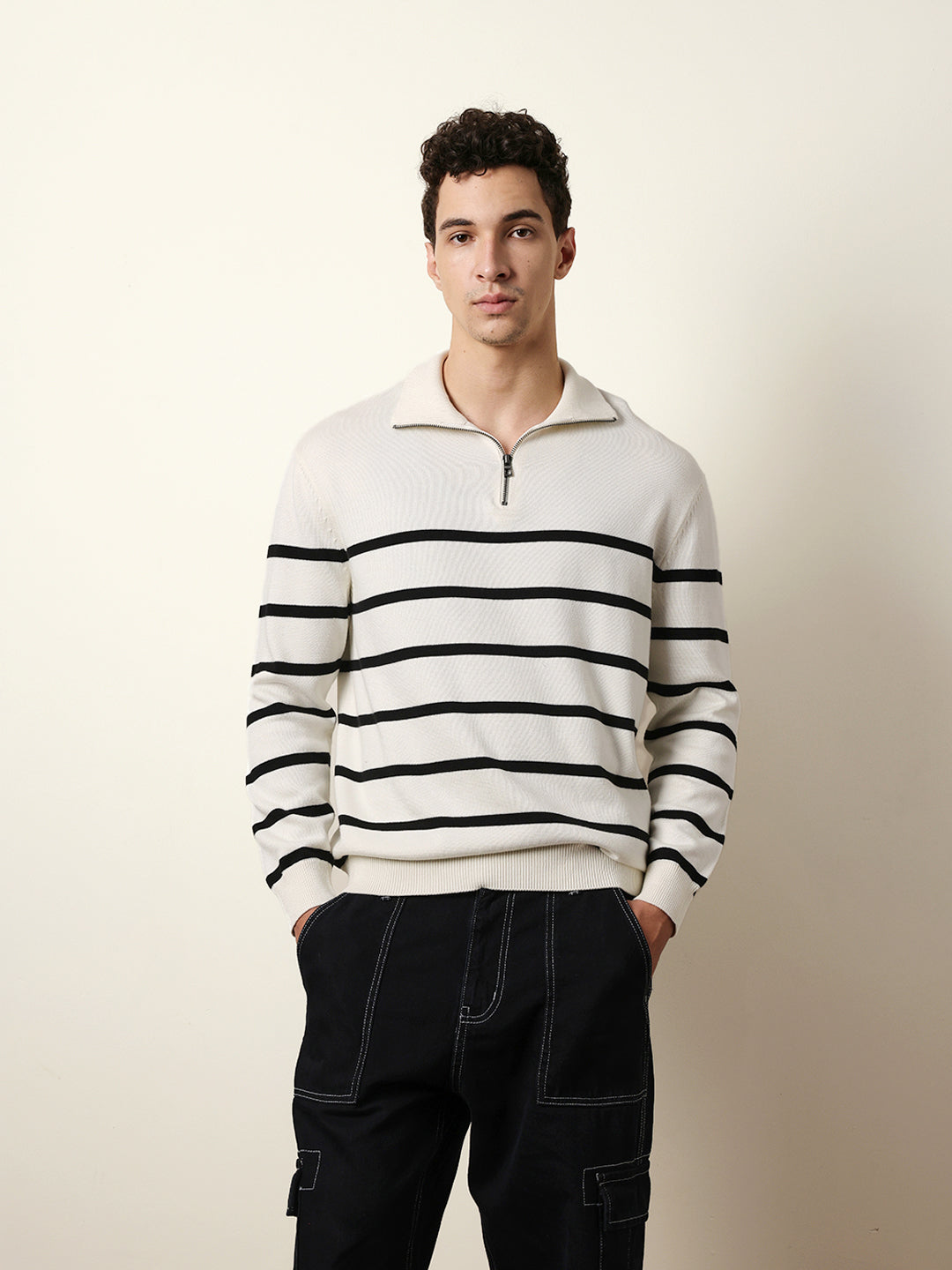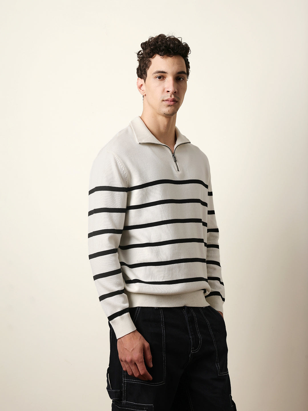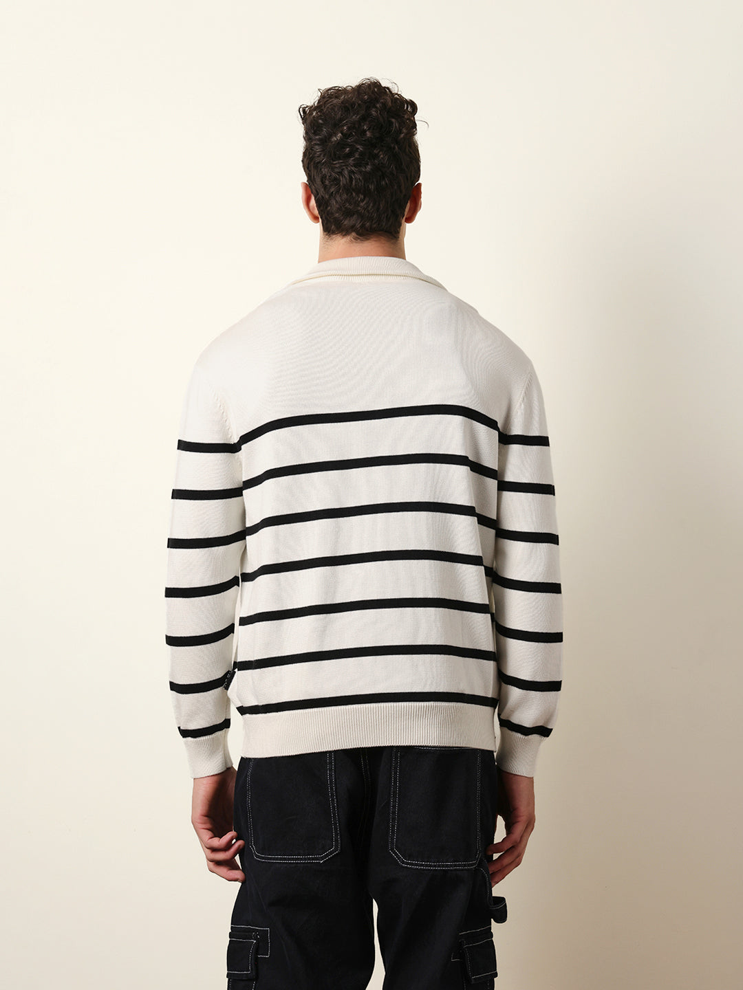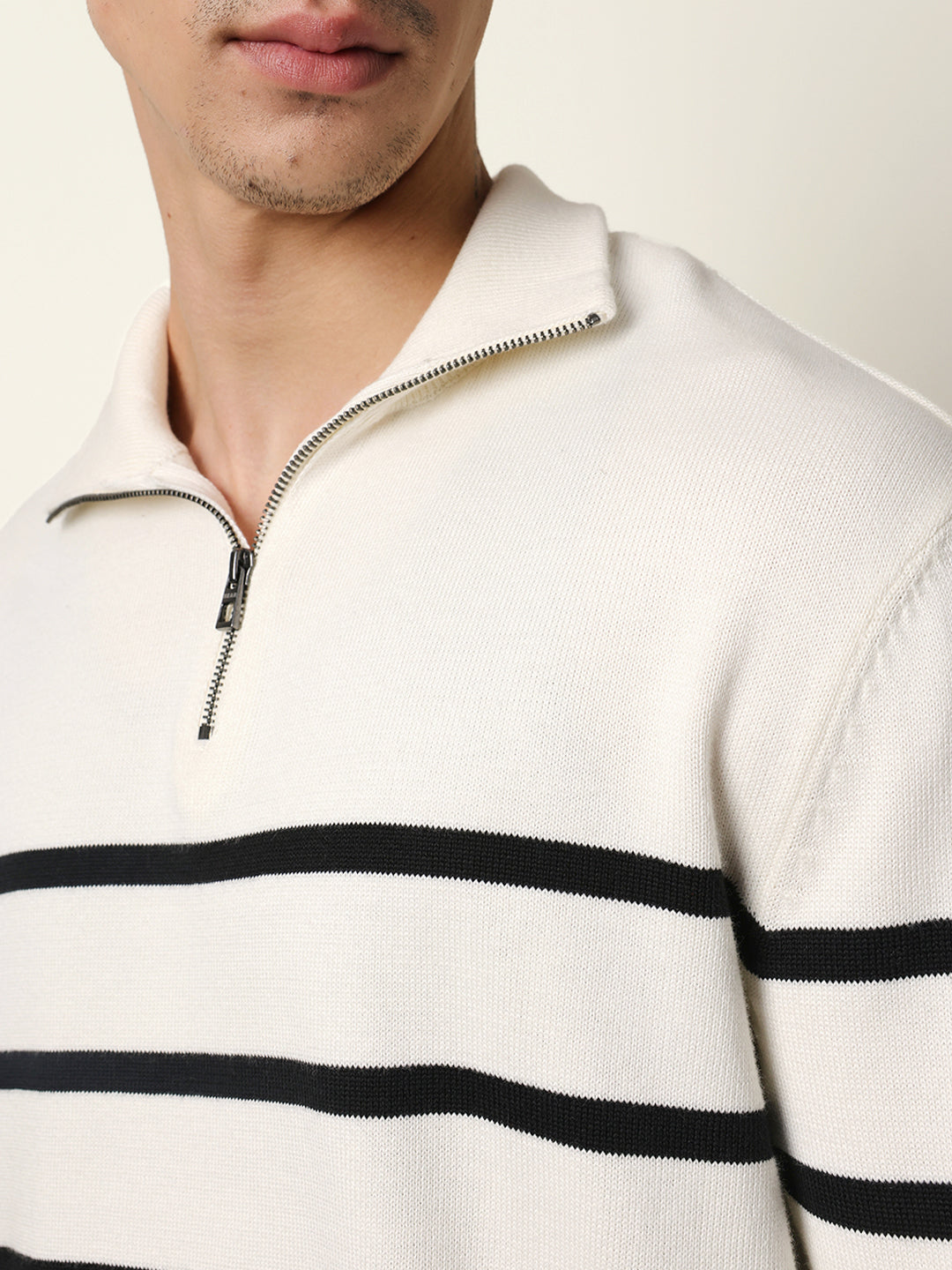 Shop White Relaxed Fit High-Neck Knitted Sweatshirt with Classic Stripe Design Online