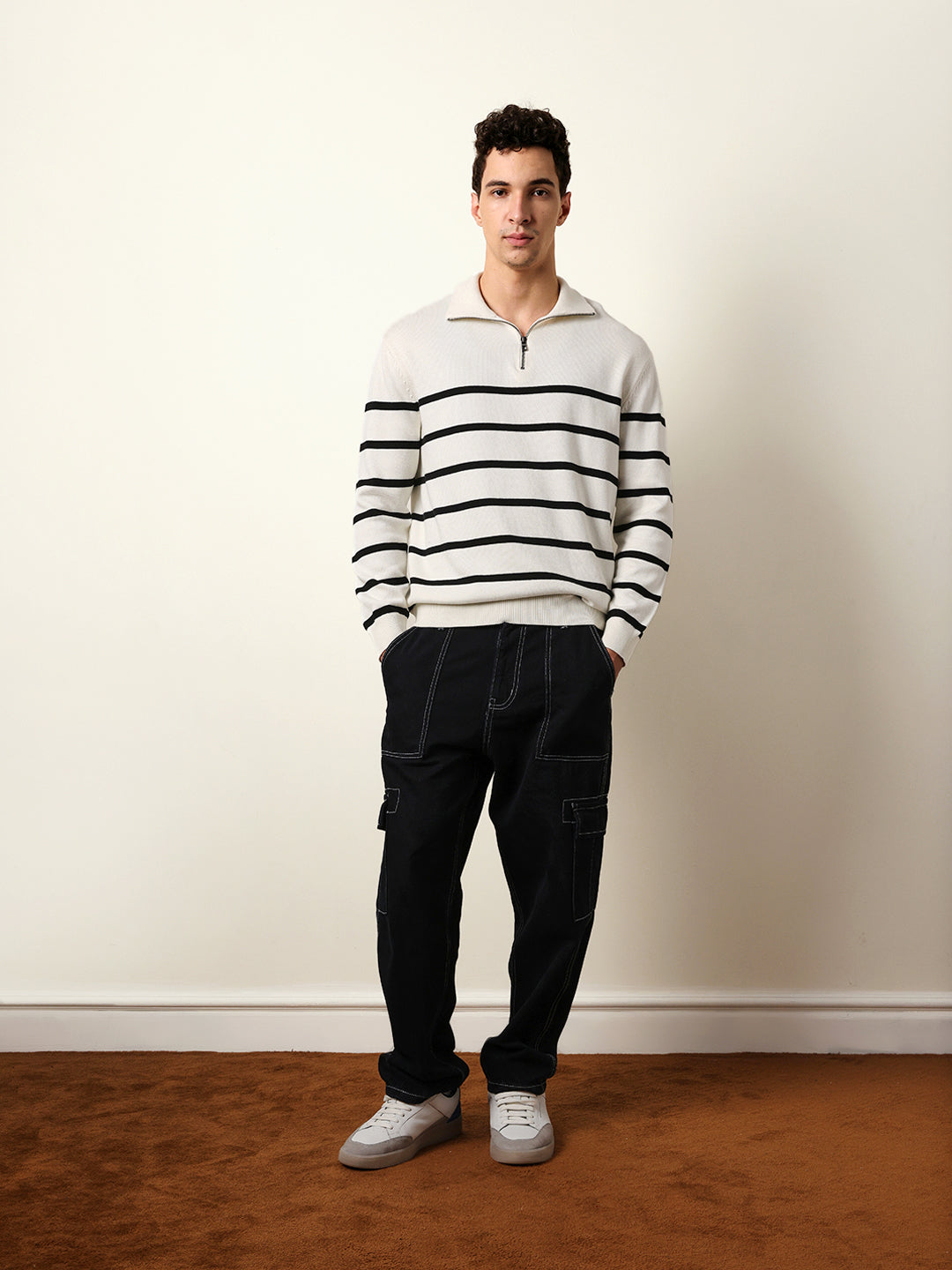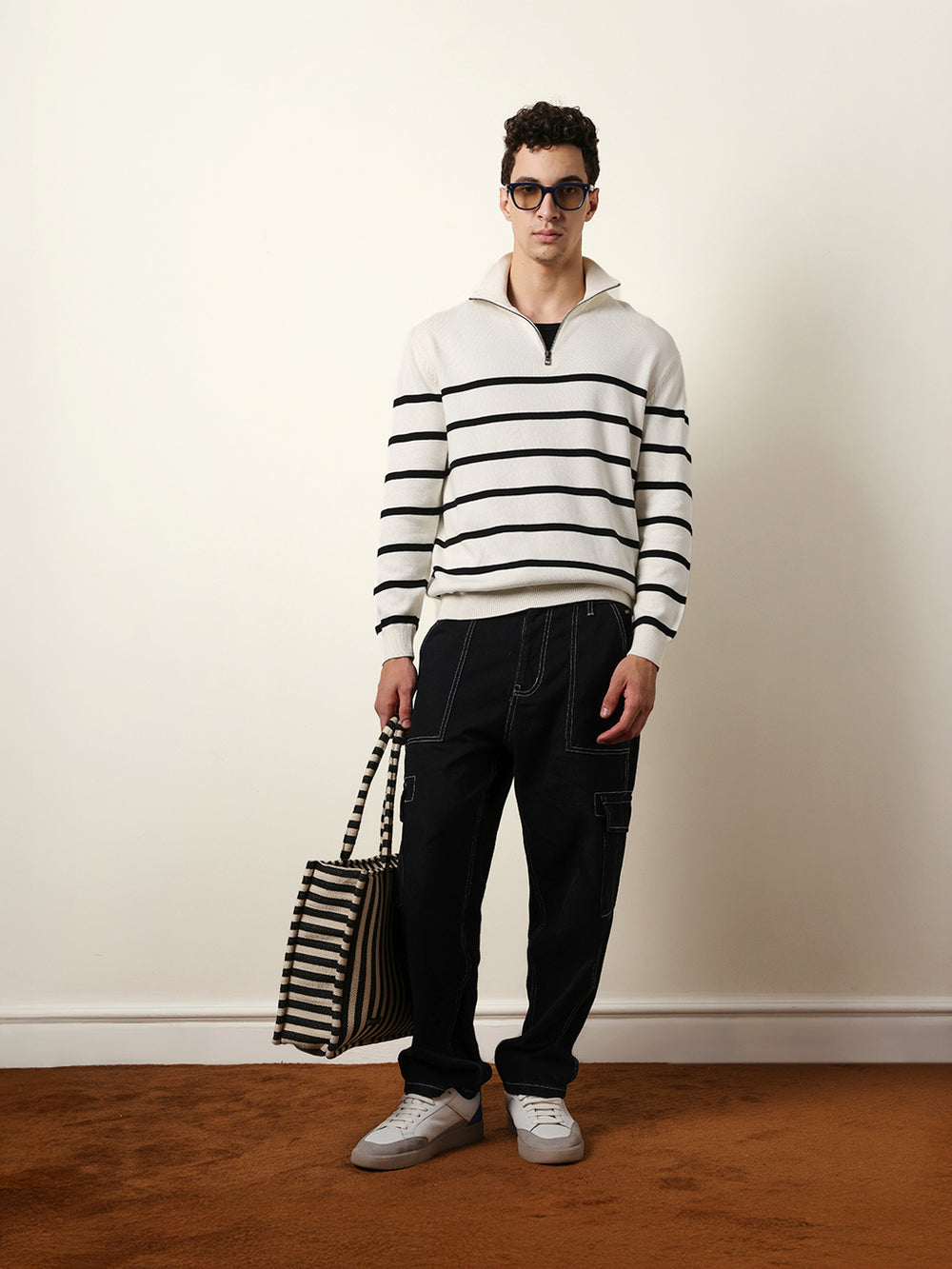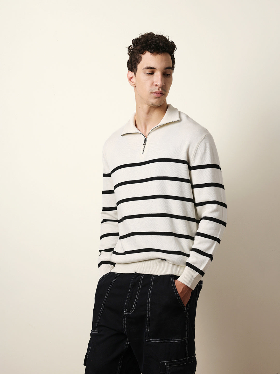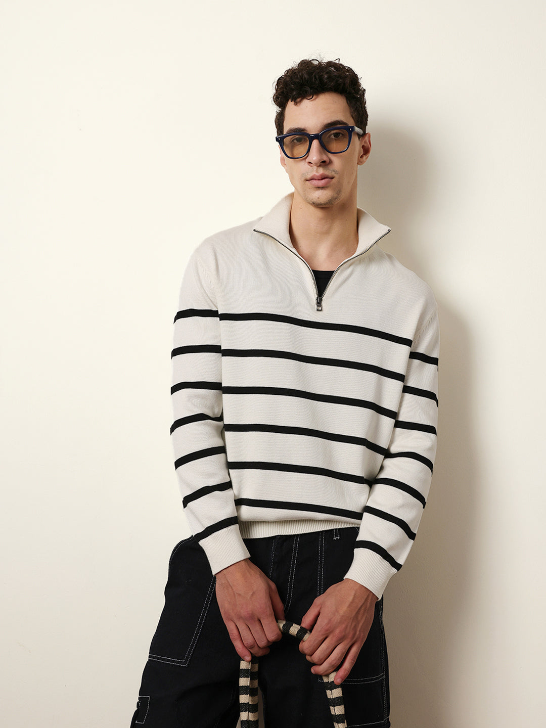 Shop White Relaxed Fit High-Neck Knitted Sweatshirt with Classic Stripe Design Online