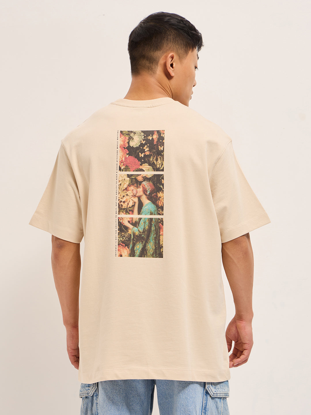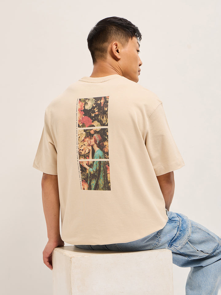 Beige Oversized T-Shirt with Artistic Graphic Print on Back