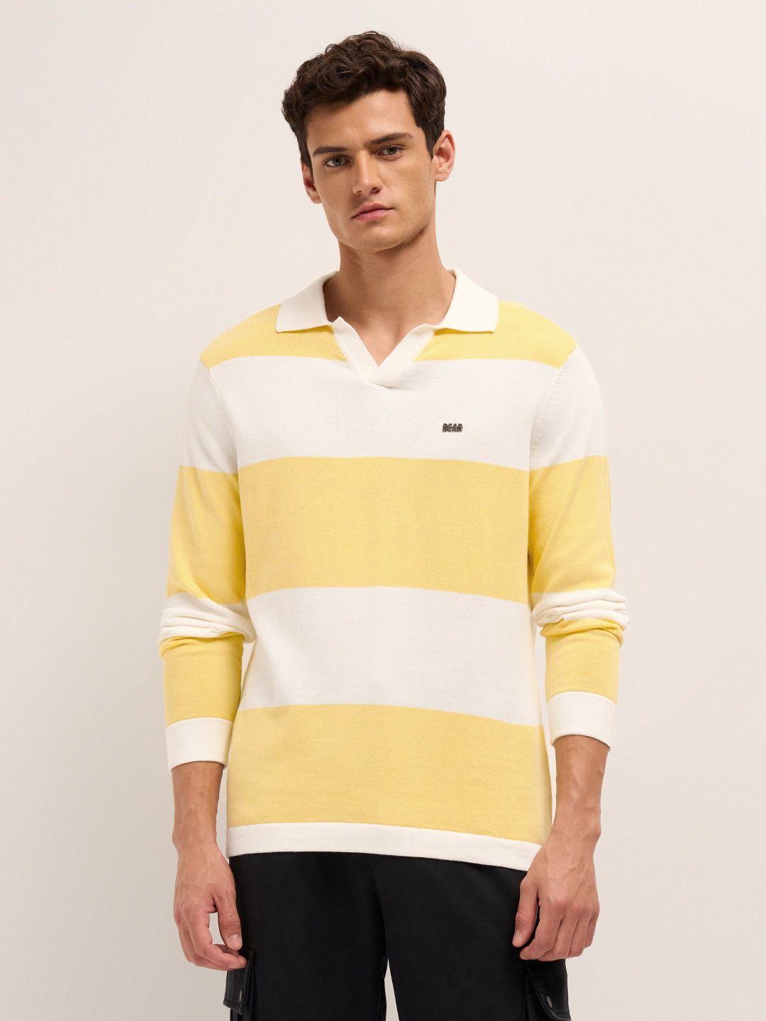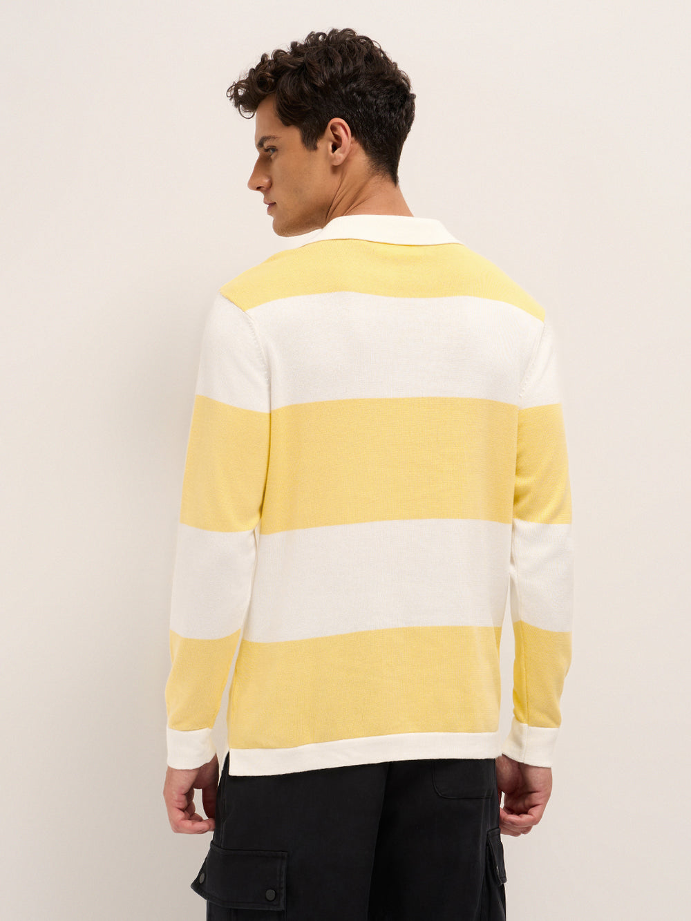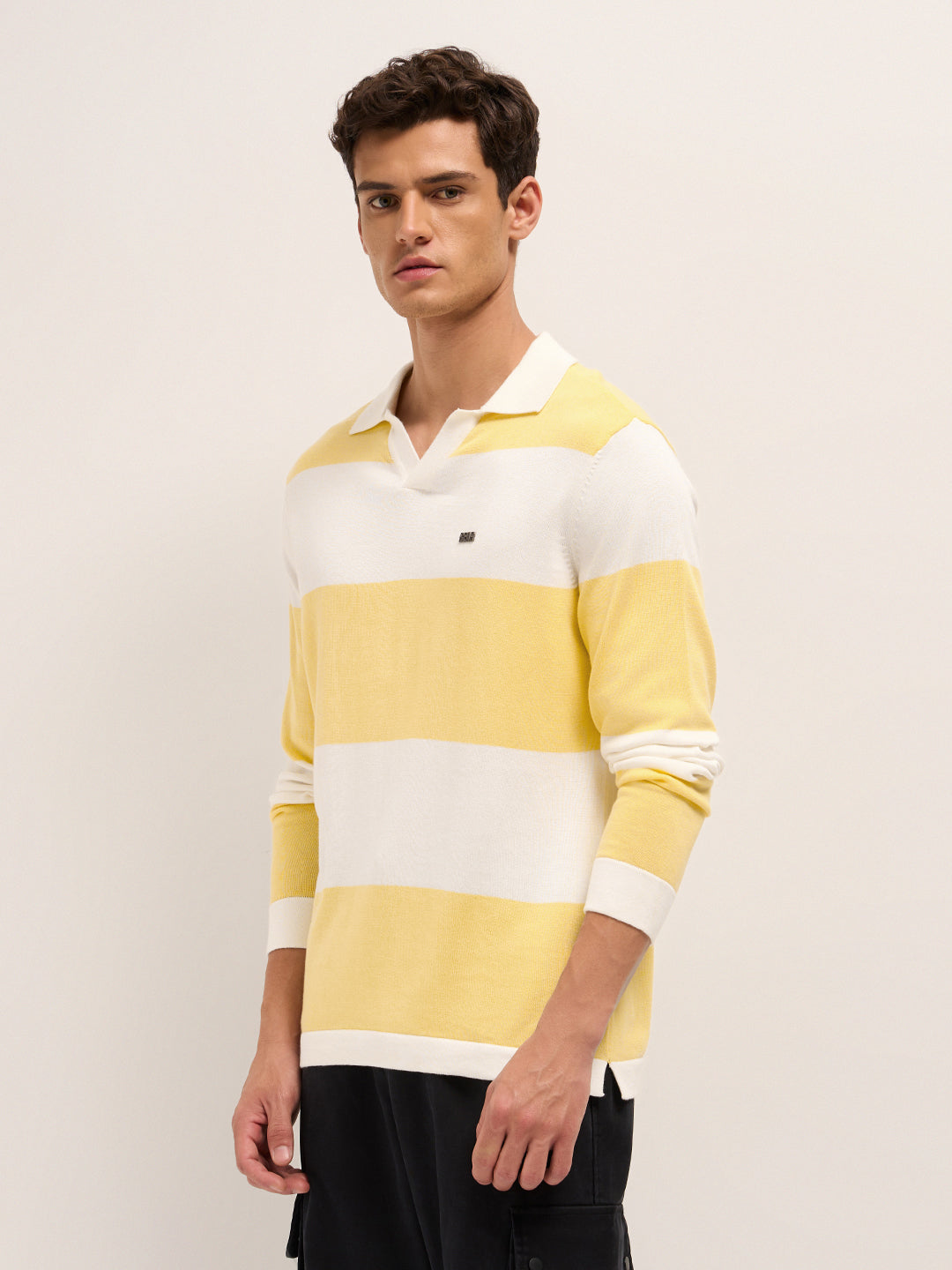 Shop Yellow & White Bold Striped Regular Fit Long Sleeve Polo Online.