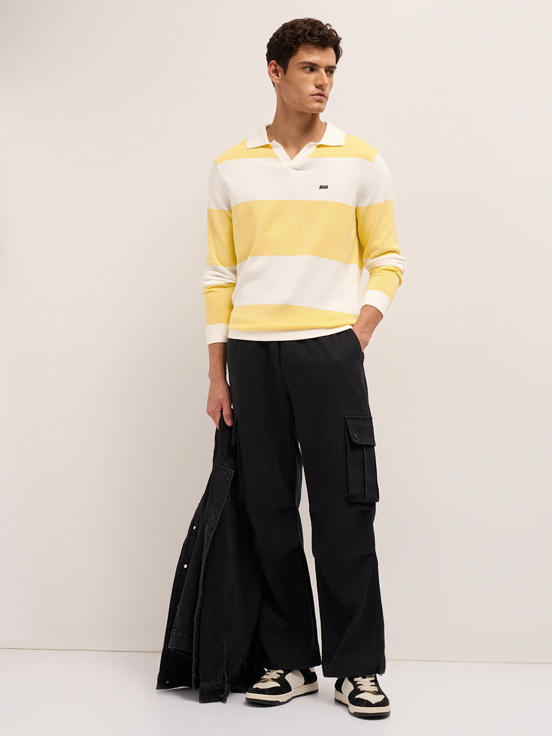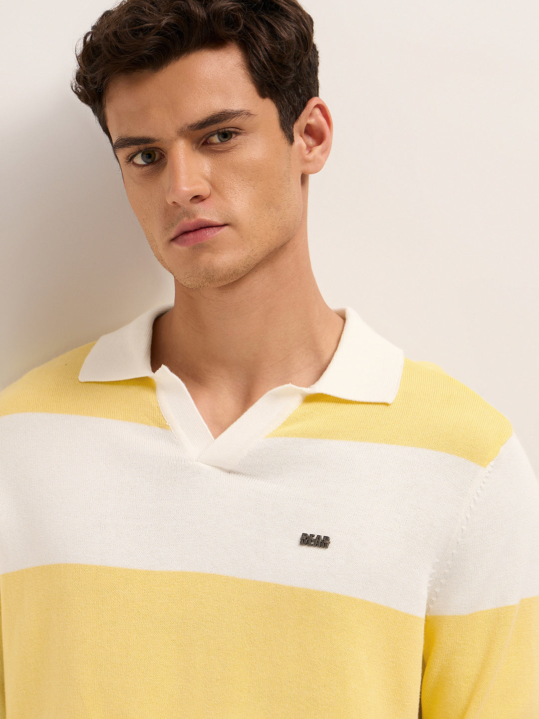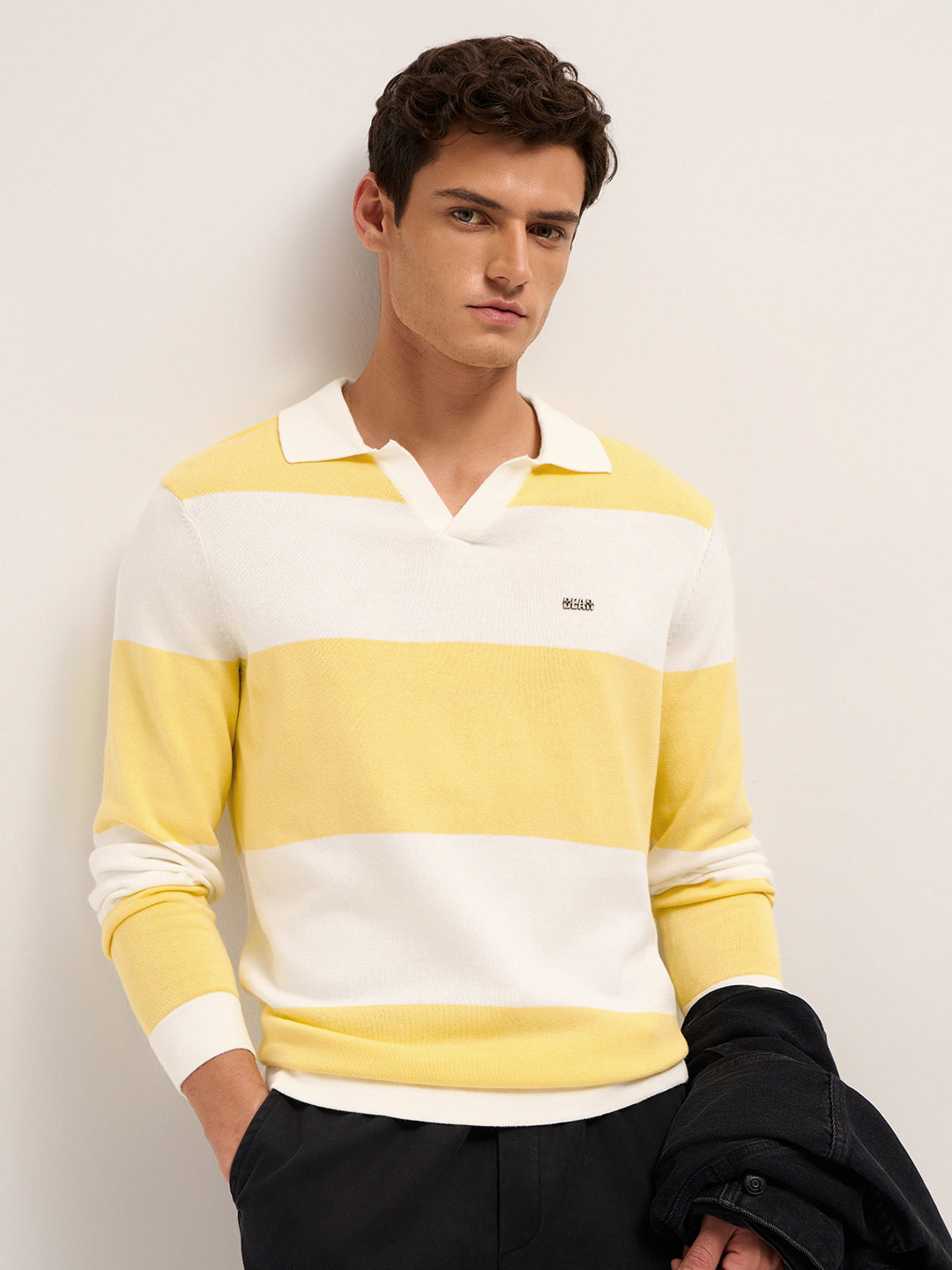 Shop Yellow & White Bold Striped Regular Fit Long Sleeve Polo Online.