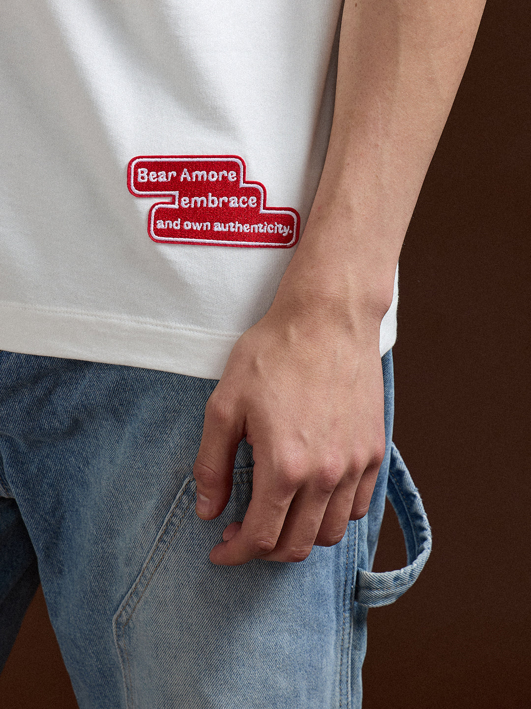 - Front Design: Small embroidered "Bear Amore" patch near the hemline