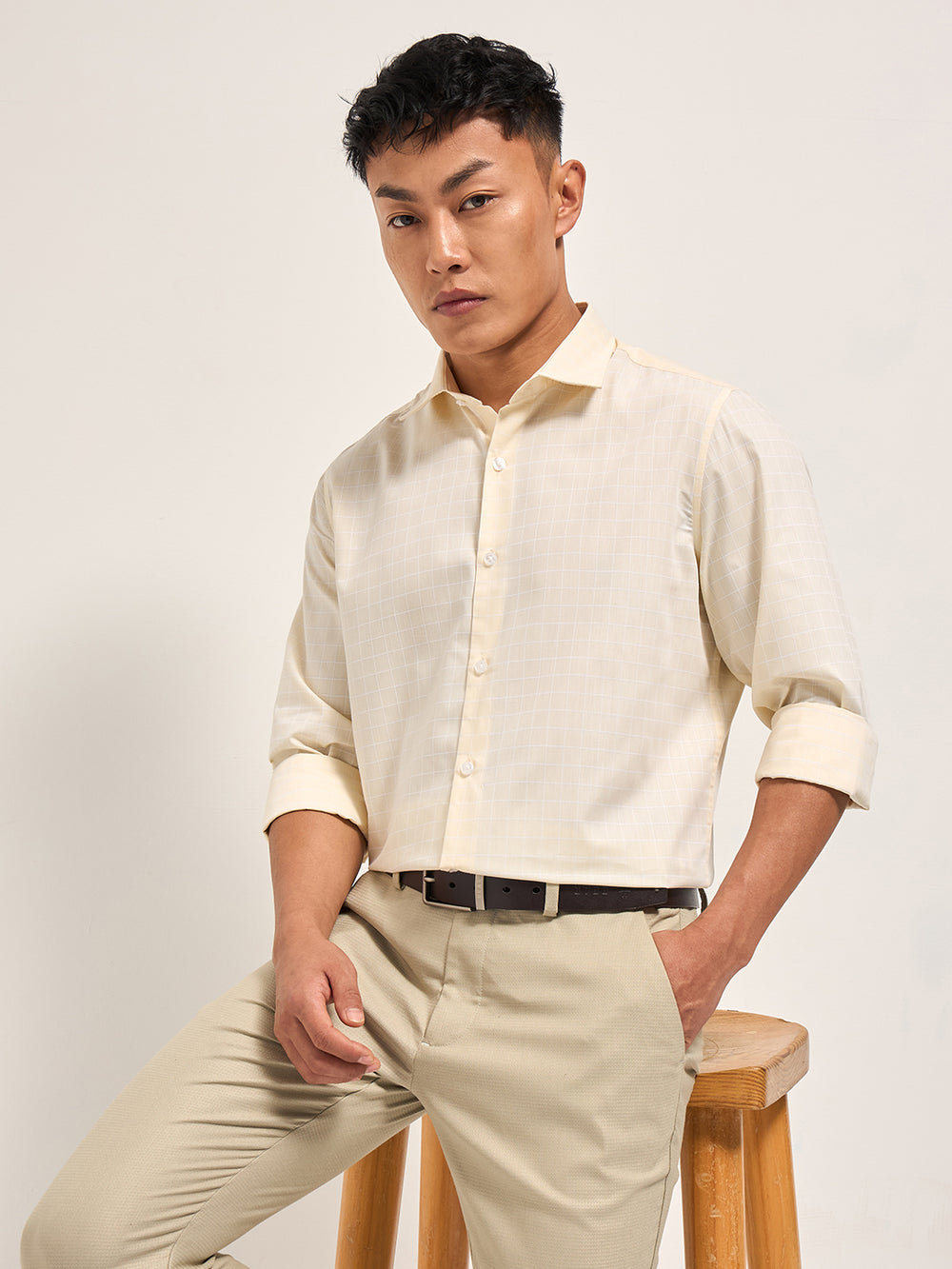 Cream Windowpane Checks Tailored Fit Formal Shirt