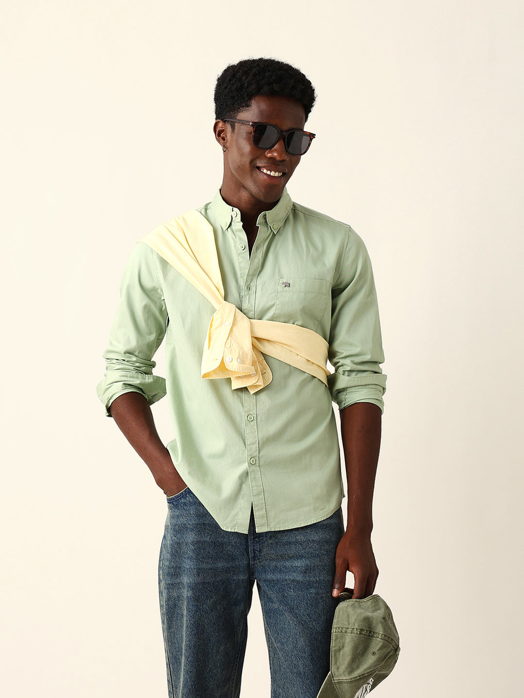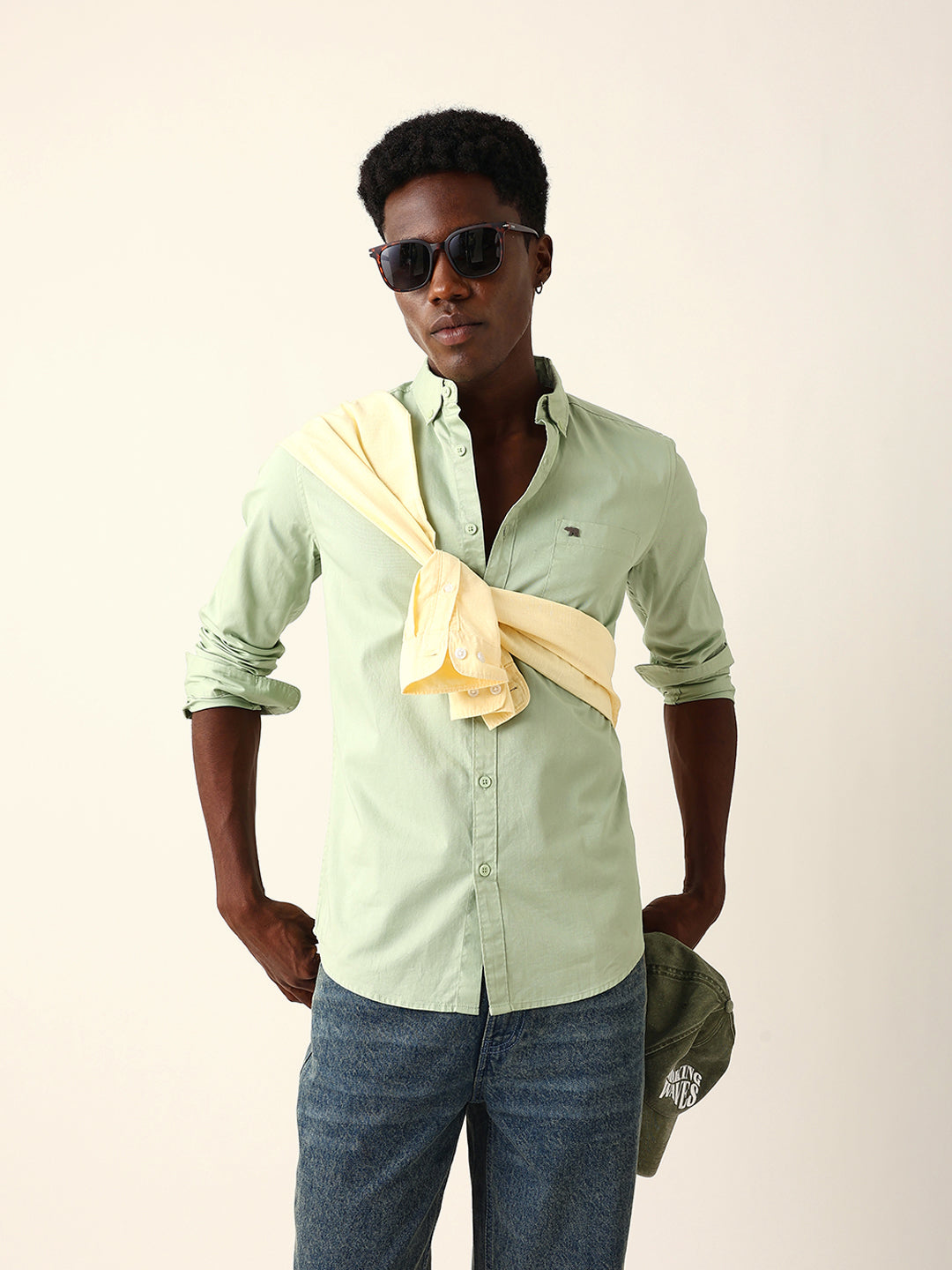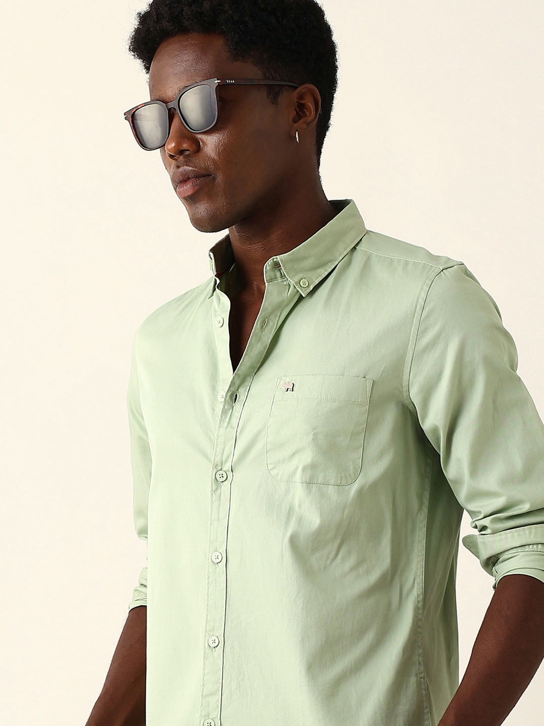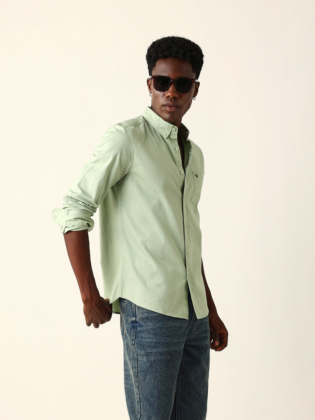 Light Green Solid Slim-Fit Casual Shirt with Button-Down Collar