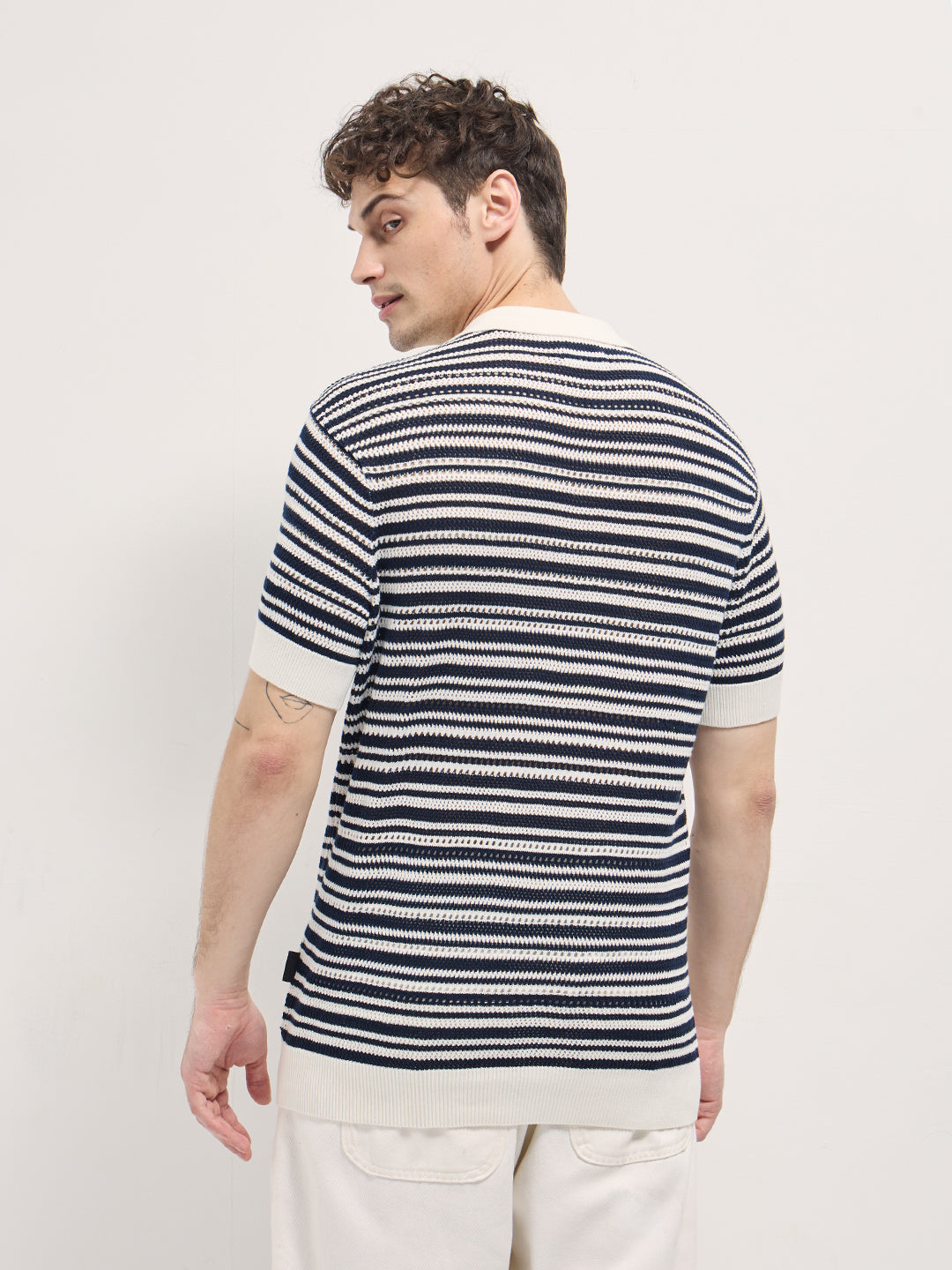Navy & White Horizontal Striped Textured Knit Design Regular Fit Polo